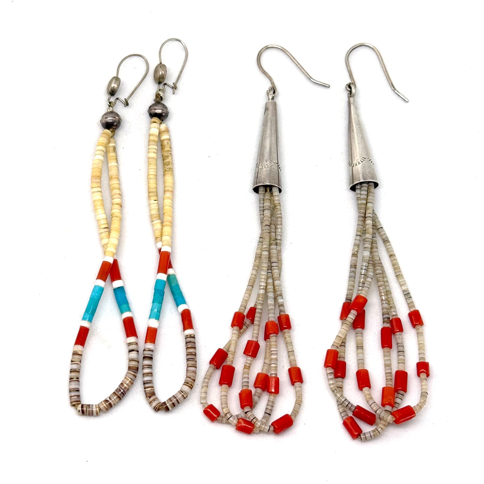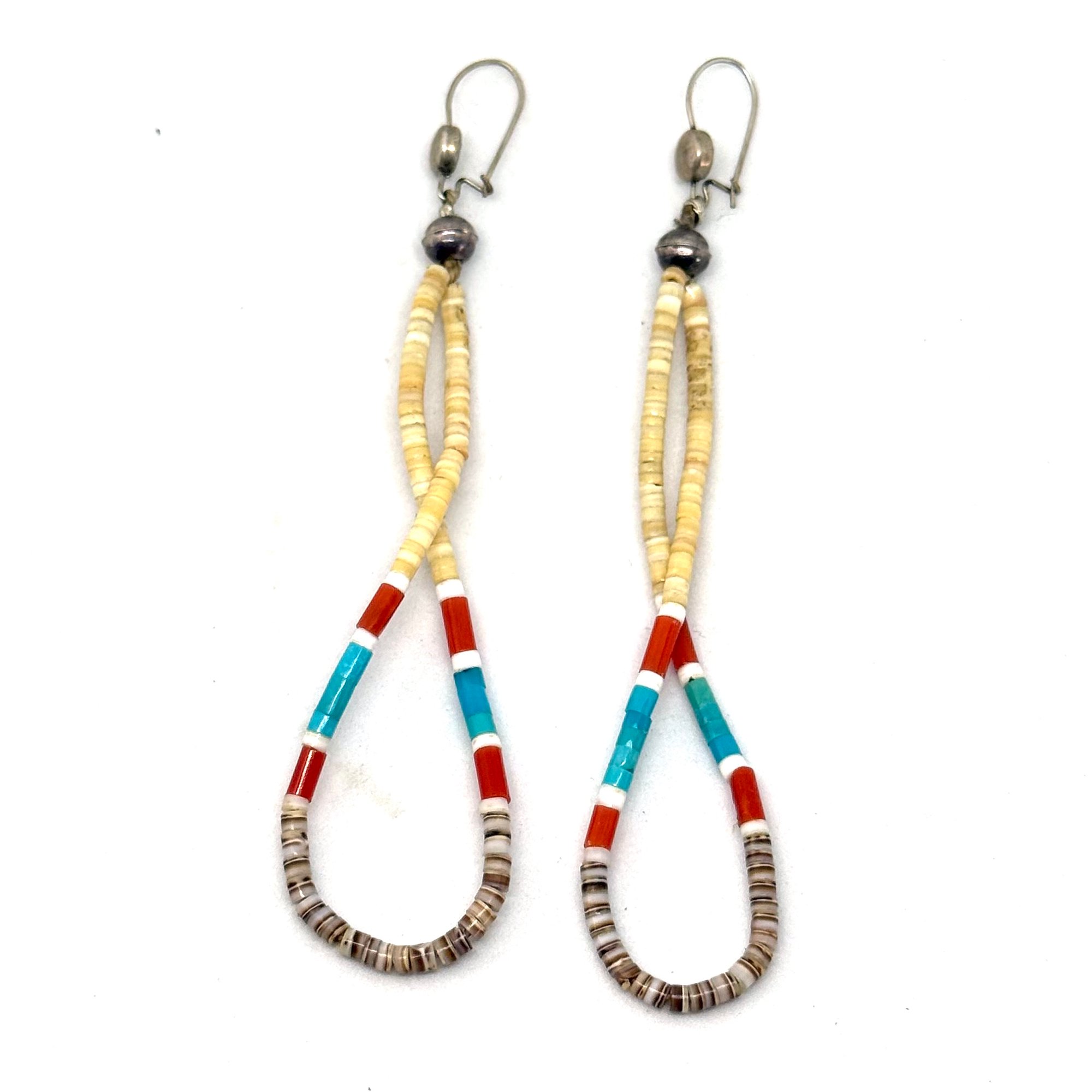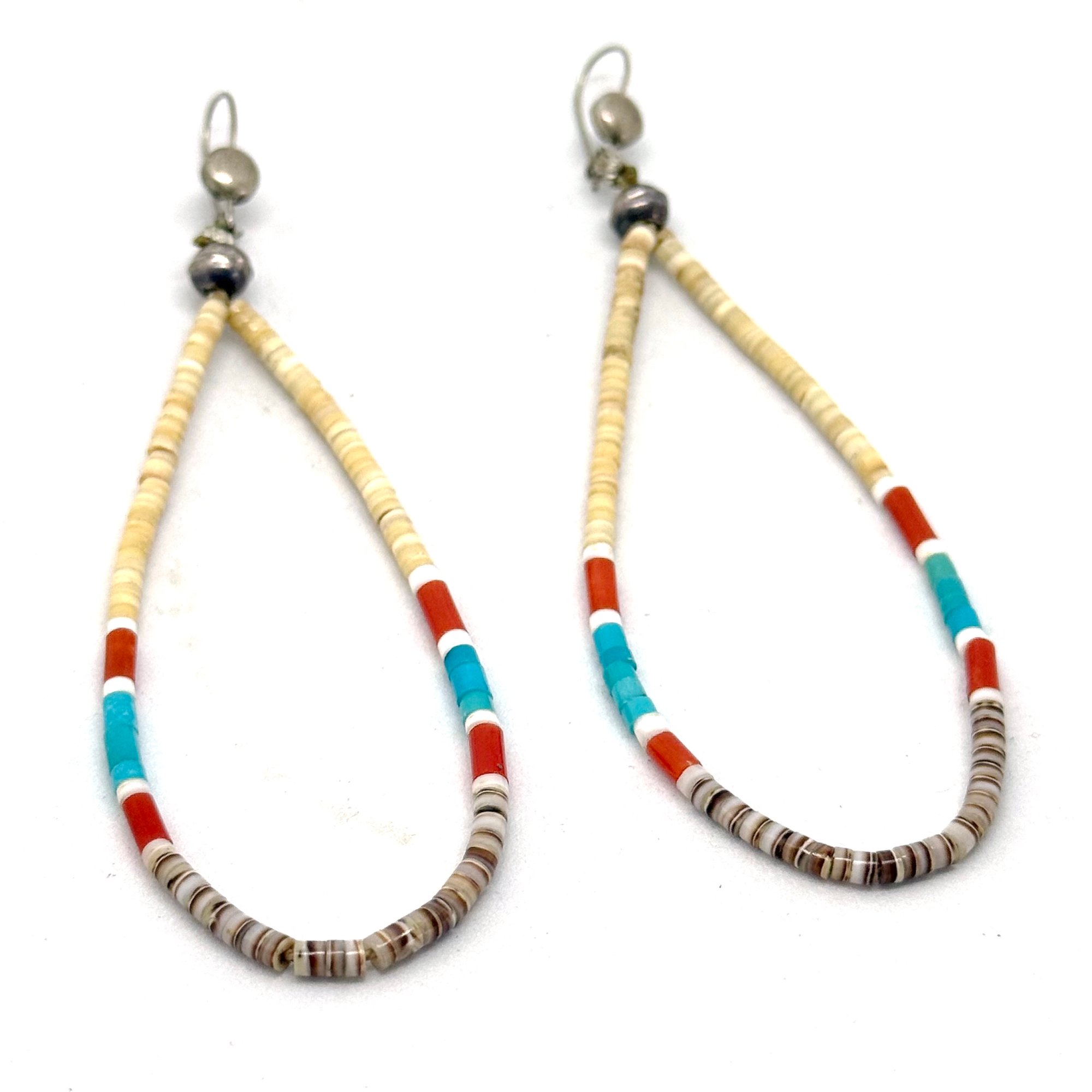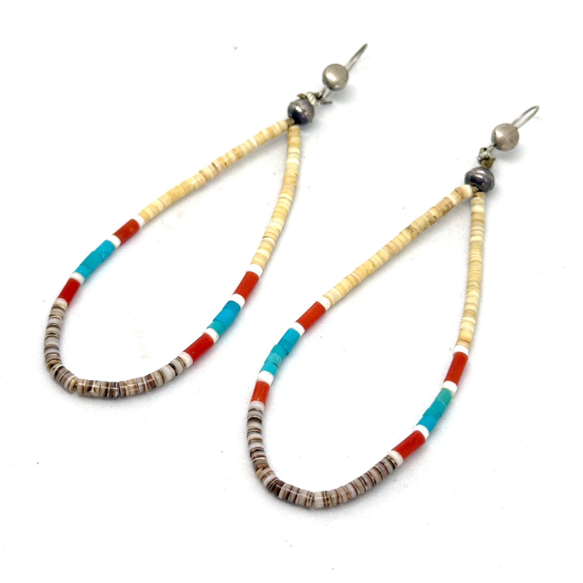 These sleek jacla earrings feature tiny heishi beads made of natural shell, bright orange-red coral, and rich turquoise with bright white shell accents strung on loops with sterling silver hooks.