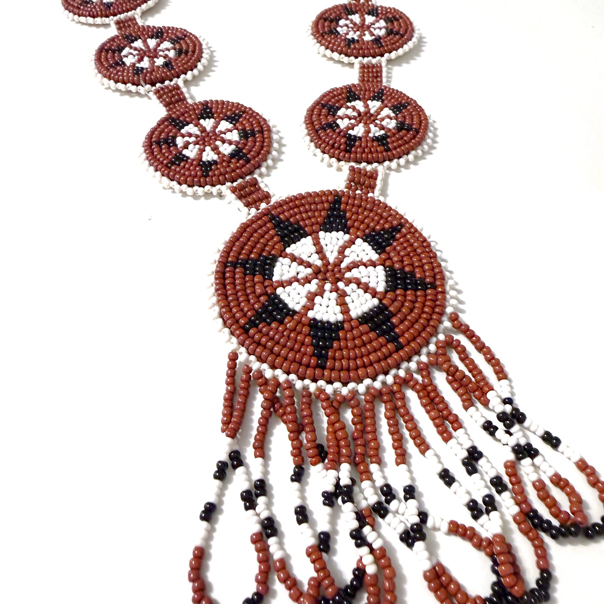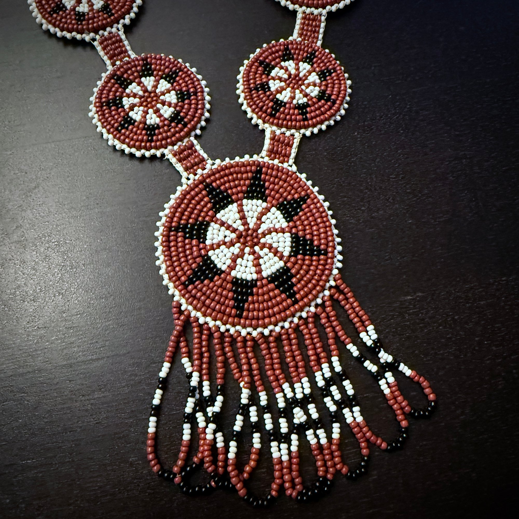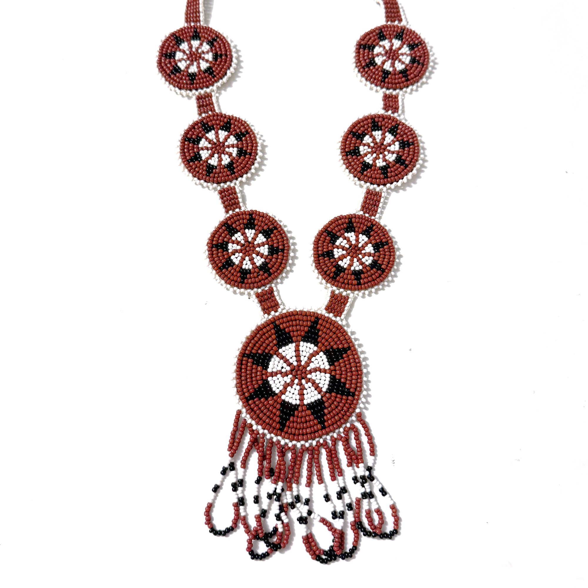 This intricately beaded necklace features seven circle medallions made with size 12 beads in brick red and opaque white with black accents.