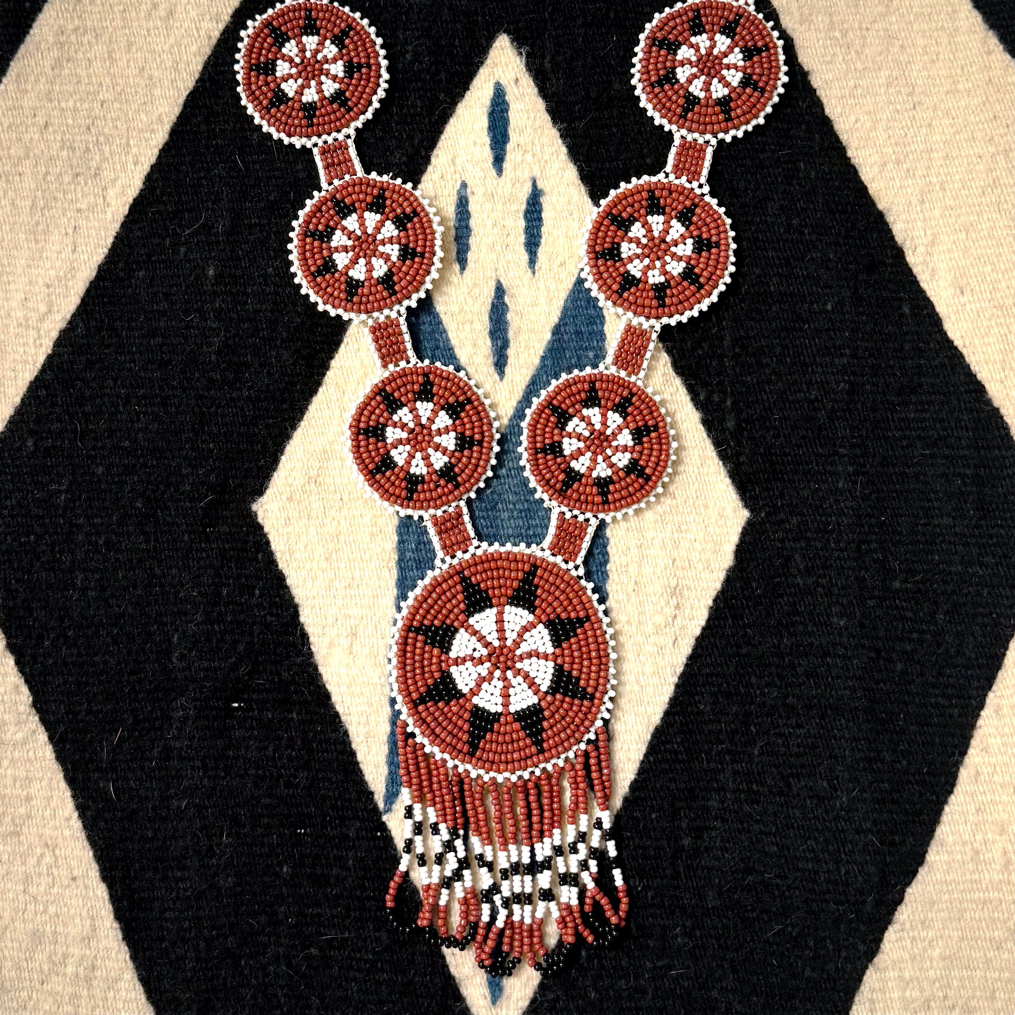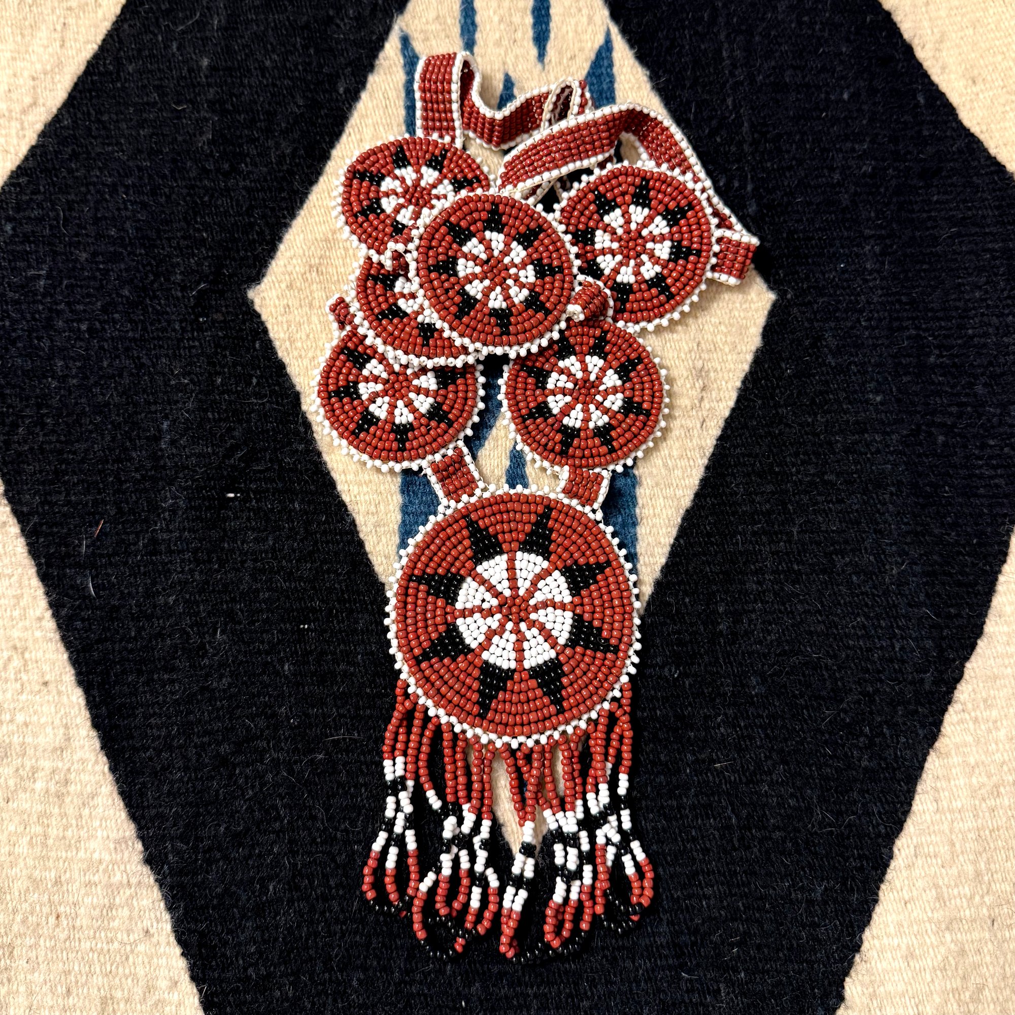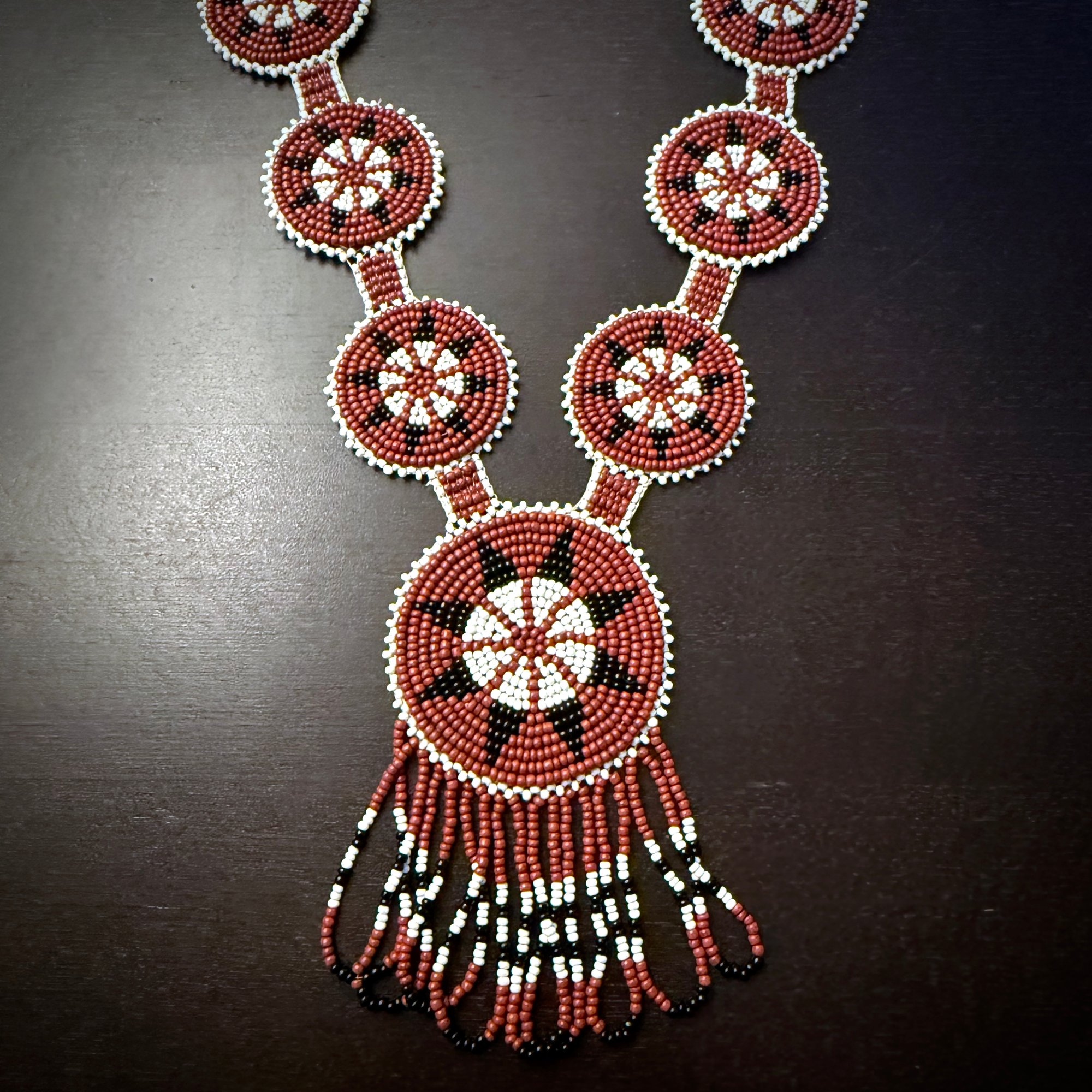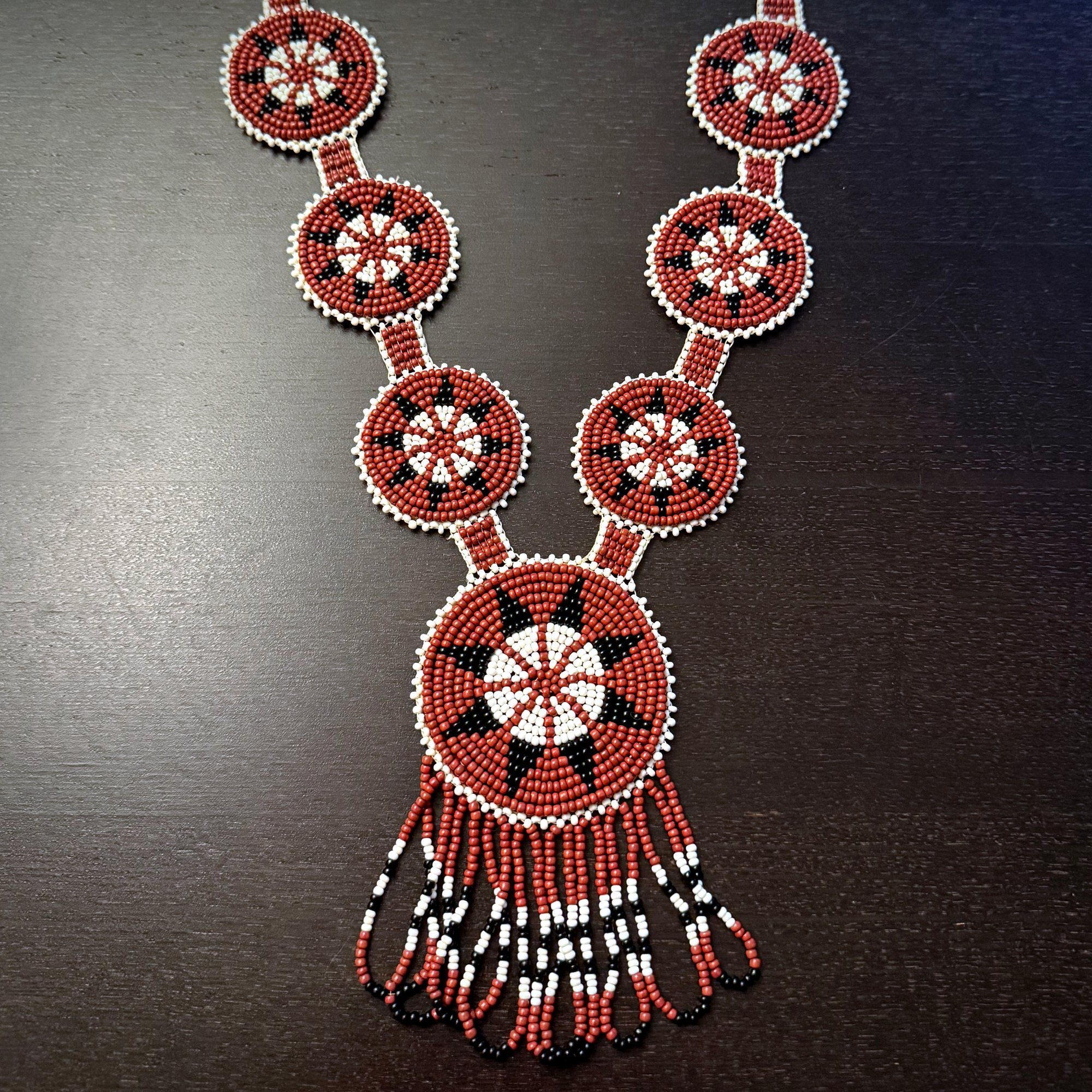 This intricately beaded necklace features seven circle medallions made with size 12 beads in brick red and opaque white with black accents.