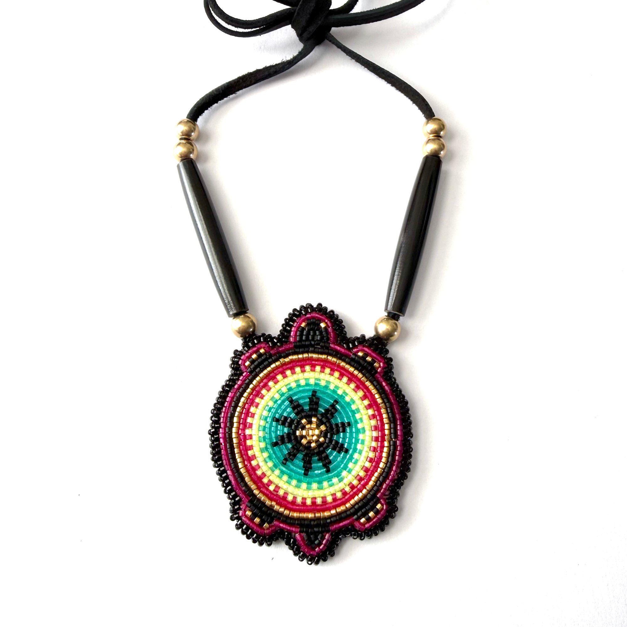 This pendant necklace was made by Jessica R. Metcalfe (Turtle Mountain Chippewa). It features sparkling Delicas beaded into a shape of a mikinaak (turtle).