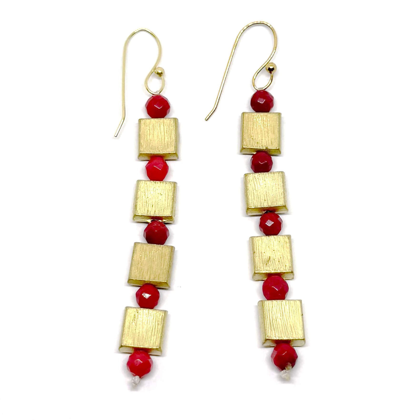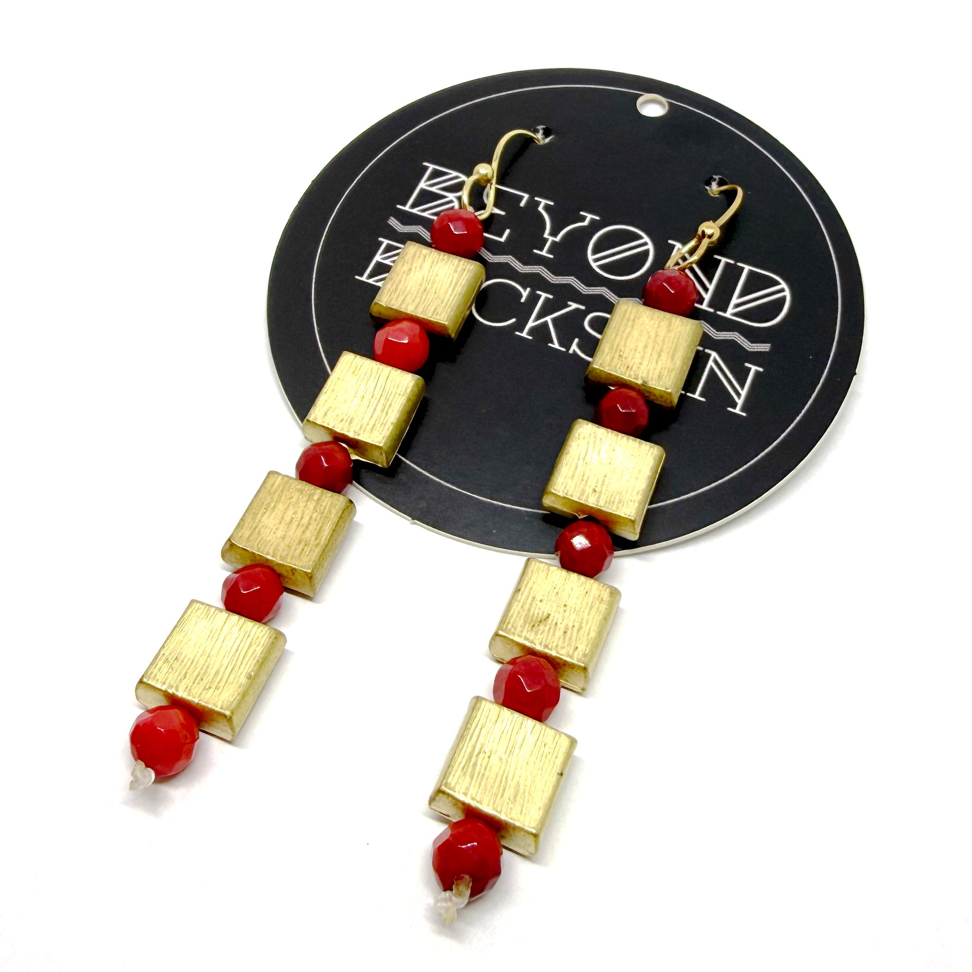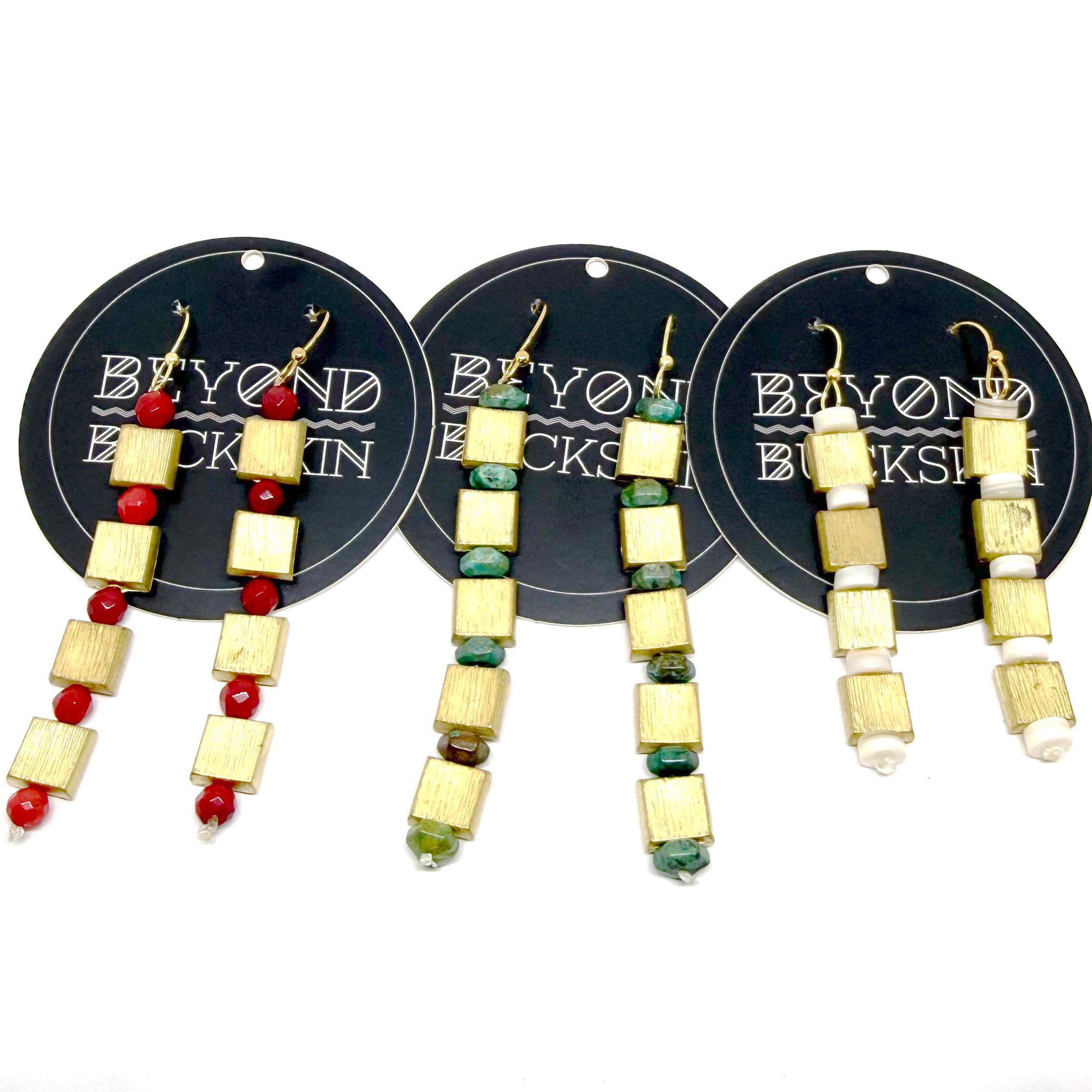 These earrings feature gold brushed brass blocks accented with stunning faceted red coral beads. Designed and made by Beyond Buckskin owner Jessica R. Metcalfe (Turtle Mountain Chippewa).