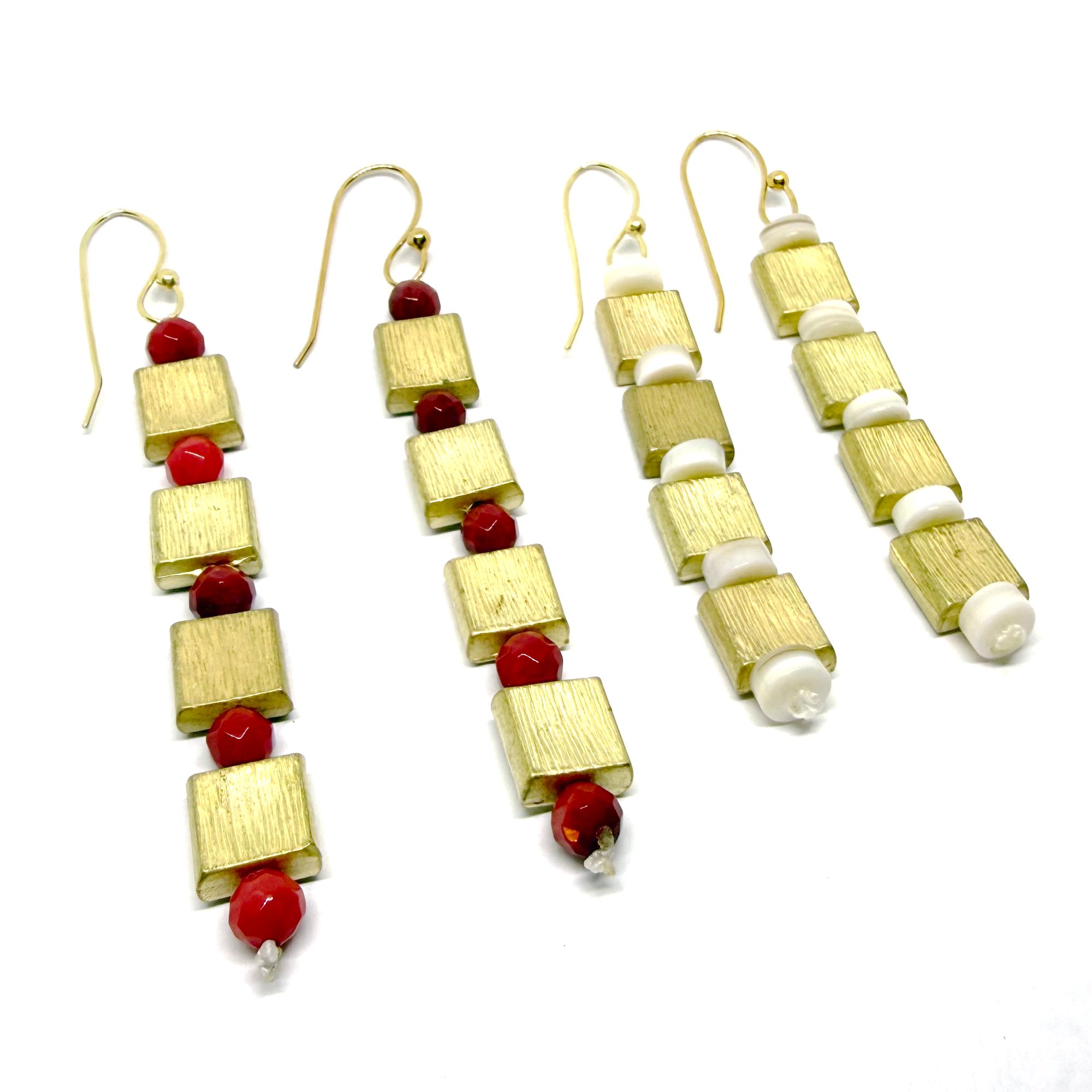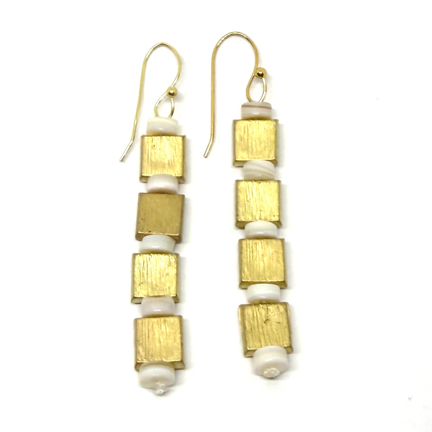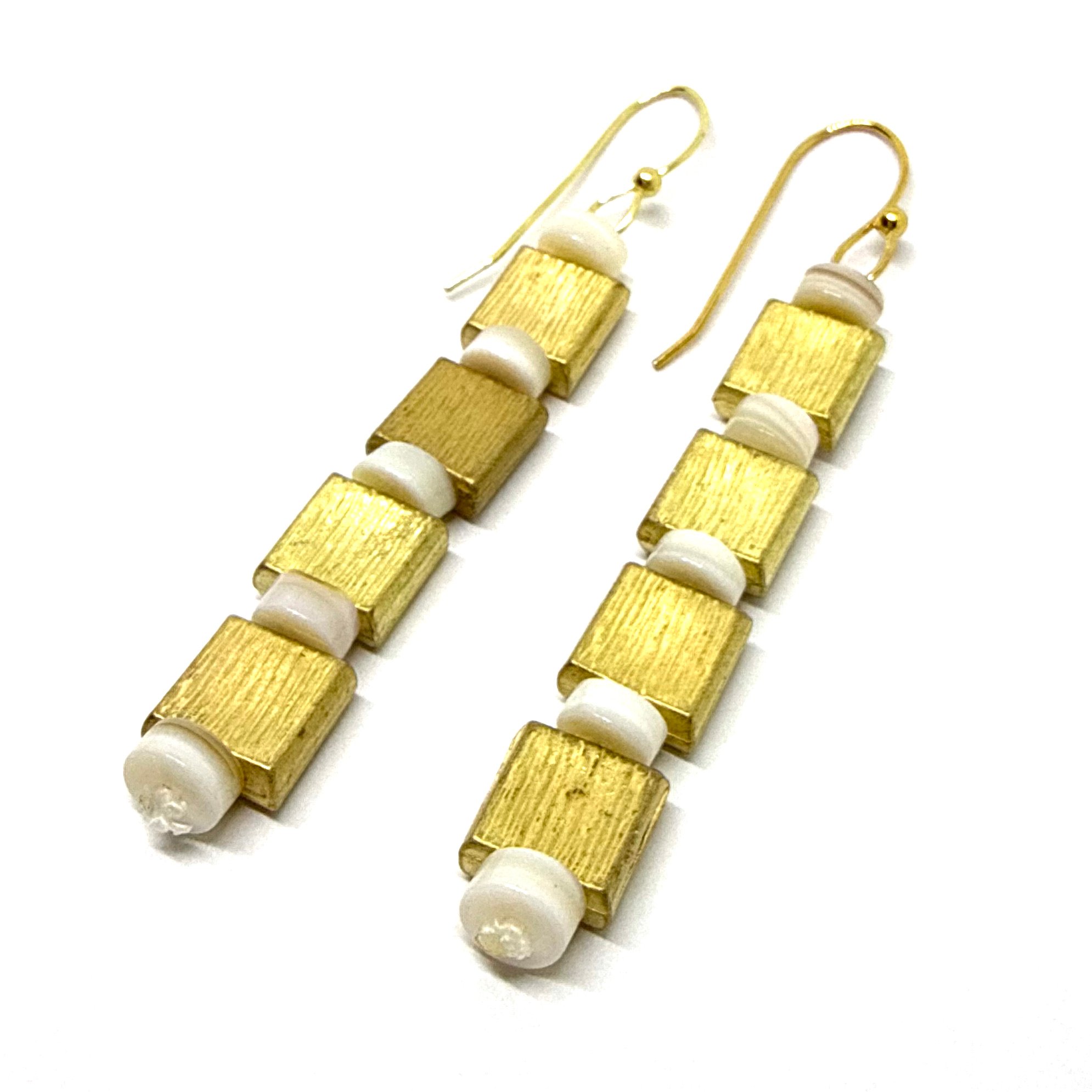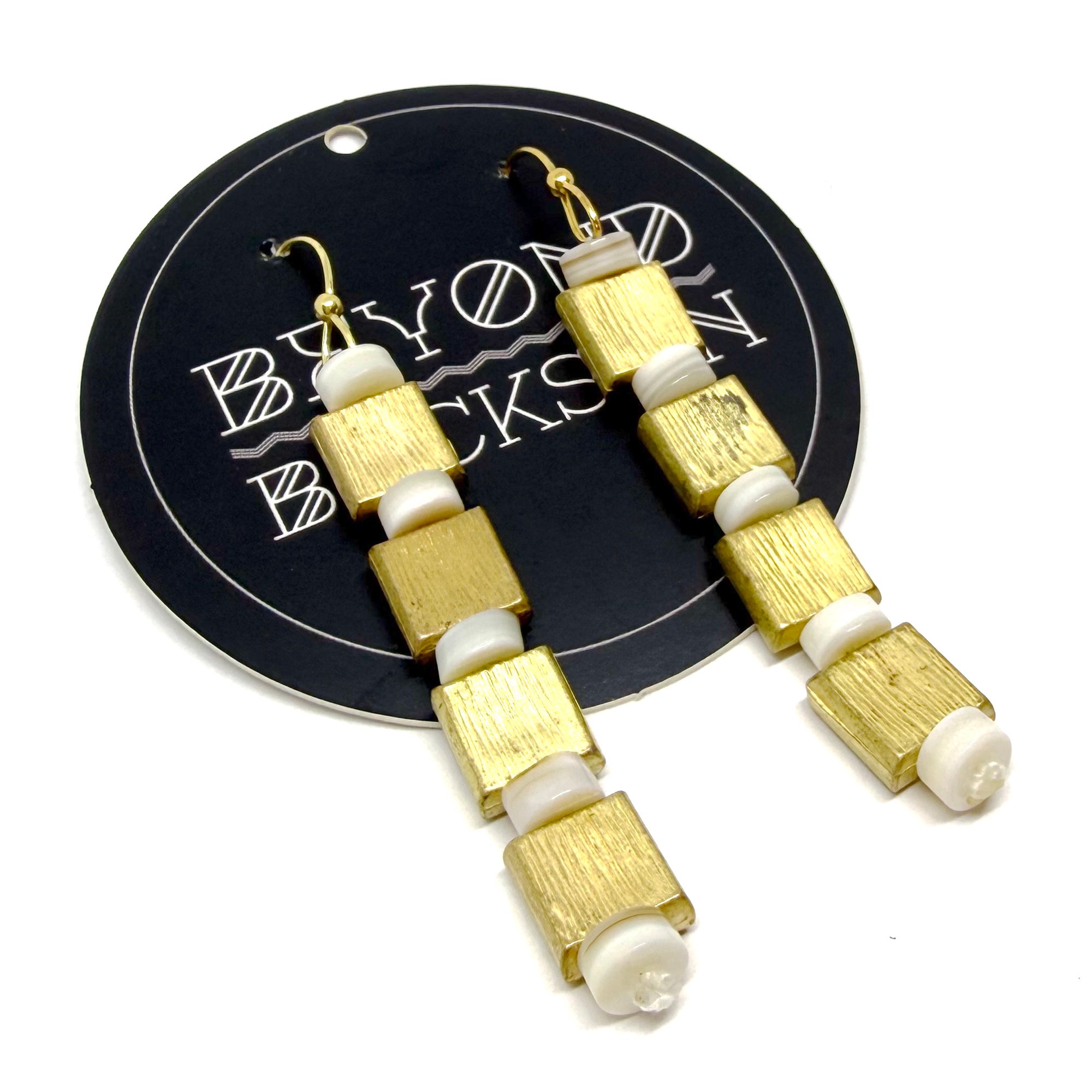 These earrings feature gold brushed brass blocks accented with thick white mother of pearl shell heishi disc beads. Designed and made by Beyond Buckskin owner Jessica R. Metcalfe (Turtle Mountain Chippewa).
