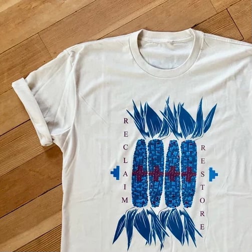 The artist explains the design: "My grandparents took care of a few acres of corn fields and squash fields in a hand built cabin near Shonto on the Navajo Rez. My family would walk the rows of corn, pick the fully grown ones, and toss them in the back of my dad's truck. We'd fill his truck bed multiple times easily and go through the processes of steaming corn through the mud oven we built, or roasting corn over a fire, or grinding corn to make kneel down bread. This process showed me the pride my grandparents had in maintaining their land for us all to feed ourselves.It was a selfless act, they even allowed neighboring houses to drive their trucks and fill their truck beds at no cost. I could tell they enjoyed our help, and were proud we were interested in learning and spending time with them. Food is what brought us together and what taught us hard work. We were independent by growing food that loved us back, nothing packed with sugar or preservatives that looks to endanger our health. Through this design I've shown blue corn at harvest season and included the words "RECLAIM" and "RESTORE" to show the strength of food sovereignty."