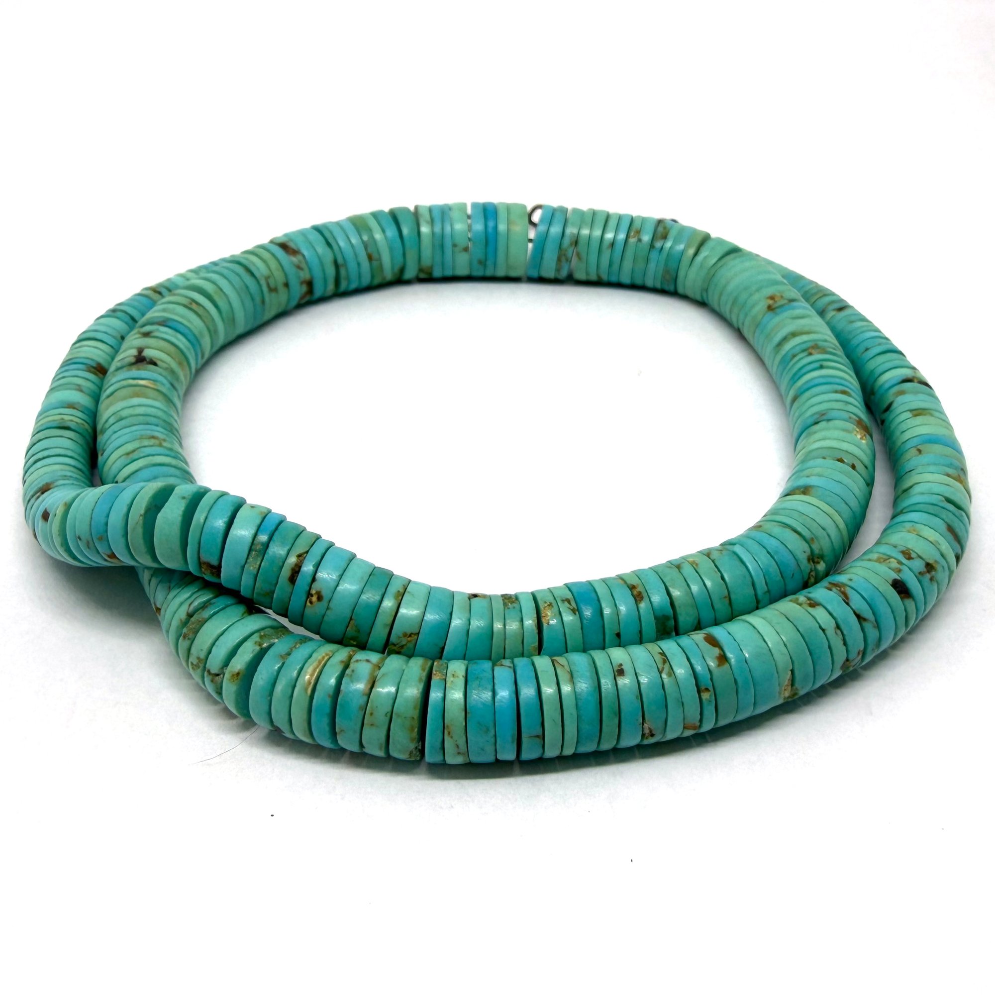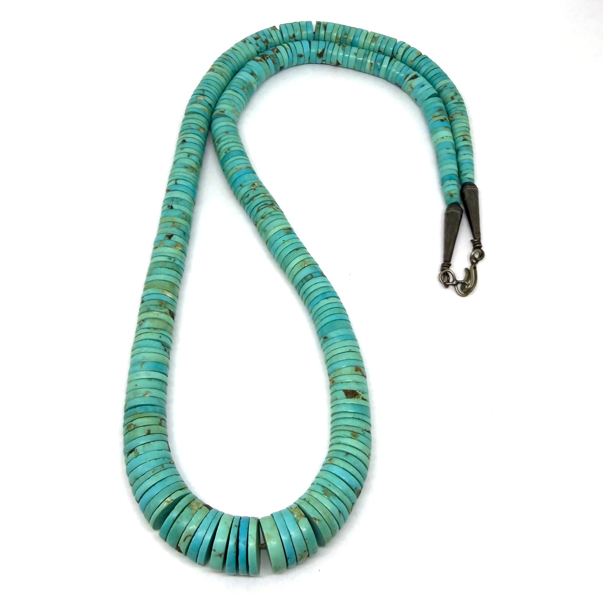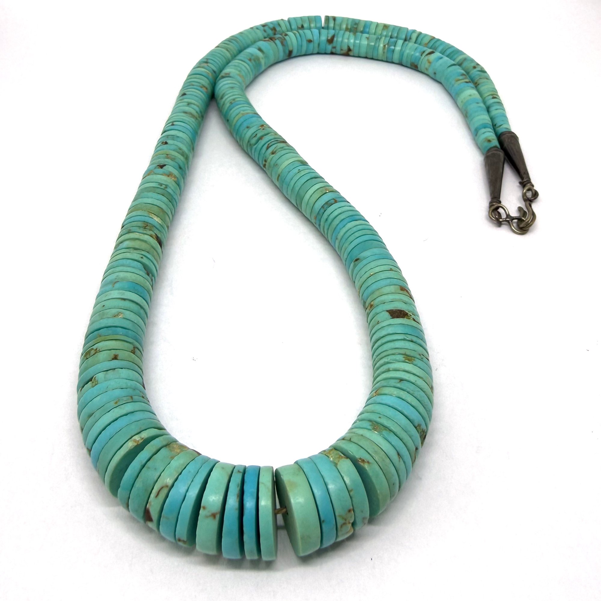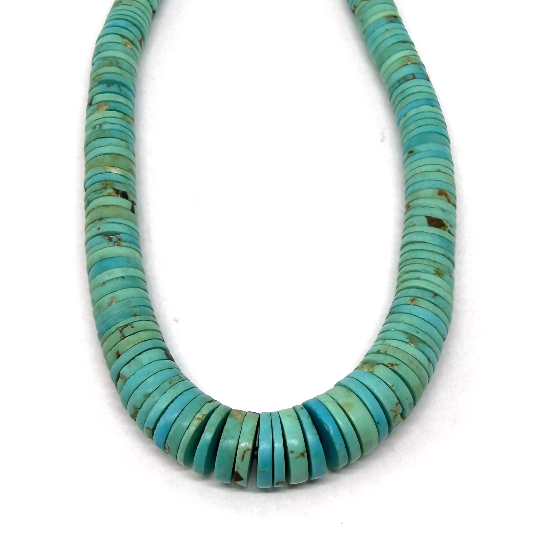 This stunning necklace features ultra-thin turquoise stone heishi beads arranged to gradually increase in size toward the center creating a natural focal point. It is a great length with wonderful hues to become a staple for your jewelry collection. It measures 24" long with a silver hook closure.