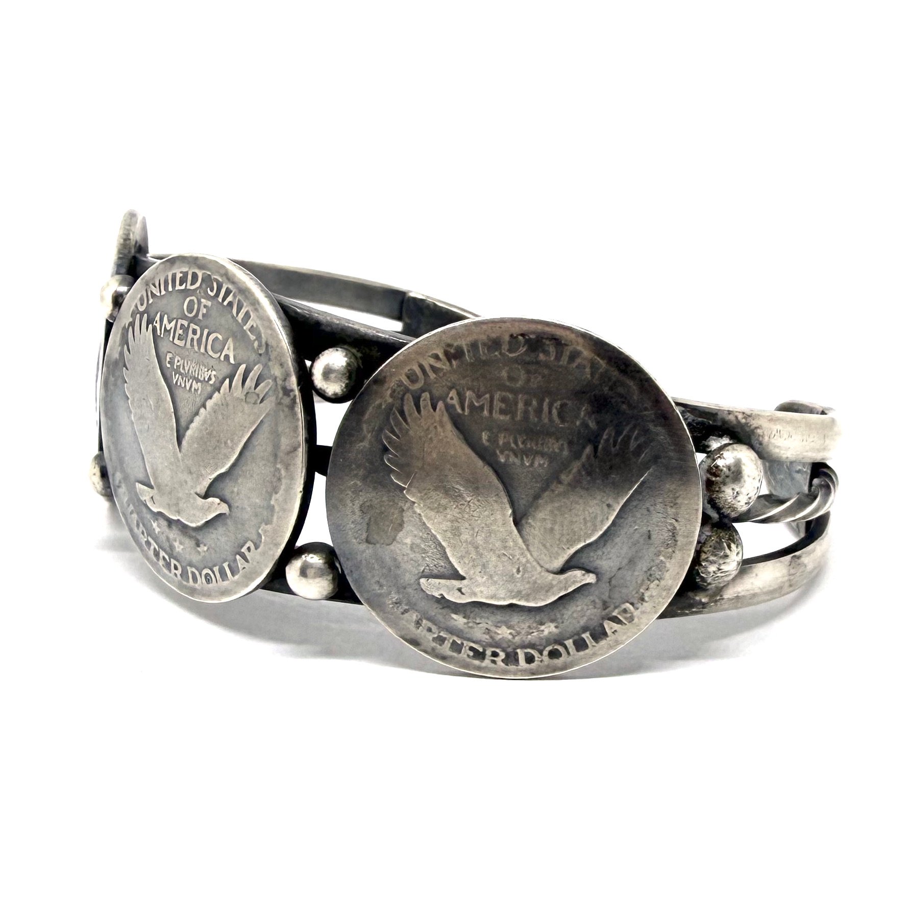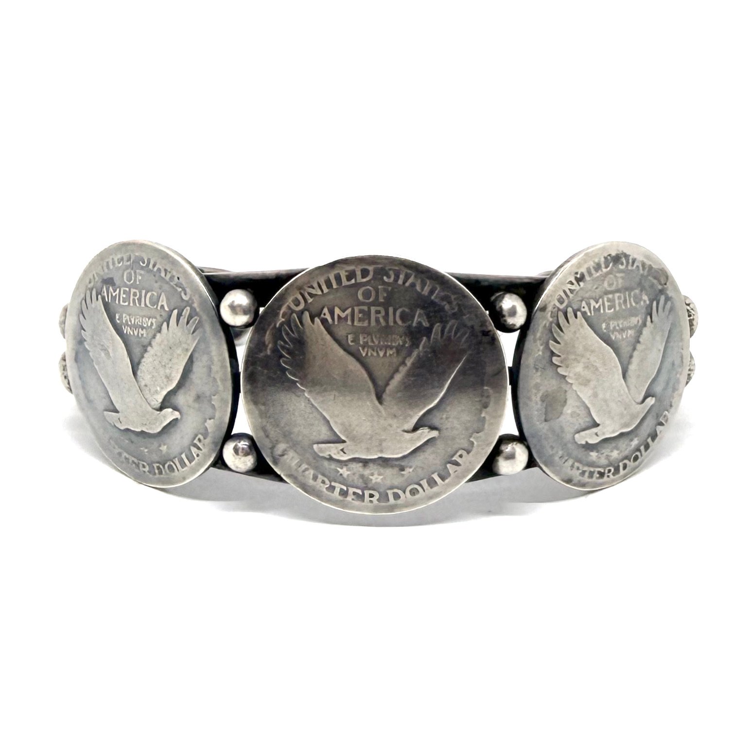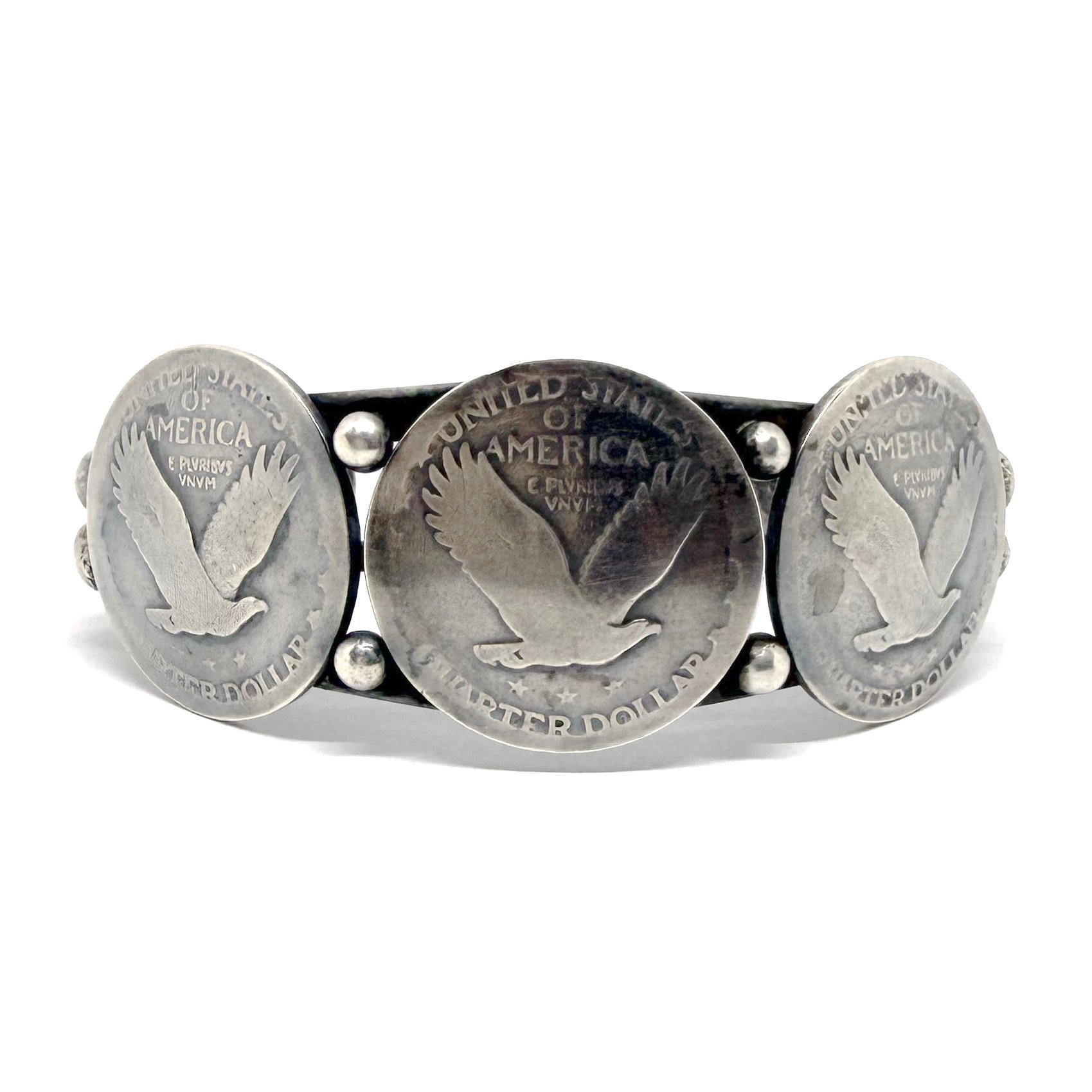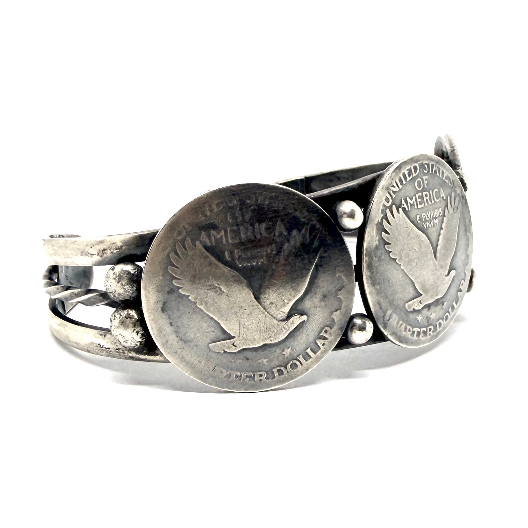 This ultra-cool vintage cuff by Taos artist Lawrence Archuleta features three rare Standing Liberty Quarters transformed into a distinctive piece of wearable art. The original coin details are artfully shaped and preserved, creating a textured surface rich with character and historic appeal. A striking bracelet that blends heritage, artistry, and timeless style.