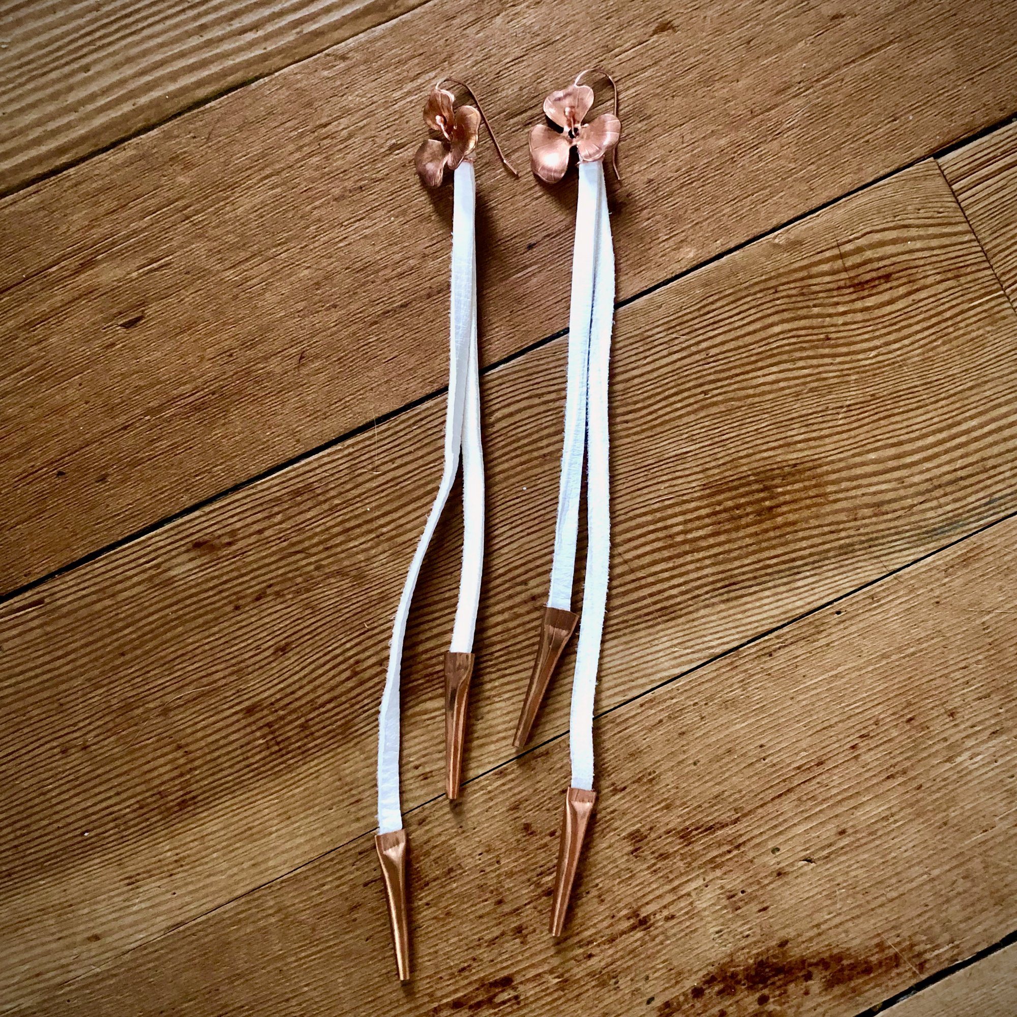 The extra-long earrings feature repurposed vintage copper flowers accented with flowing white deer skin lace, finished with copper cones. The lightweight earrings hang on copper ear hooks, for a bold yet delicate addition to your style.