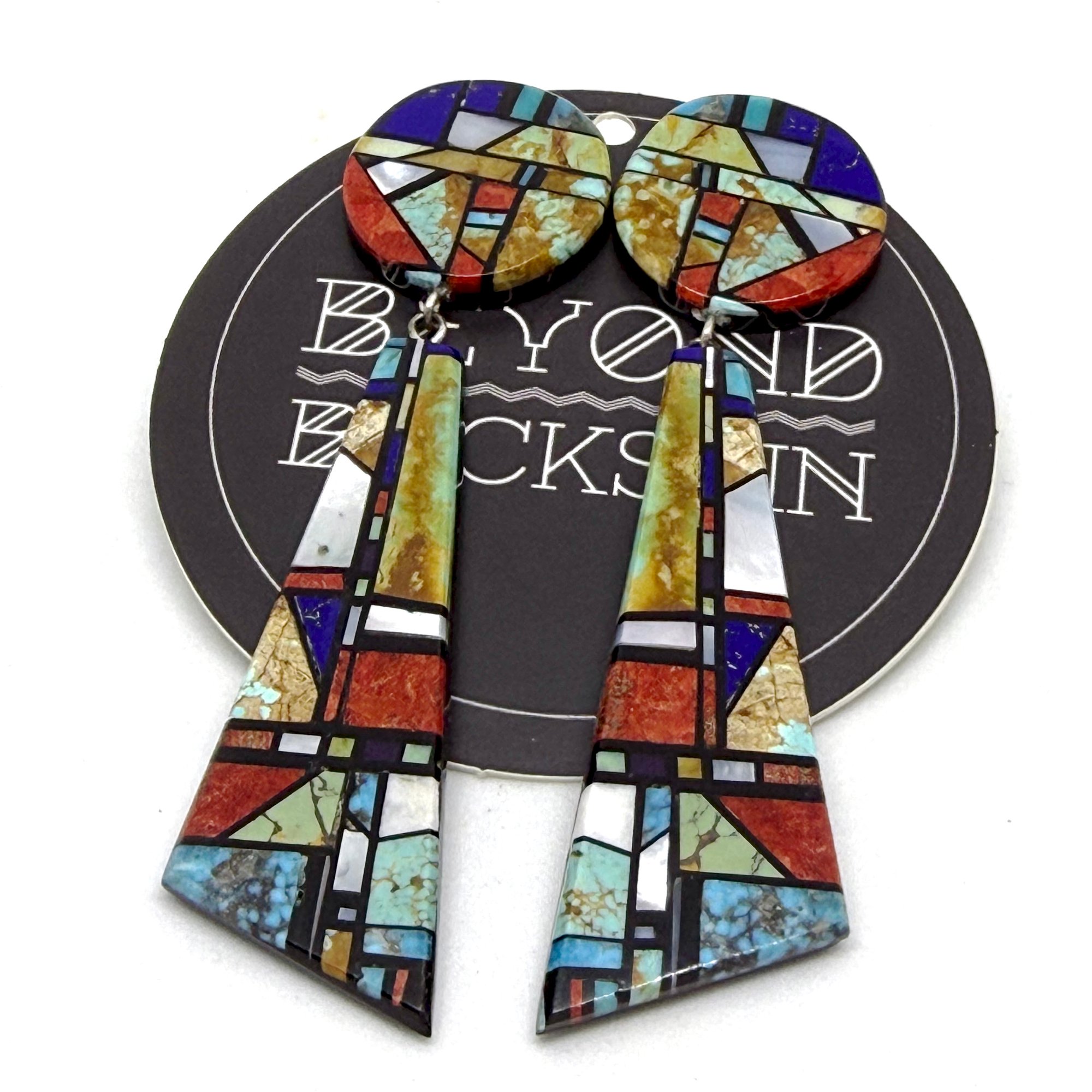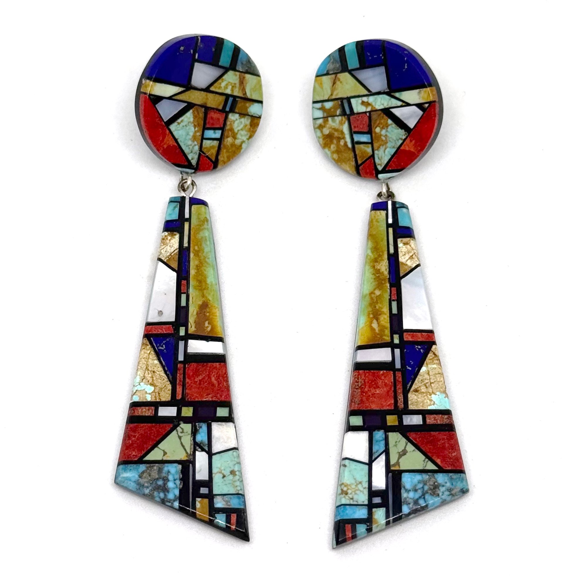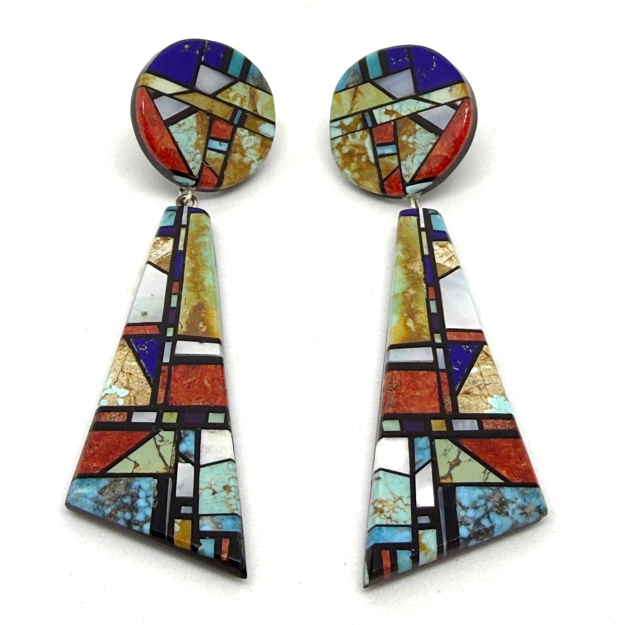 Wow. These spectacular statement earrings by Santo Domingo Pueblo artist Christopher Nieto feature intricate blocks of earthy green and watery blue turquoise, prestine white shimmering shell, bands of black jet, punctuated by accents of bright red coral and rich blue lapis inlaid on a jet slab backing. The large earrings measure 3.5" long x 1" wide.