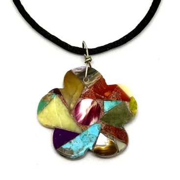 This pretty pendant by Santo Domingo Pueblo artist Chery Crespin features a colorful and artistic mosaic of bright turquoise, earthy serpentine, orange spiny oyster, creamy shell, red coral, shimmering abalone, and a creamy purple spiny oyster shell center piece inlaid on a mother of pearl shell slab. It measures 1.5" wide and hangs on an adjustable black cord necklace.
