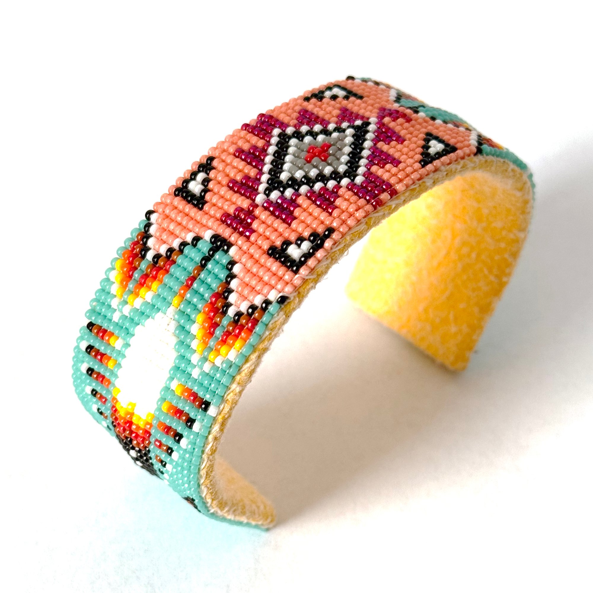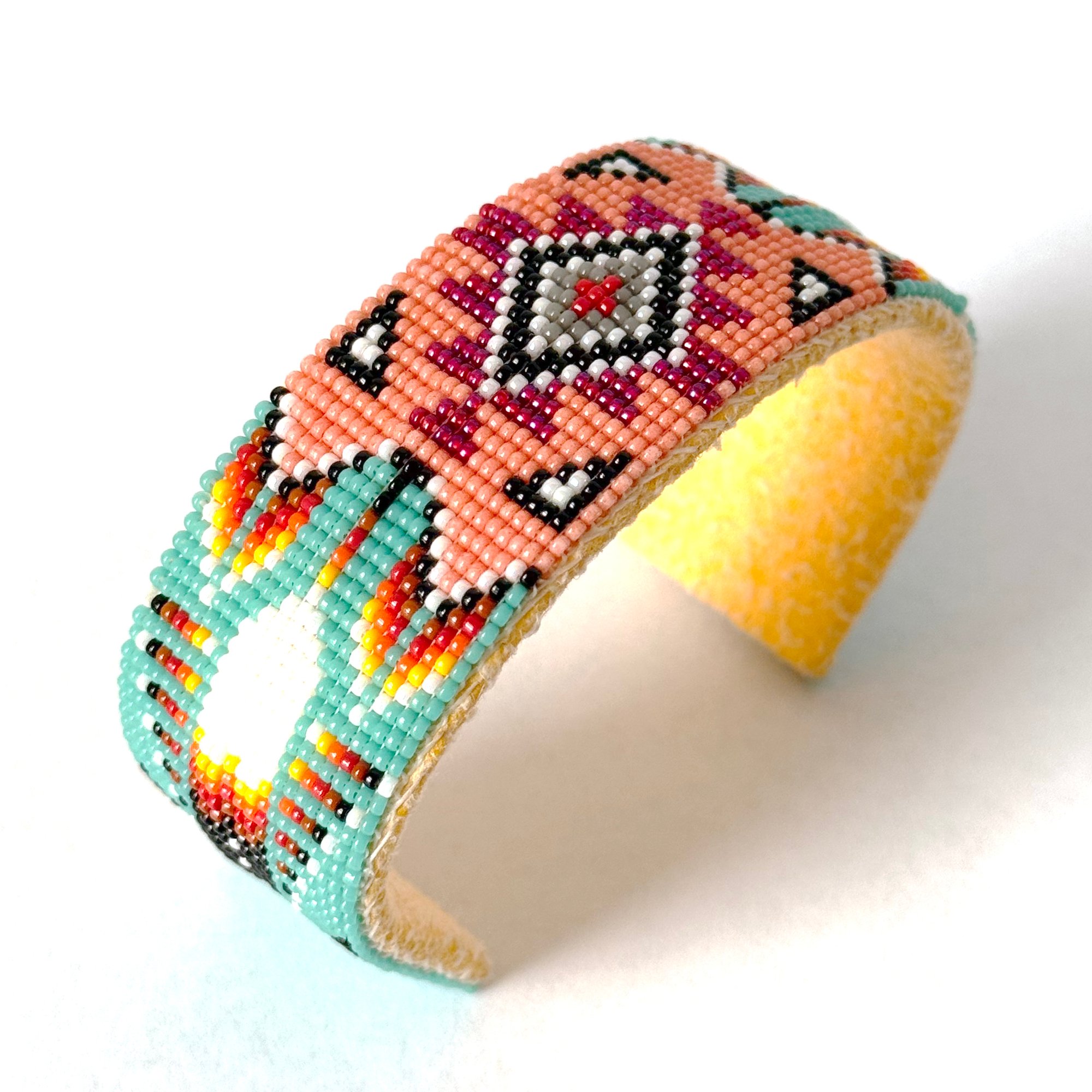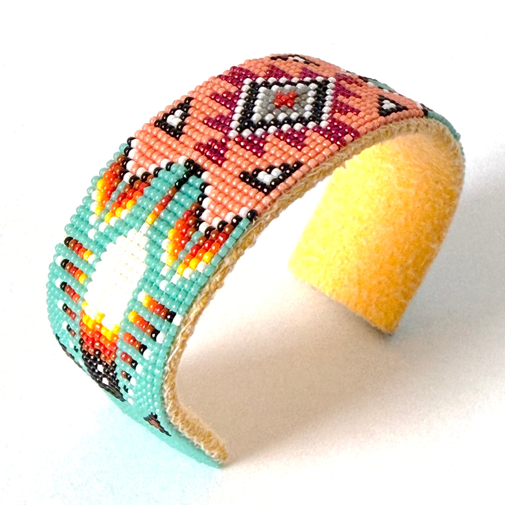 This brilliant handmade beaded Navajo cuff features tiny size 15 seed beads in rich colors with a central geometric design radiating outward. With a thick copper metal core, the bracelet is adjustable to fit most wrists and is backed with soft tan hide.