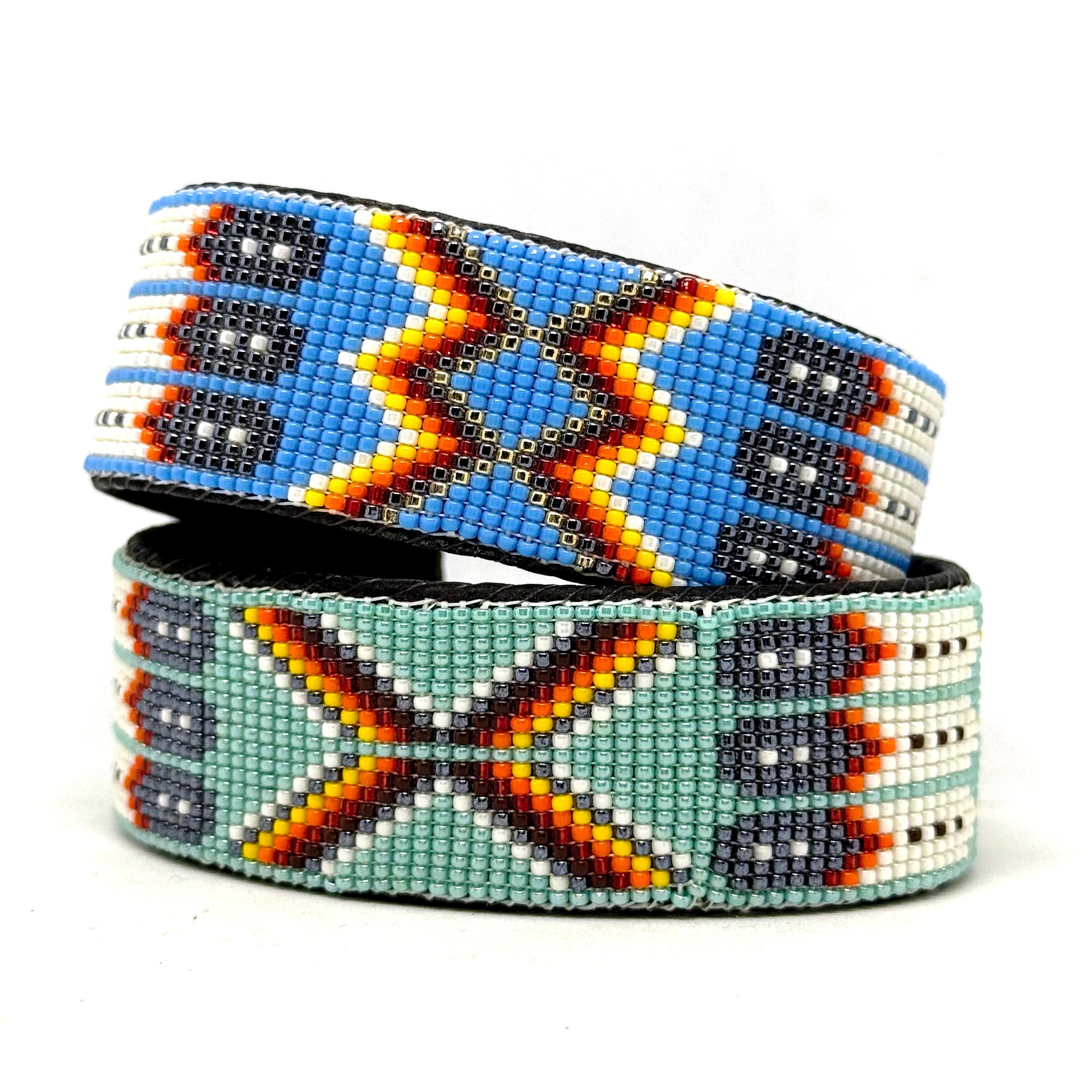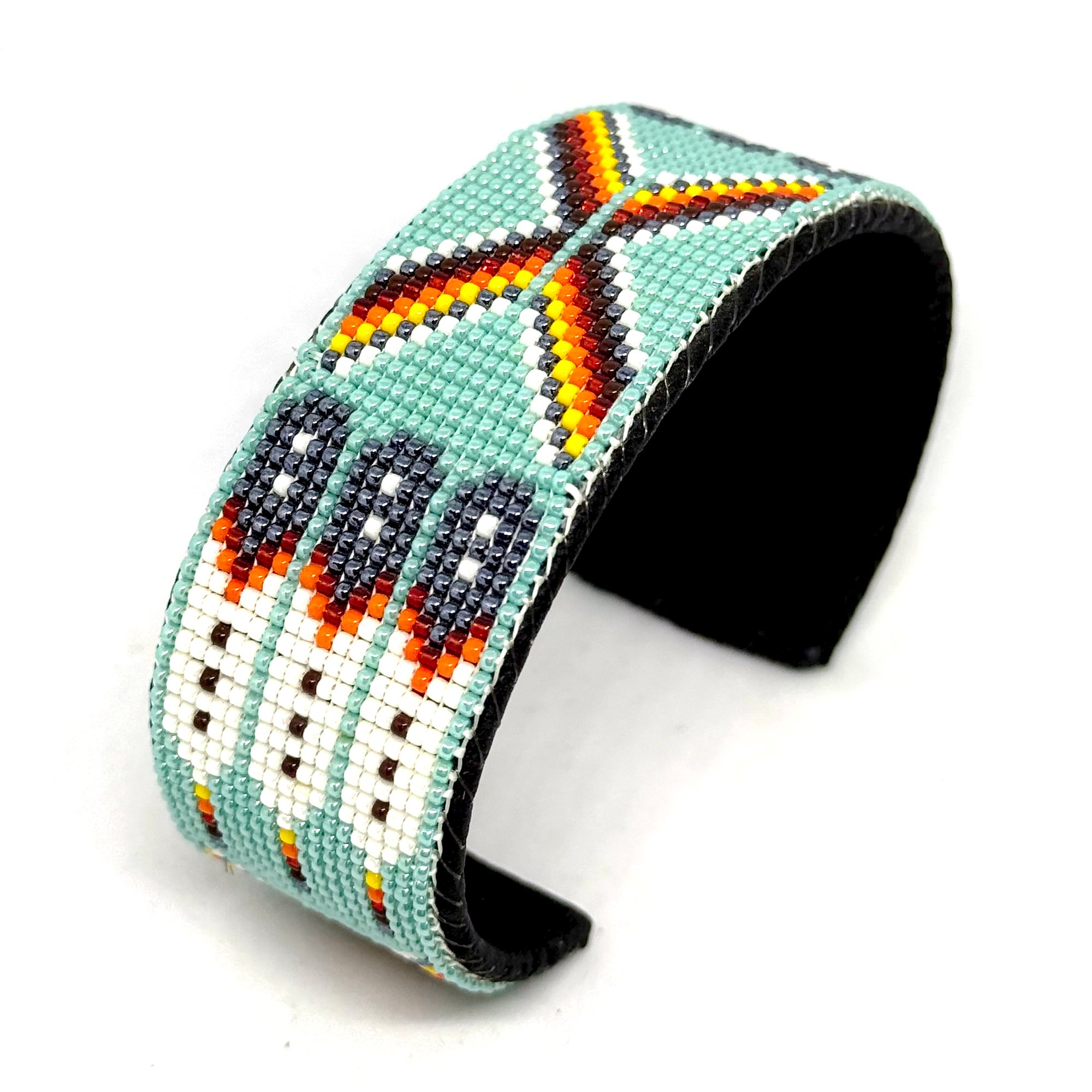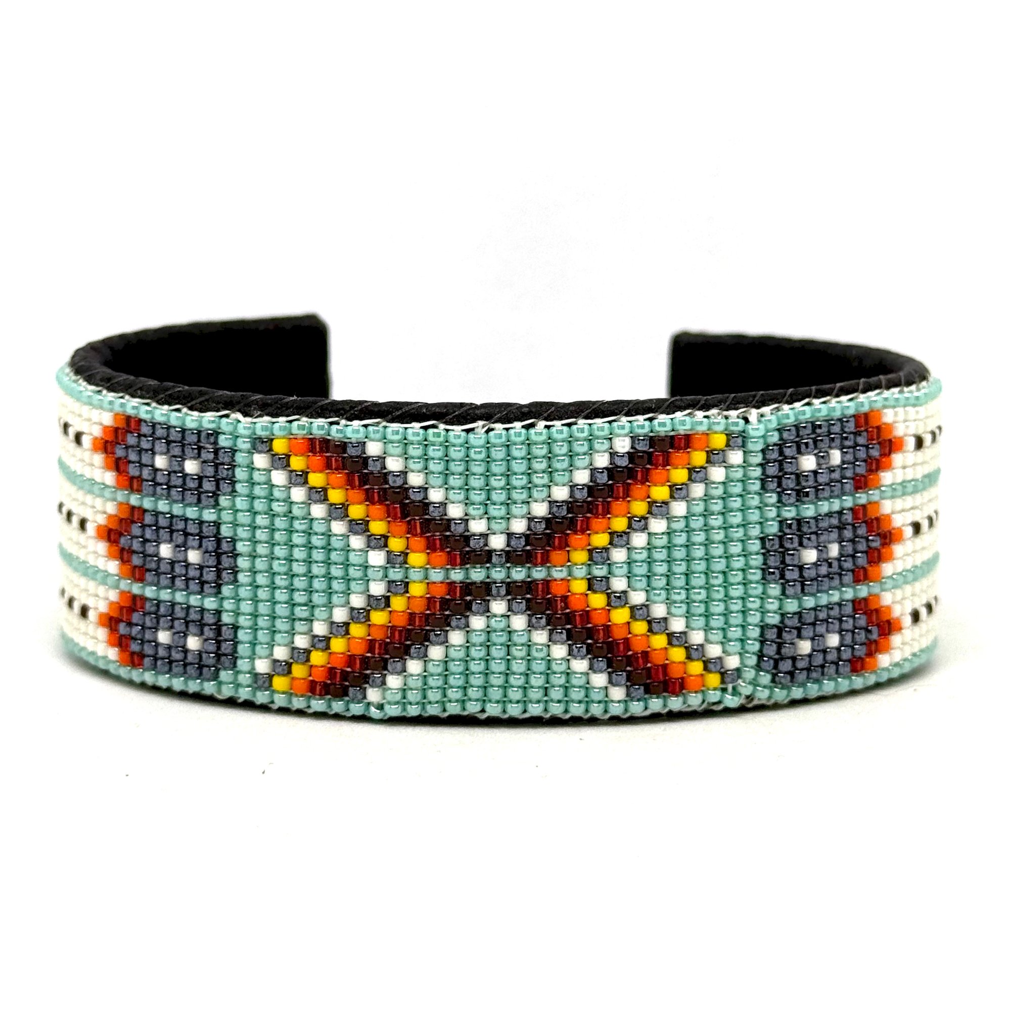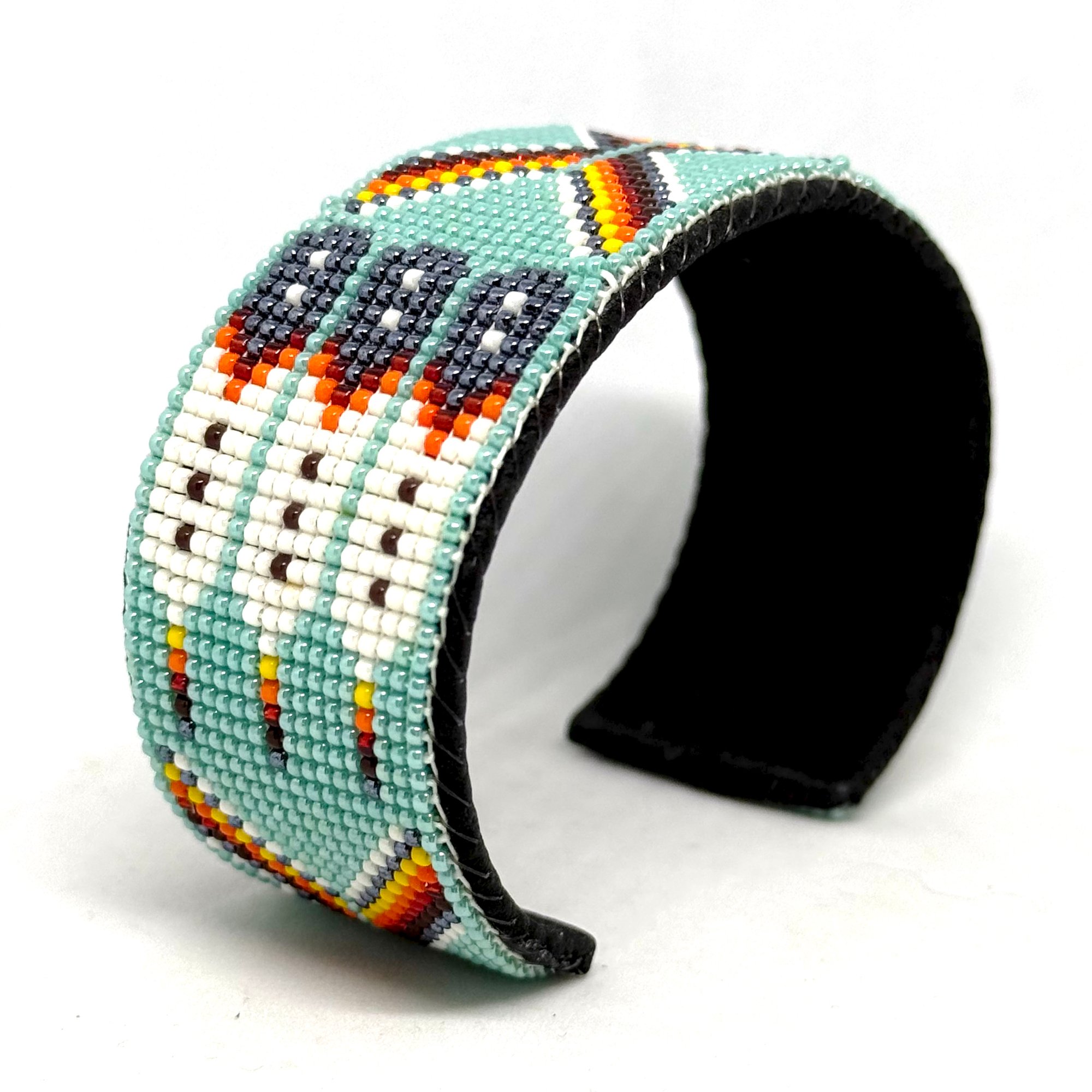 This large handmade beaded Navajo cuff features tiny size 15 seed beads in rich colors with a central geometric design radiating outward. With a thick copper metal core, the bracelet is adjustable to fit most wrists and is backed with soft black leather.
