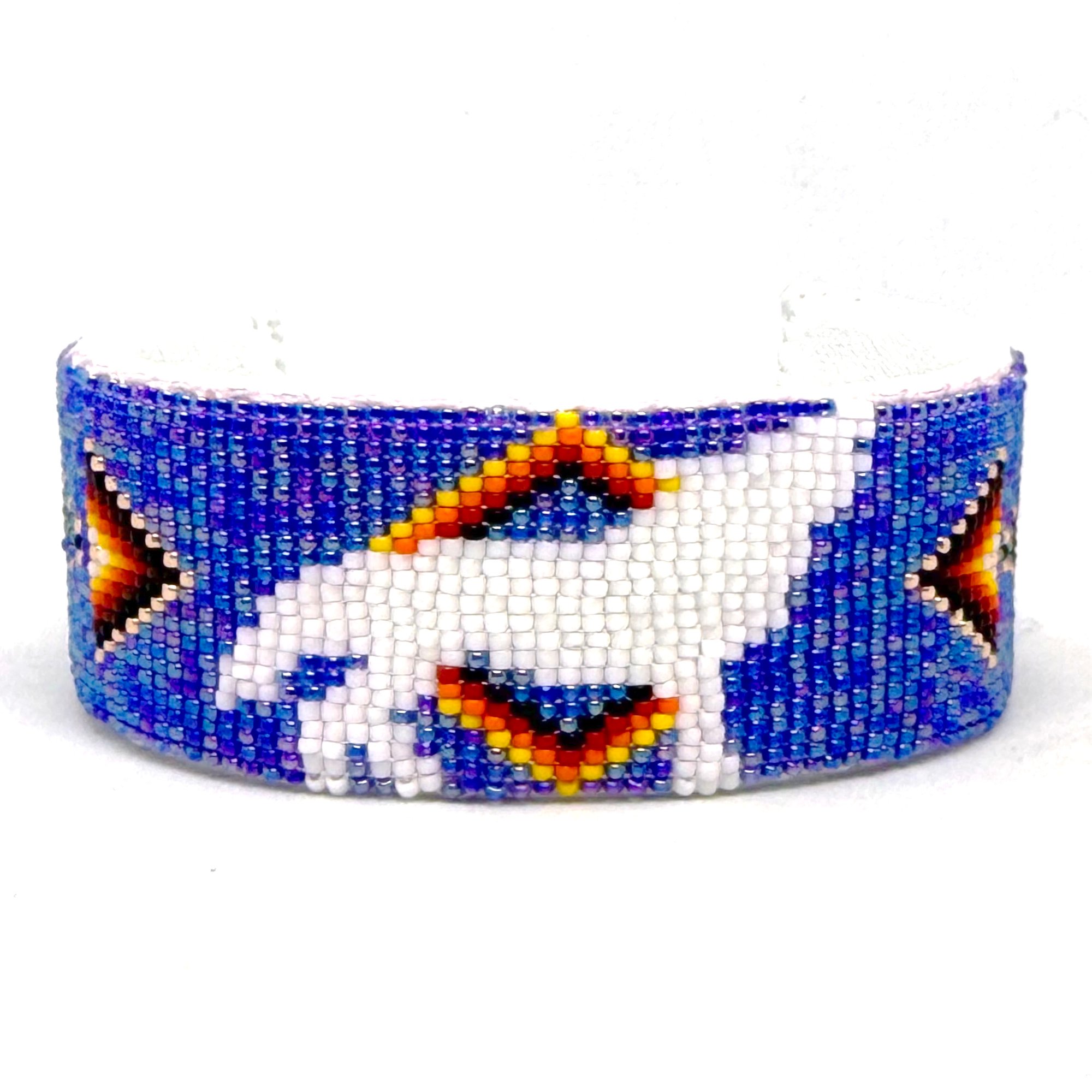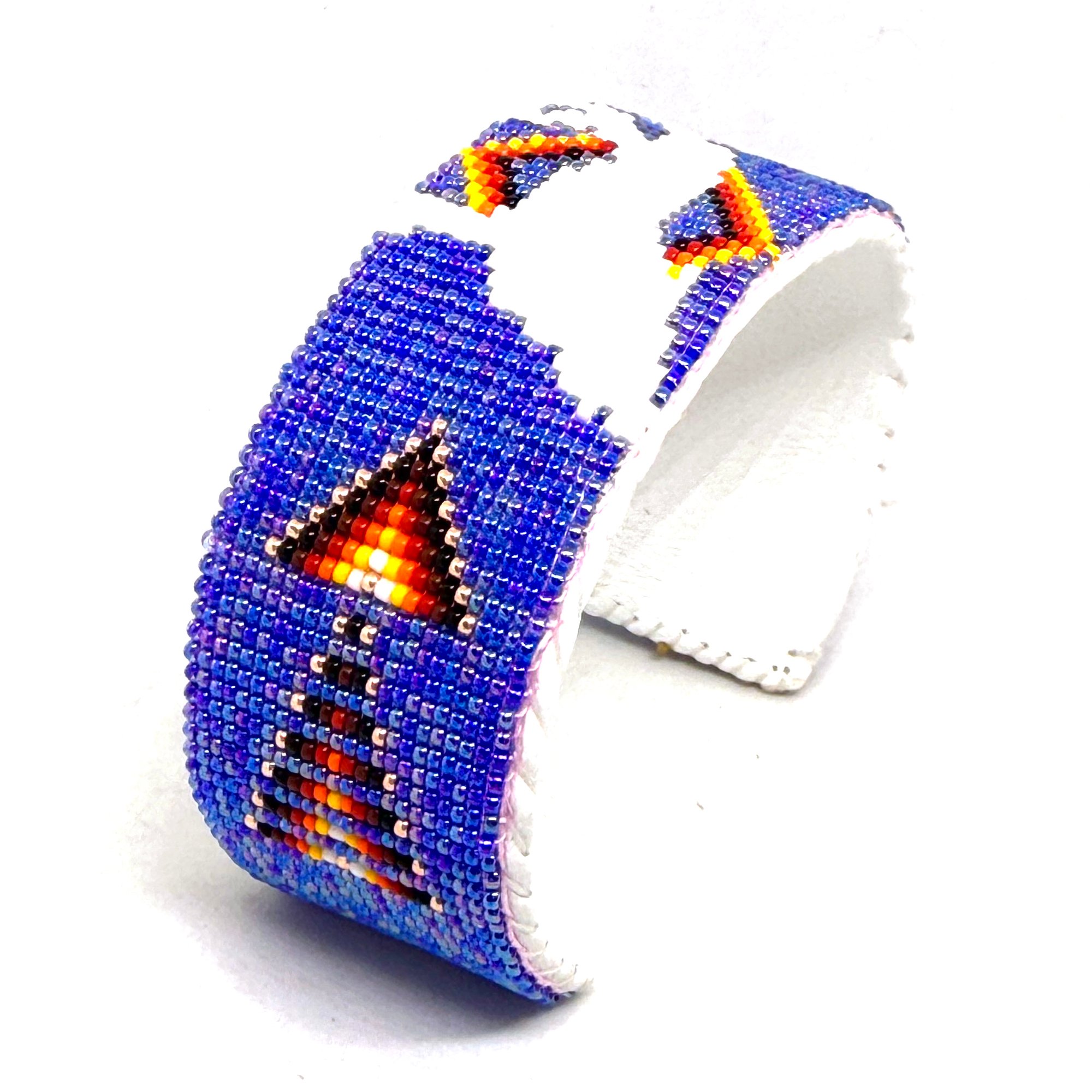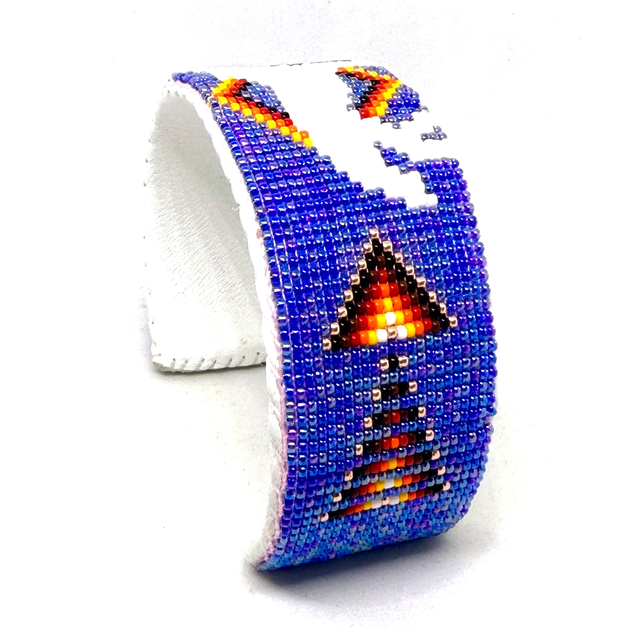 This intricate handmade beaded Navajo cuff features tiny size 15 seed beads in rich colors with a central geometric design radiating outward. With a thick copper metal core, the bracelet is adjustable to fit most wrists and is backed with soft white leather.