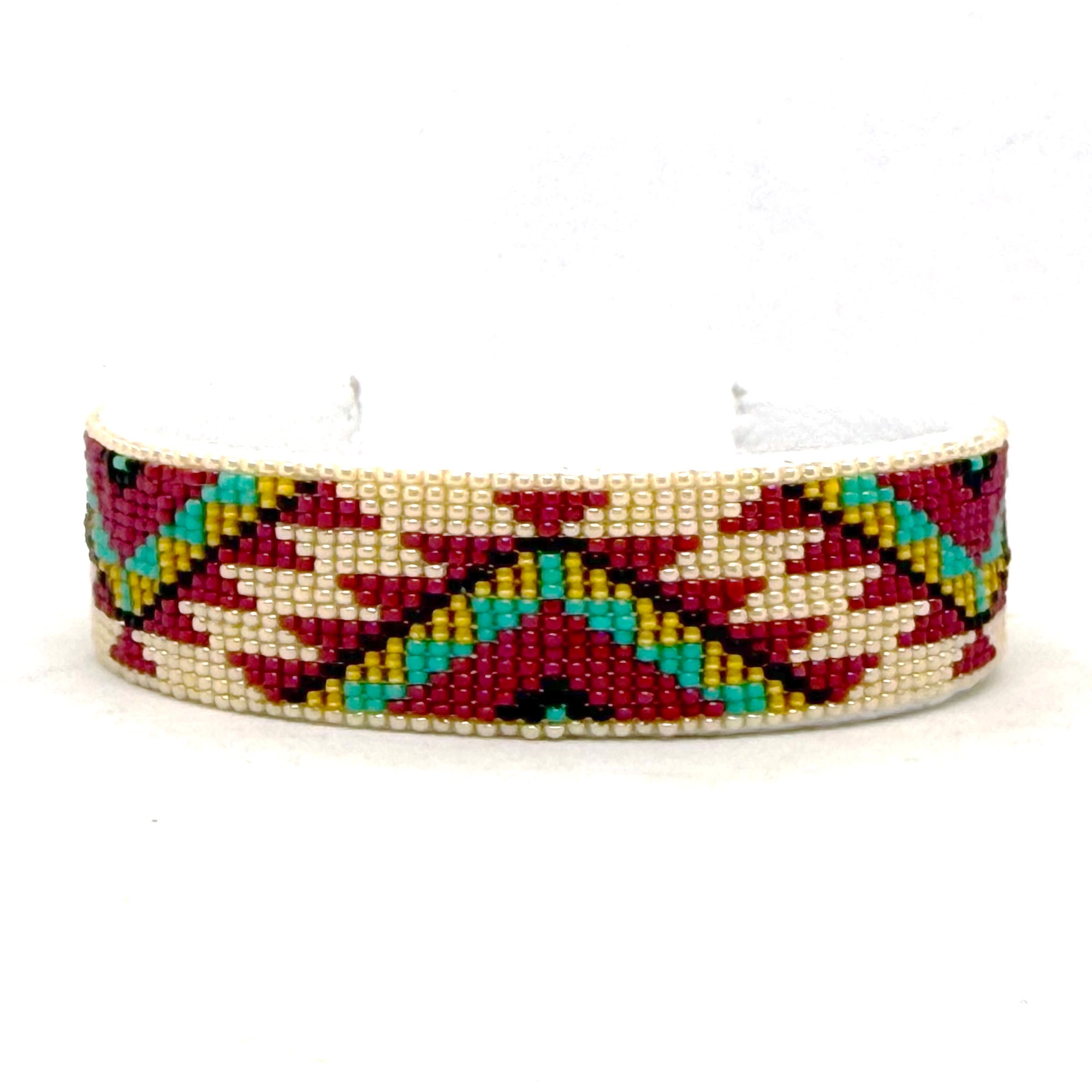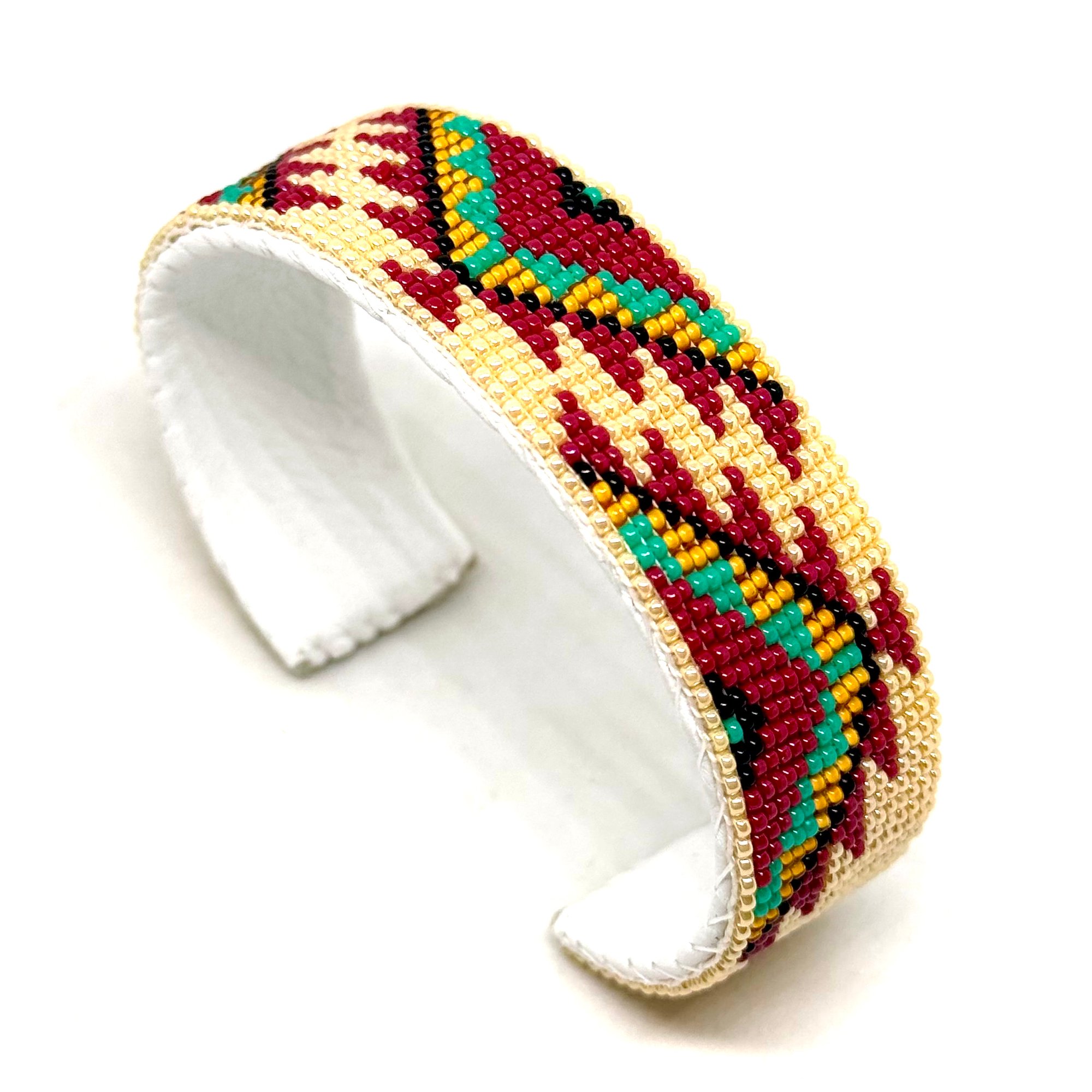 This elegant and intricate handmade beaded Navajo cuff features tiny size 15 seed beads in rich colors with a central geometric design stepping outward. With a thick copper metal core, the bracelet is adjustable to fit most wrists and is backed with soft white leather.