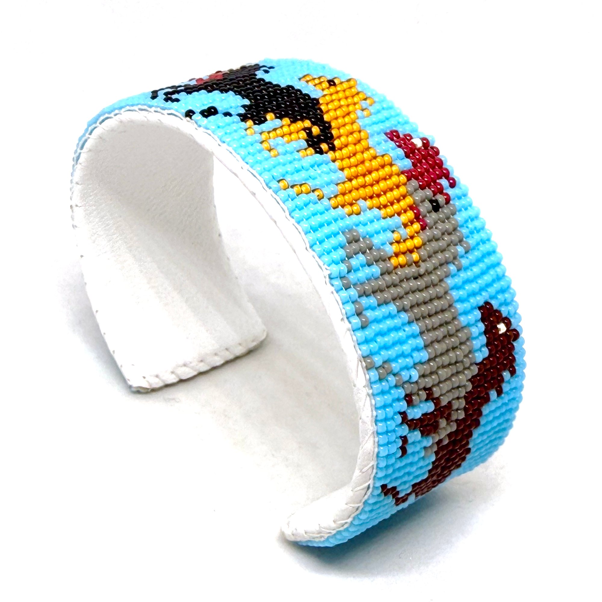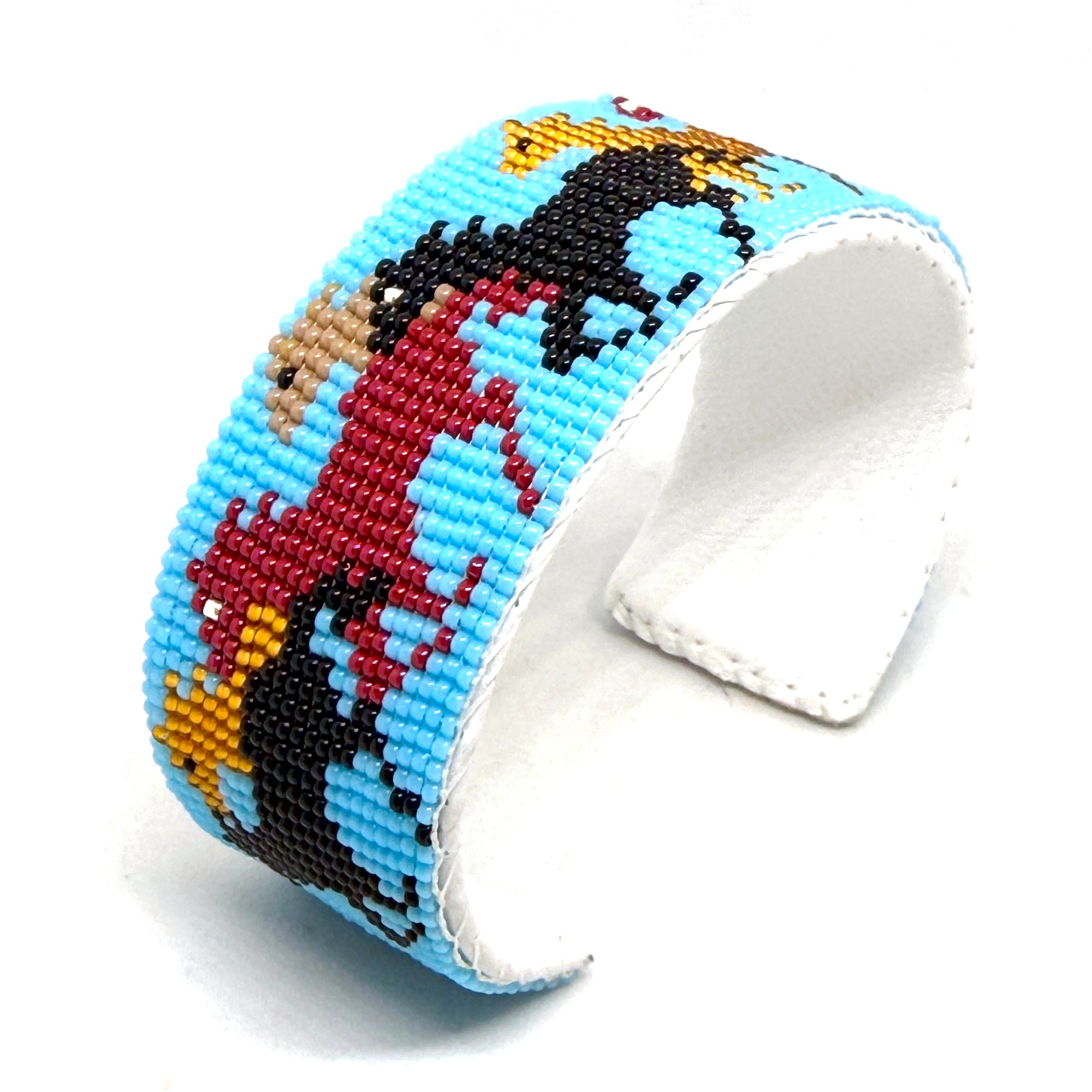 This intricate handmade beaded Navajo cuff features tiny size 15 seed beads in rich colors with horses running around the wrist. With a thick copper metal core, the bracelet is adjustable to fit most wrists and is backed with soft white leather.
