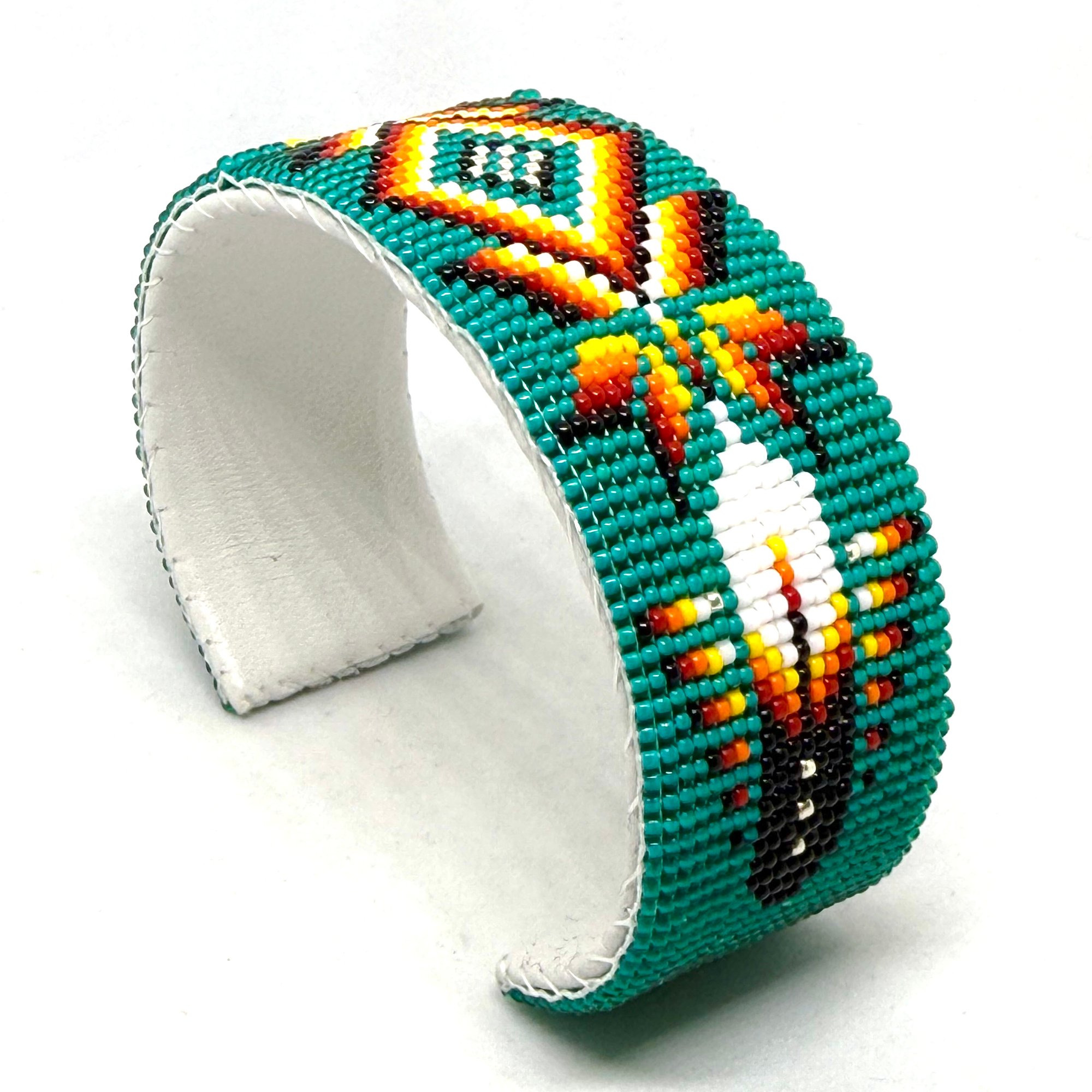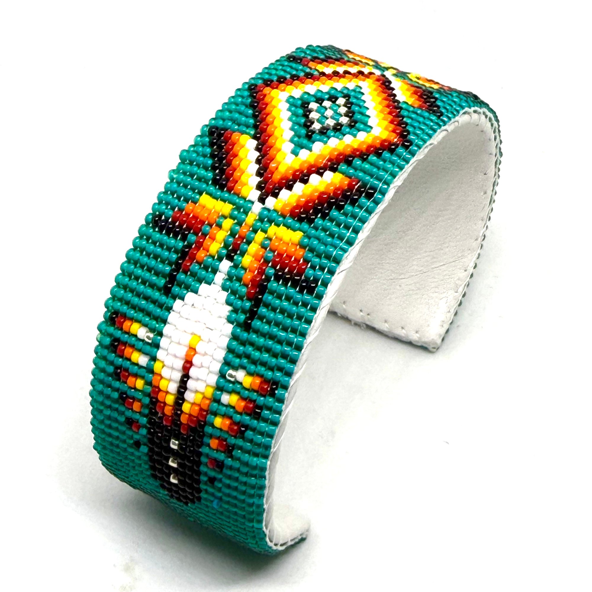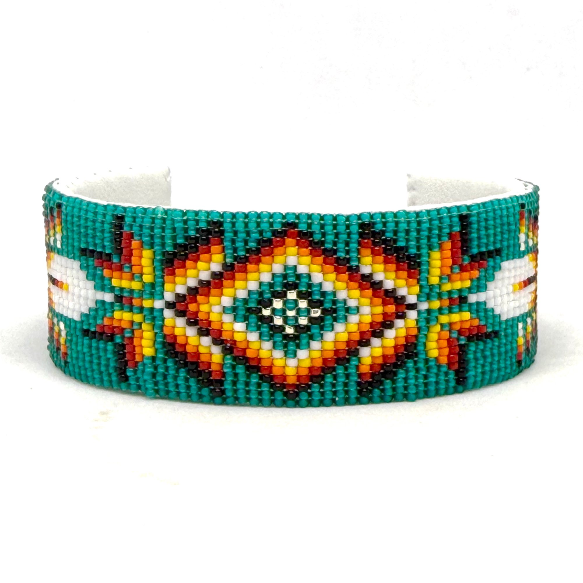 This intricate handmade beaded Navajo cuff features tiny size 15 seed beads in rich colors with a central geometric design radiating outward. With a thick copper metal core, the bracelet is adjustable to fit most wrists and is backed with soft white leather.