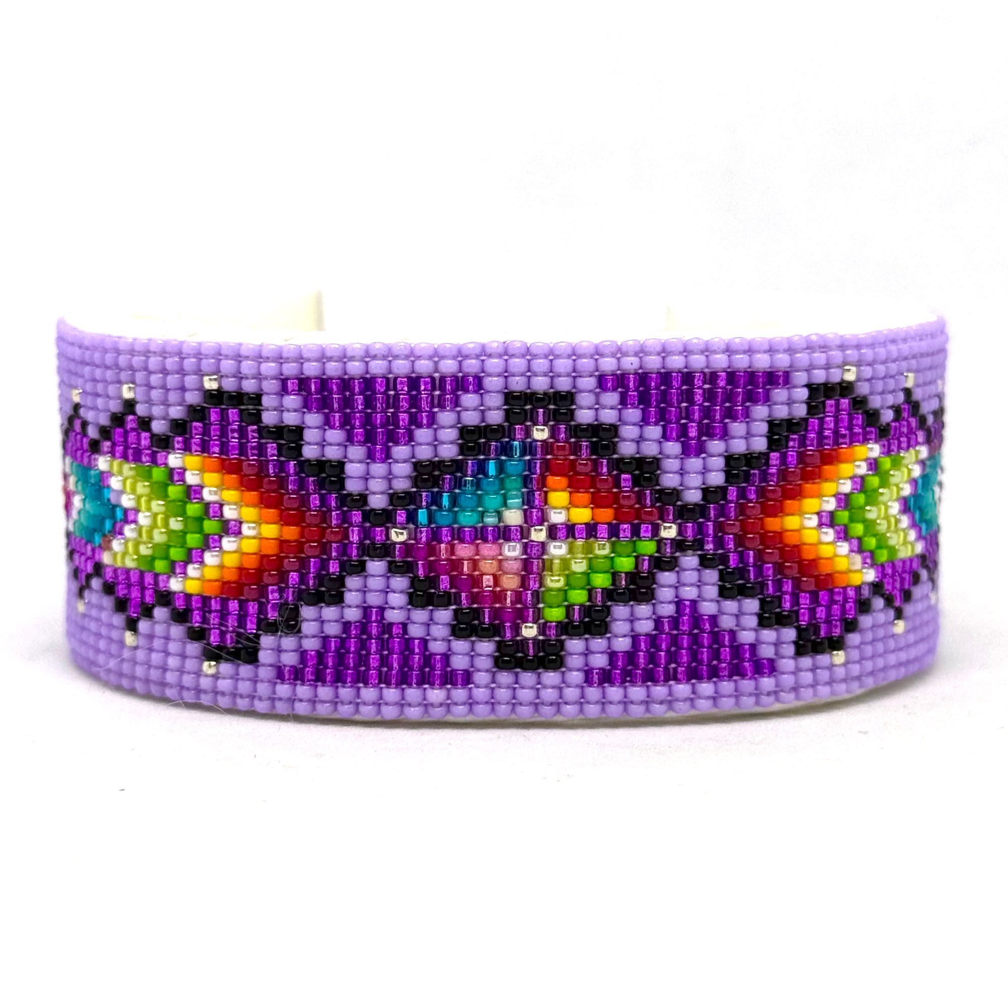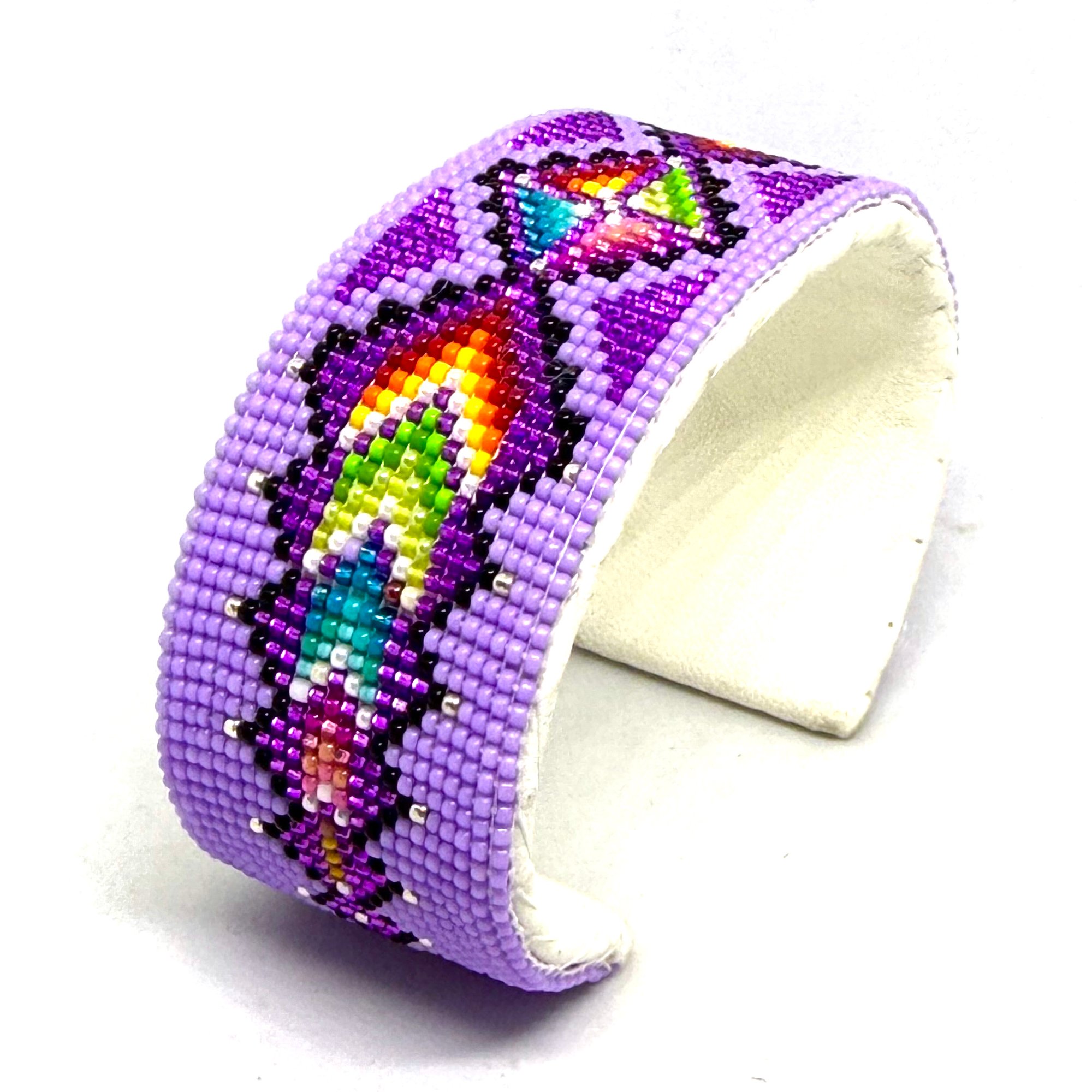 This intricate handmade beaded Navajo cuff features tiny size 15 seed beads in rich colors with a central geometric design radiating outward. With a thick copper metal core, the bracelet is adjustable to fit most wrists and is backed with soft white leather.