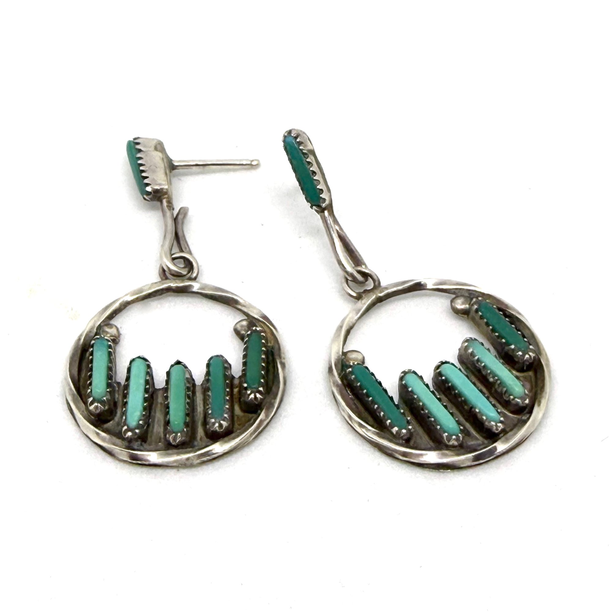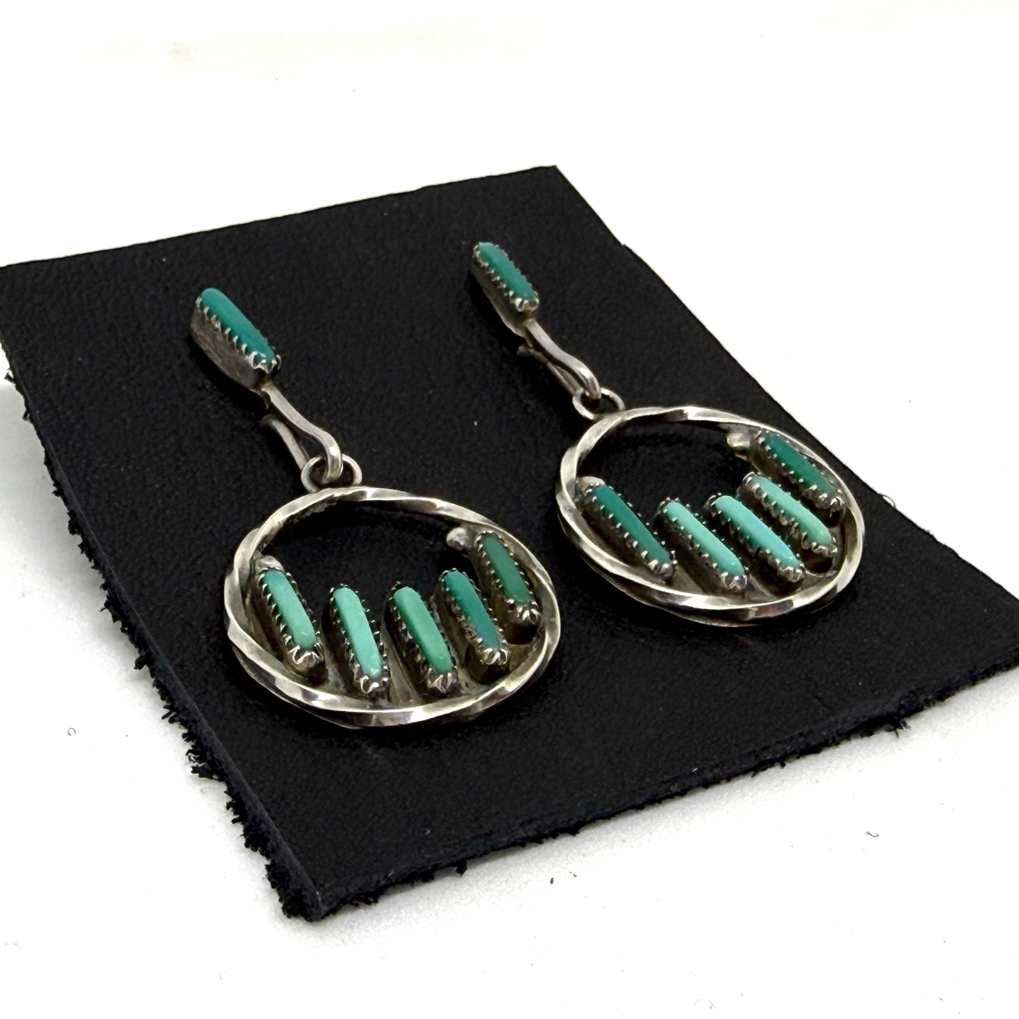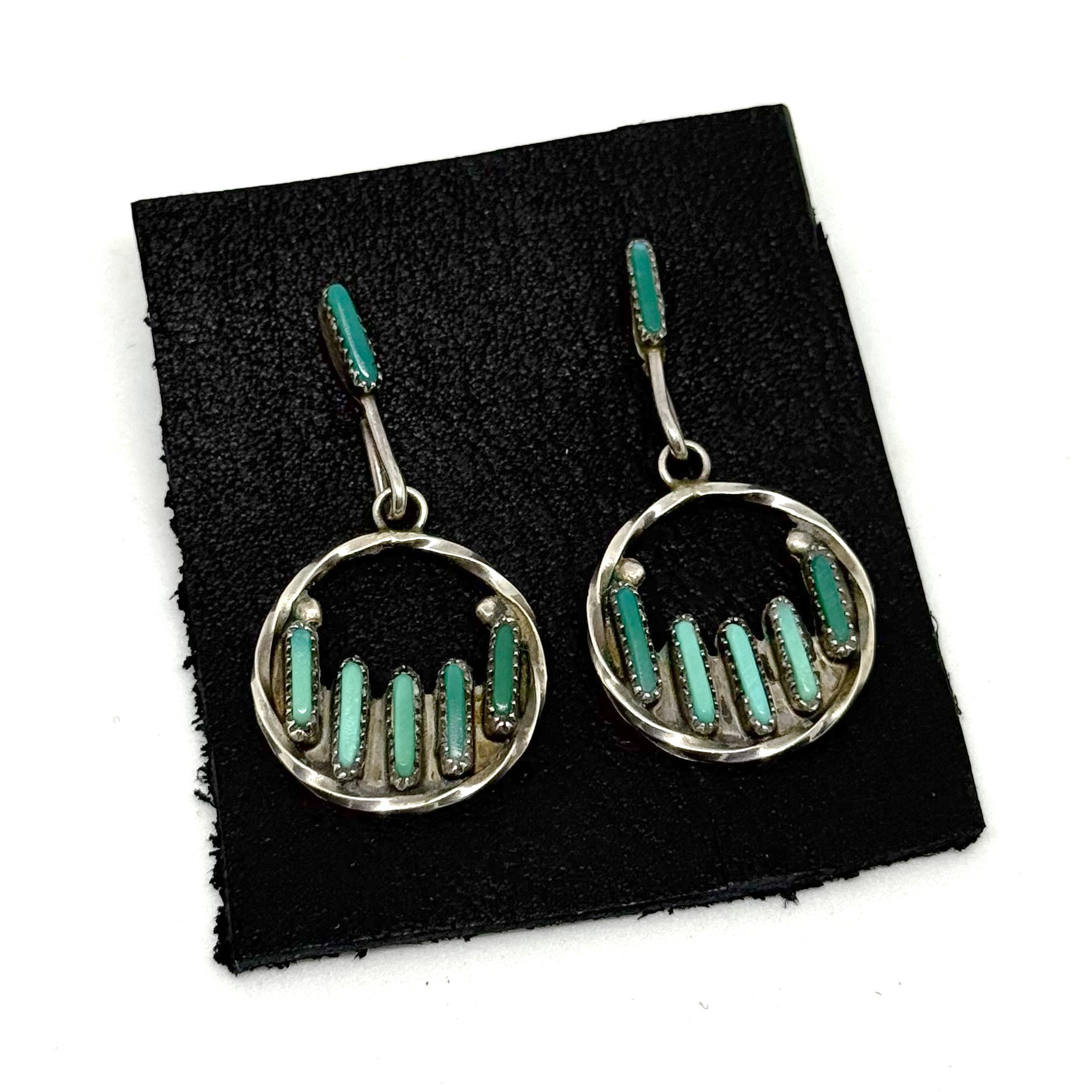 Wow. These pretty earrings feature needlepoint turquoise. The tiny, hand-cut, needle-shaped turquoise pieces are intricately placed, bezel set in sterling silver. The bottom hoops dangle below to add elegant movement. The best set to wear for all occasions - spanning from casual lunch dates, to professional work meetings, to joyous birthdays and celebrations. They hang 1.5" long.