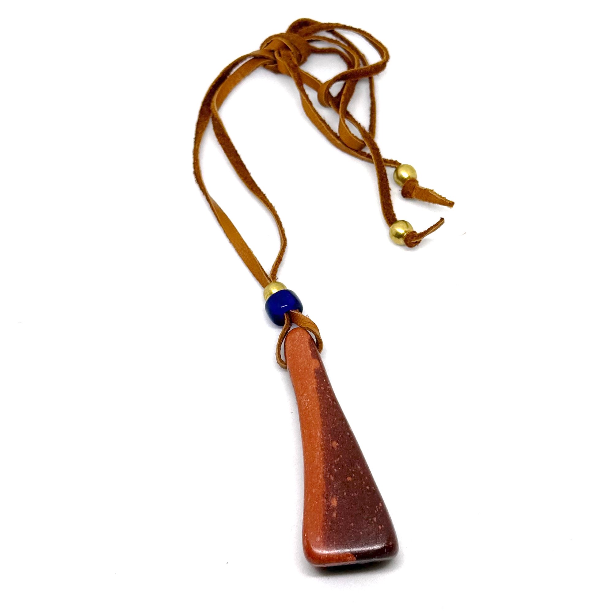 This necklace was designed by Jessica R. Metcalfe (Turtle Mountain Chippewa) and features a large pendant strung on a long saddle brown deerskin lace and accented with a cobalt blue glass pony bead and heavy brass metal beads.