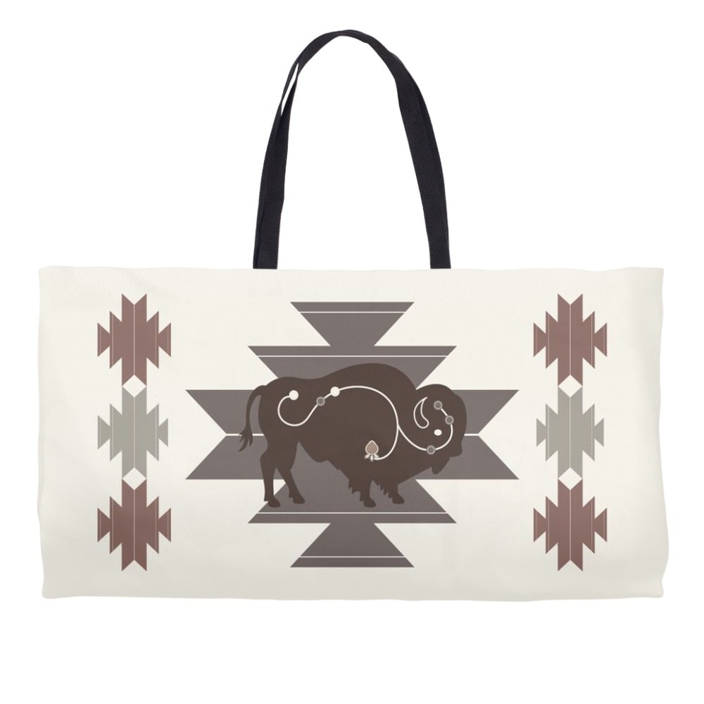 This large durable tote is designed by Tessa Sayers (Turtle Mountain Chippewa). It features a central design in soft warm neutral grays in light, medium, and dark hues. Bone white background and light copper accents.