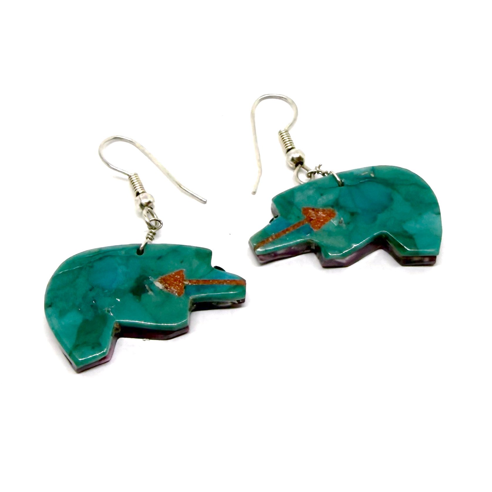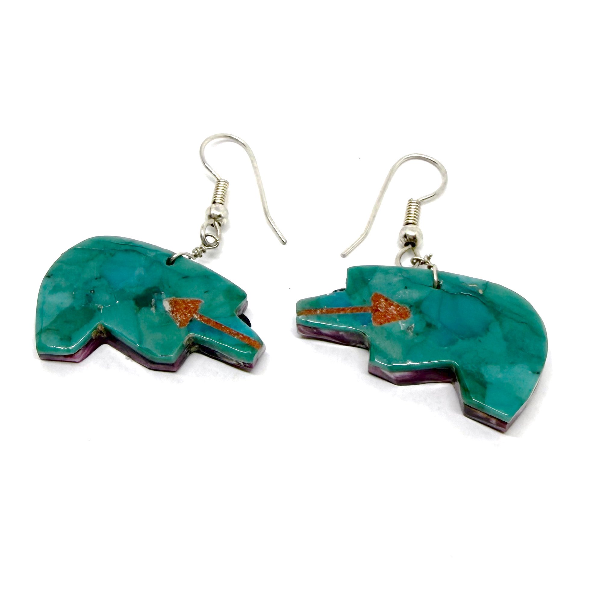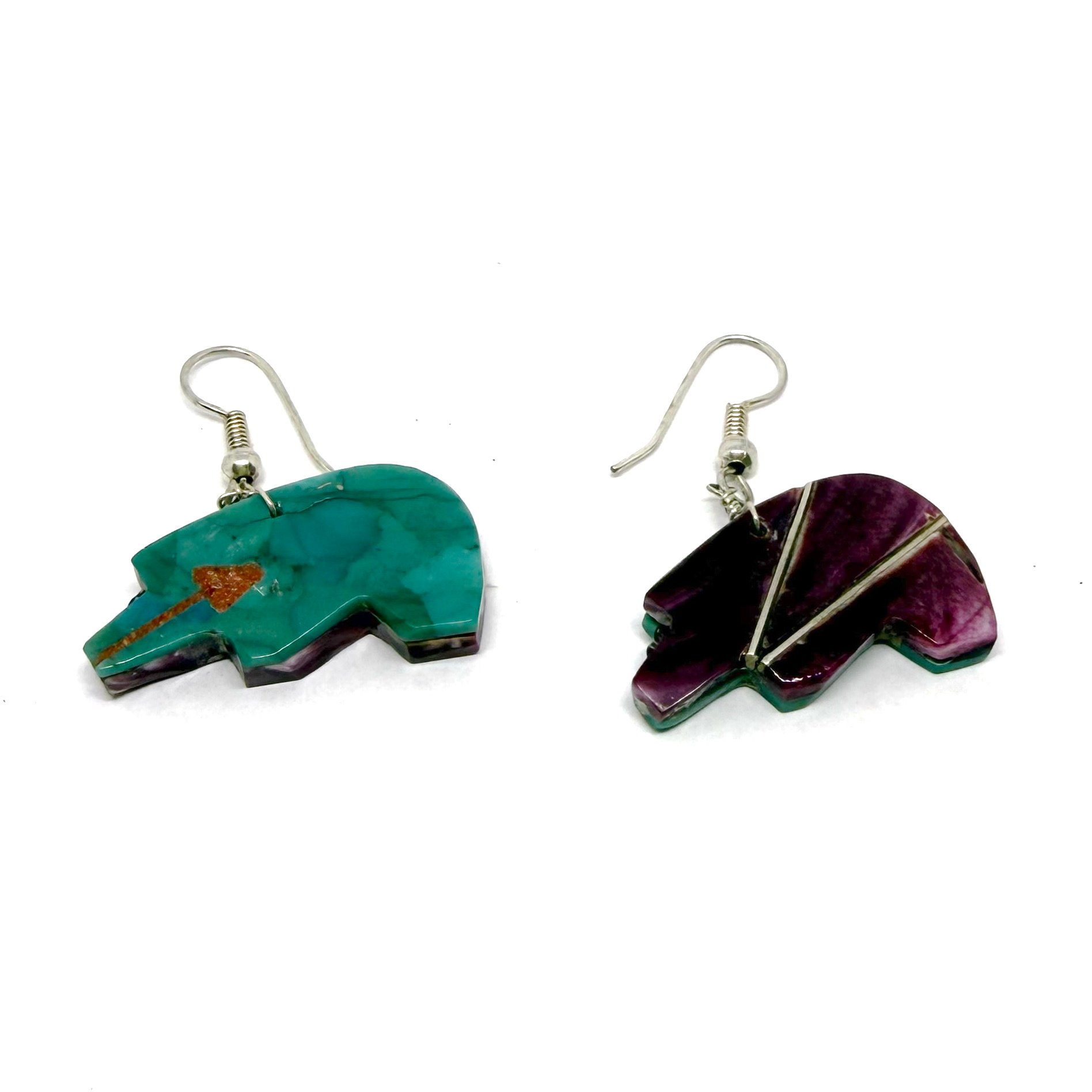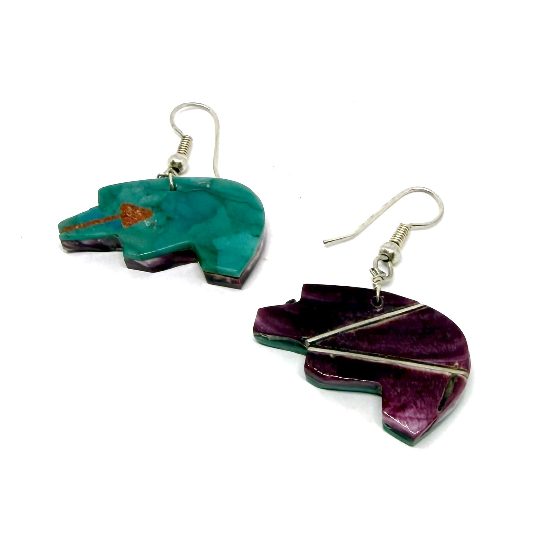 Wow! These earrings are so cool. The double-sided vintage Santo Domingo Pueblo earrings feature a bear silhouette intricately carved from purple spiny oyster shell and turquoise, with a subtle tan coral heart line. The earrings hang 1.5" long. They naturally move when worn, casually showing off both sides, which will definitely garner many compliments!