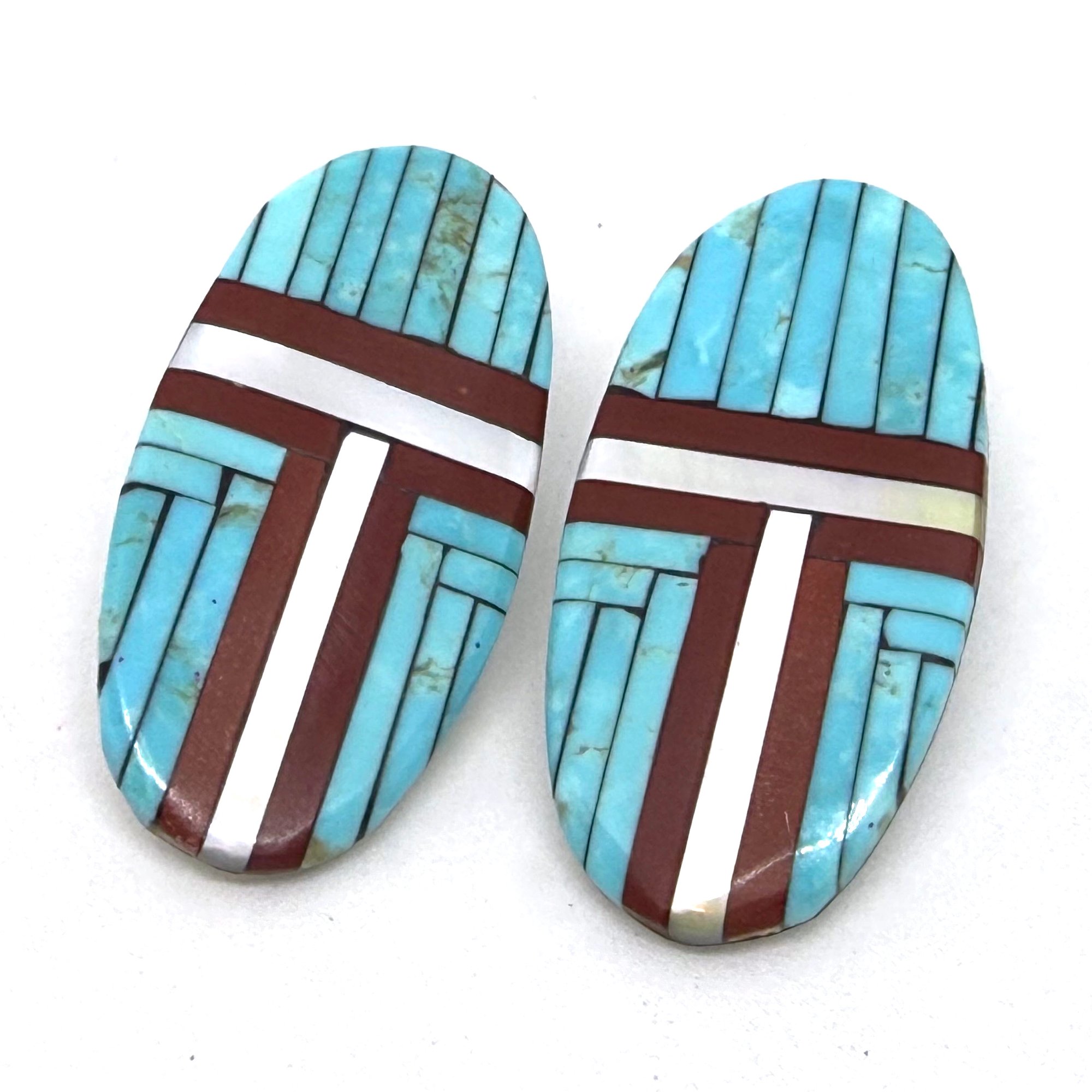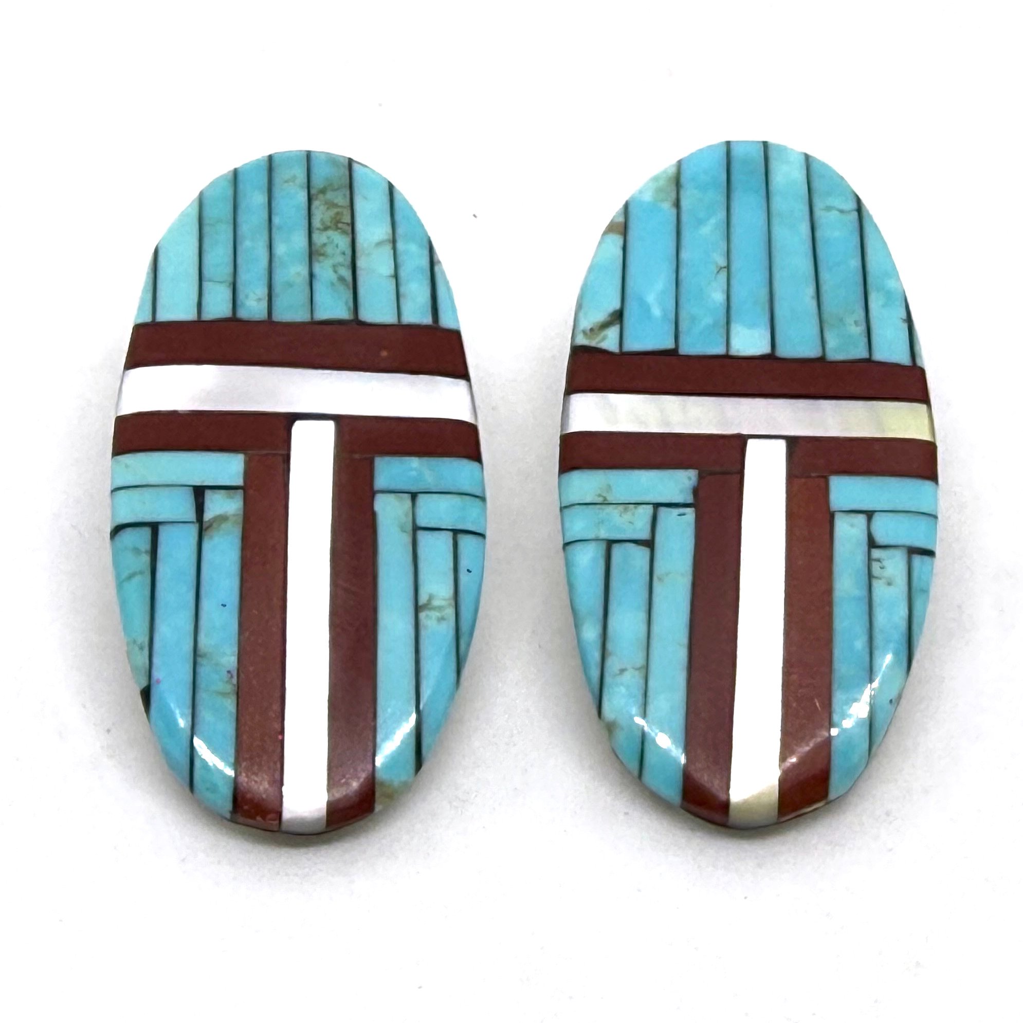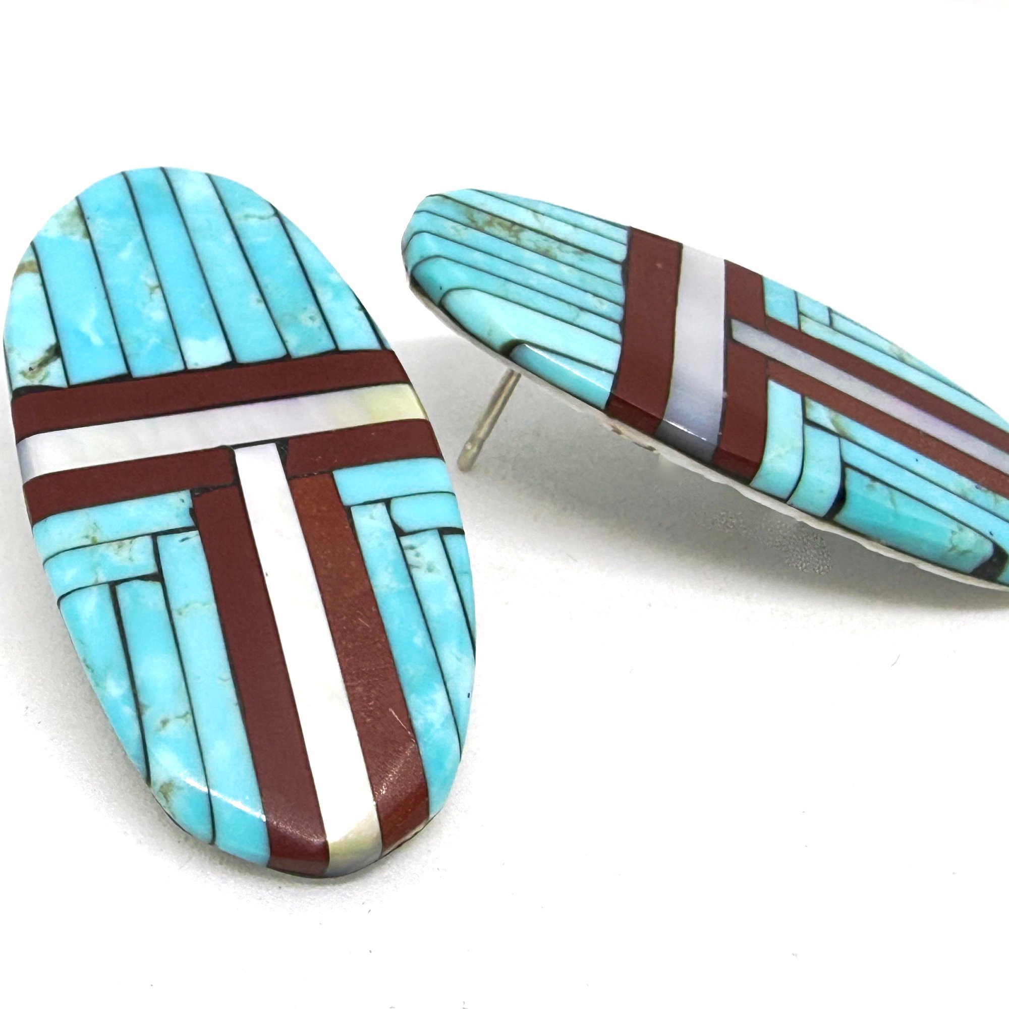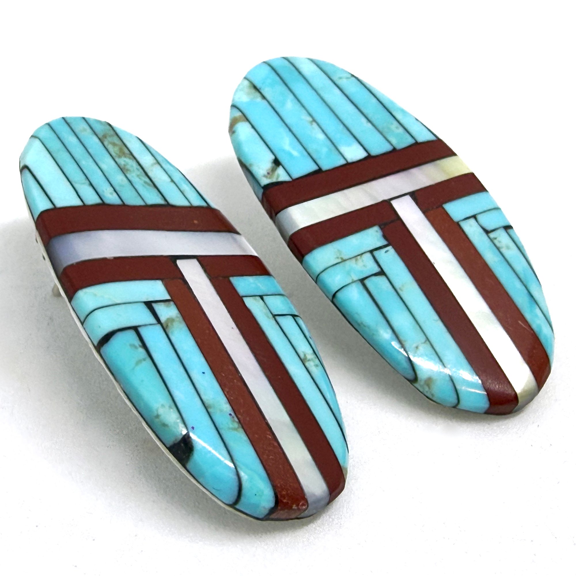 These sleek and elegant large Santo Domingo Pueblo earrings feature bands of light pearlescent shell, dark earthy pipestone, and bold turquoise, inlaid on an oblong hand cut and carved shell slab. The earrings measure 2" long.