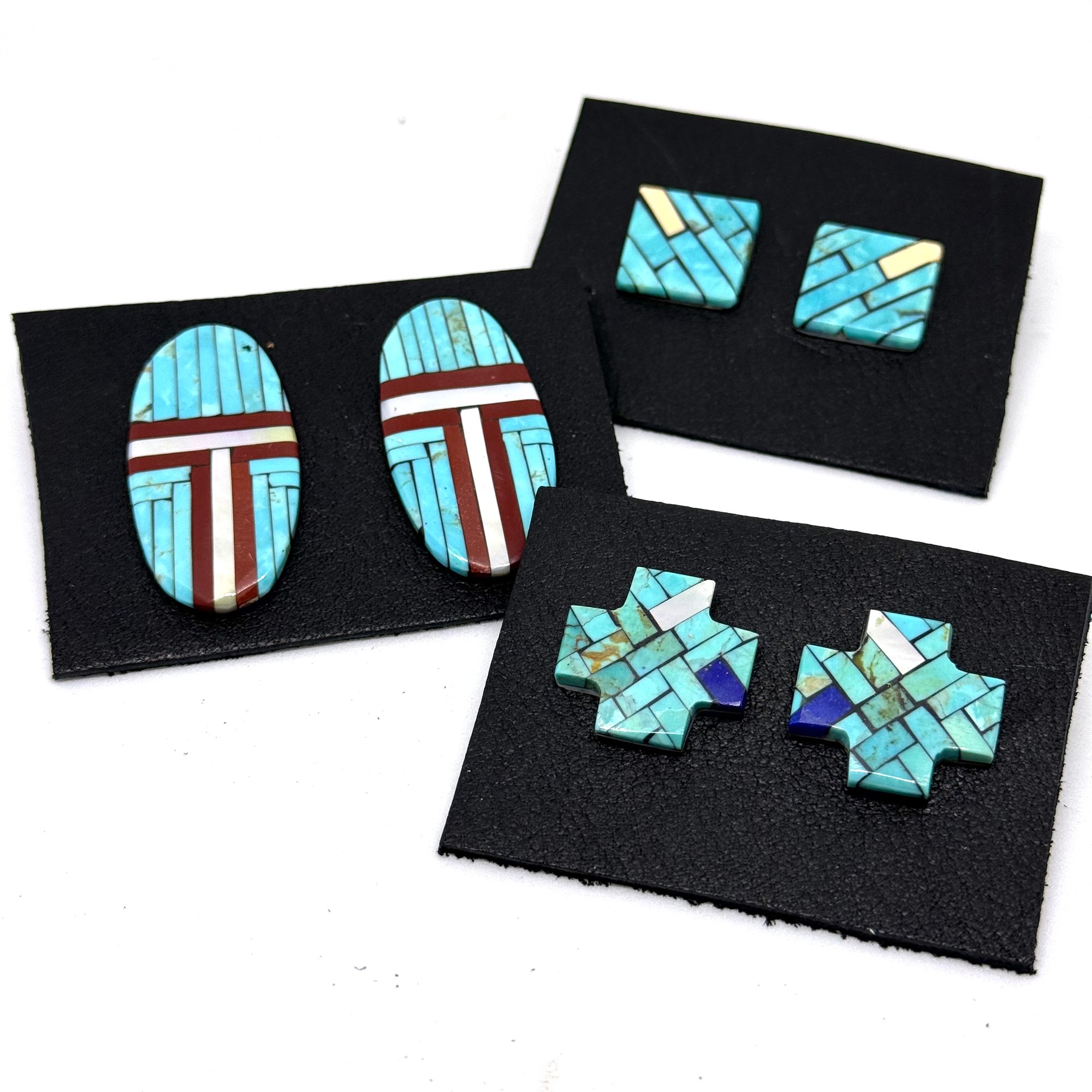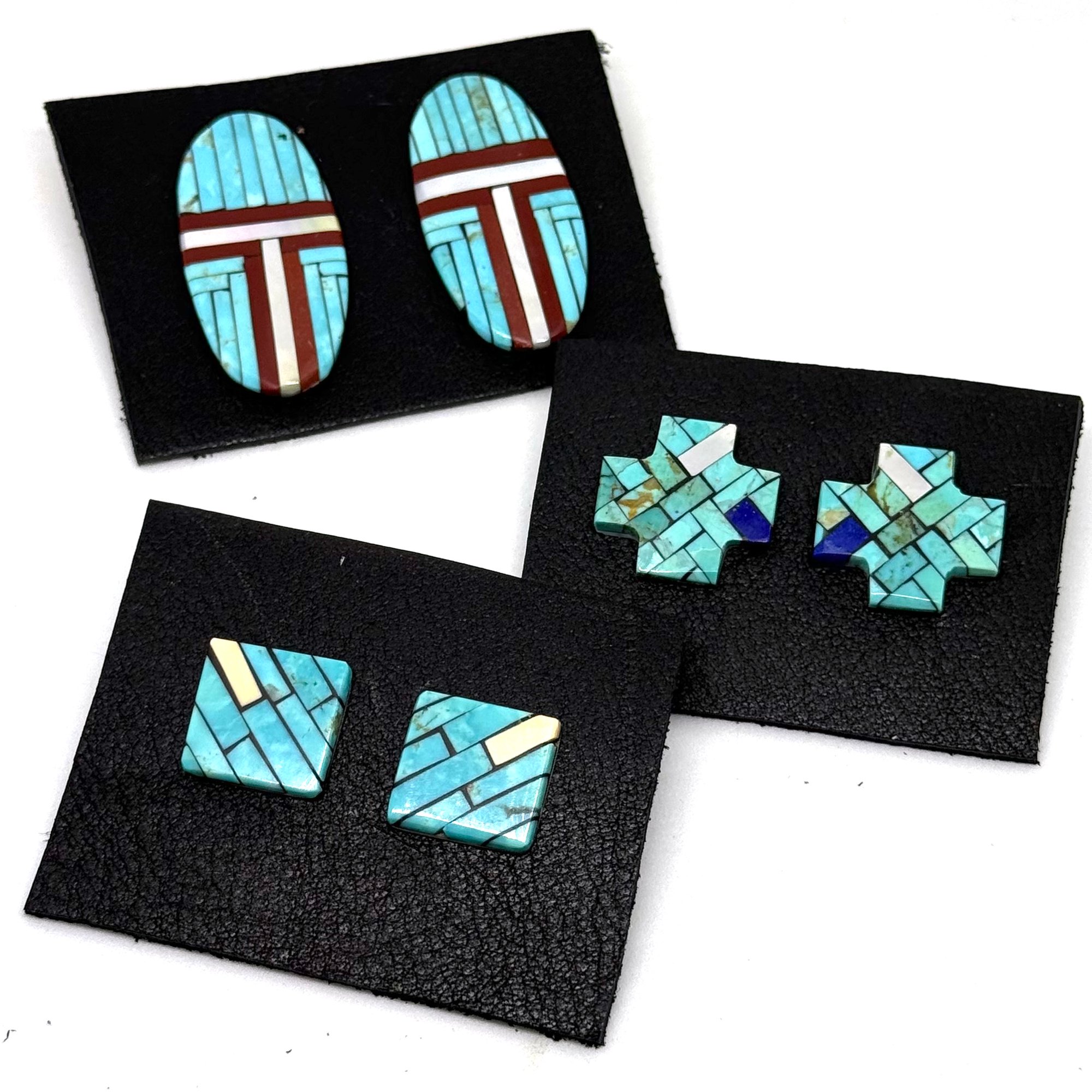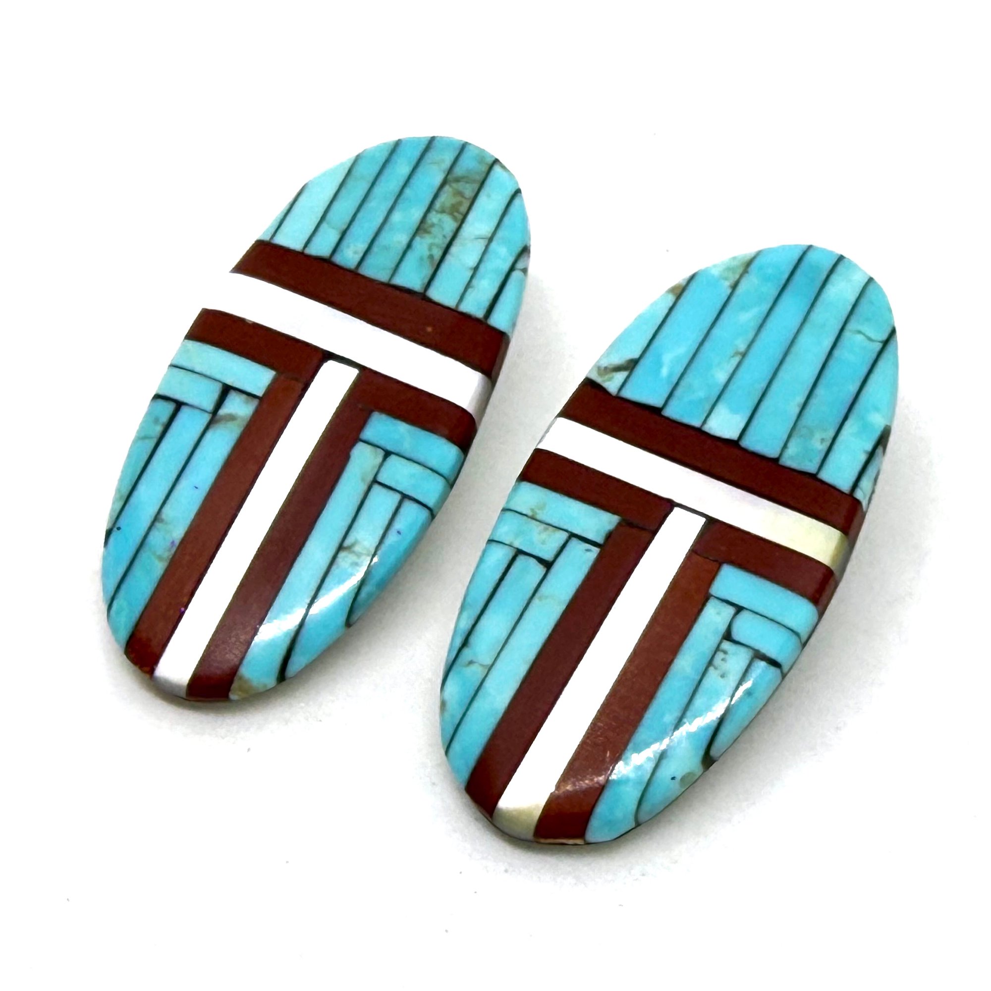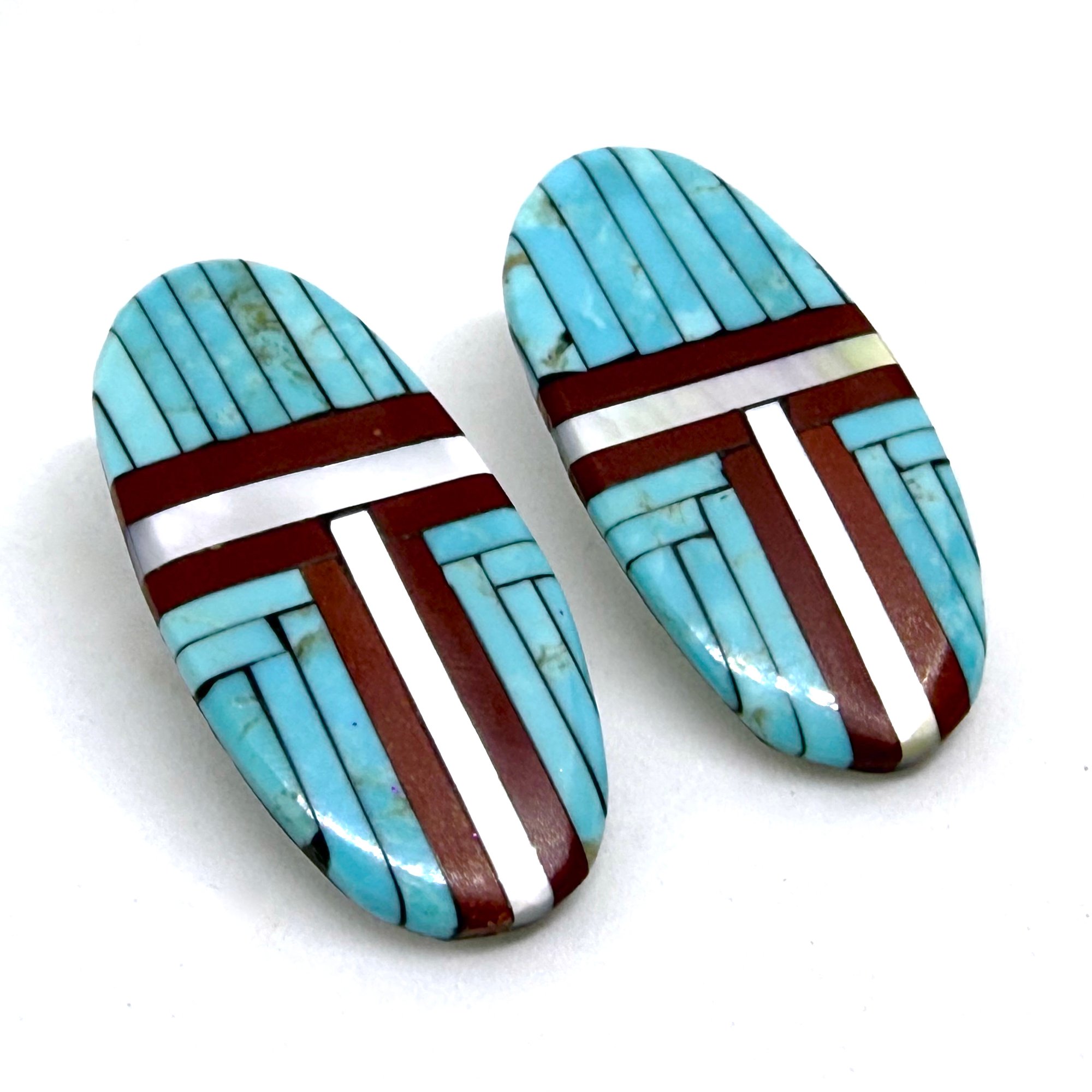 These sleek and elegant large Santo Domingo Pueblo earrings feature bands of light pearlescent shell, dark earthy pipestone, and bold turquoise, inlaid on an oblong hand cut and carved shell slab. The earrings measure 2" long.