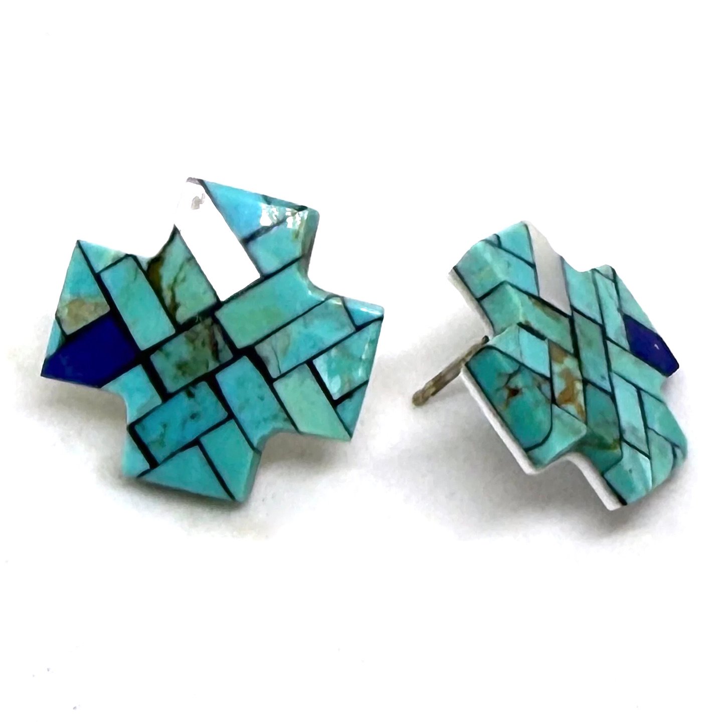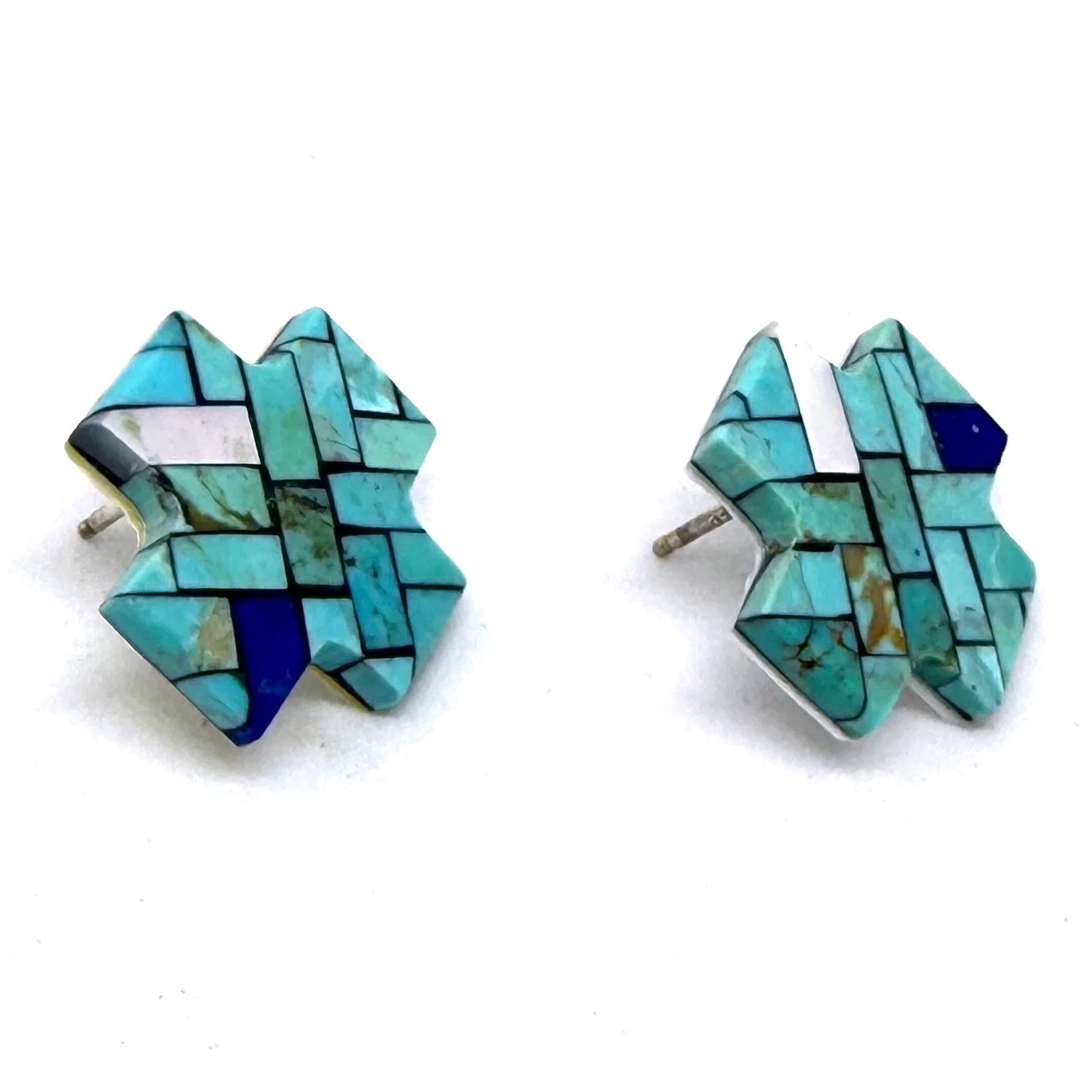These Santo Domingo Pueblo earrings feature a block mosaic of turquoise, lapis lazuli, and shimmering mother of pearl shell set on a hand cut and carved shell slab. The earrings measure 1" long.