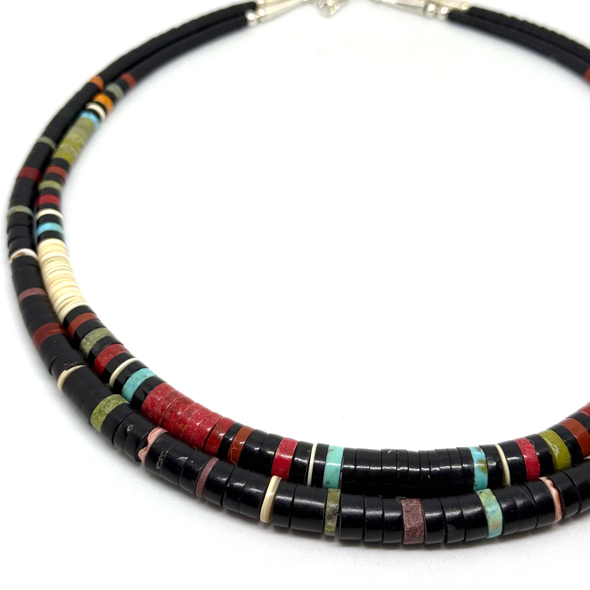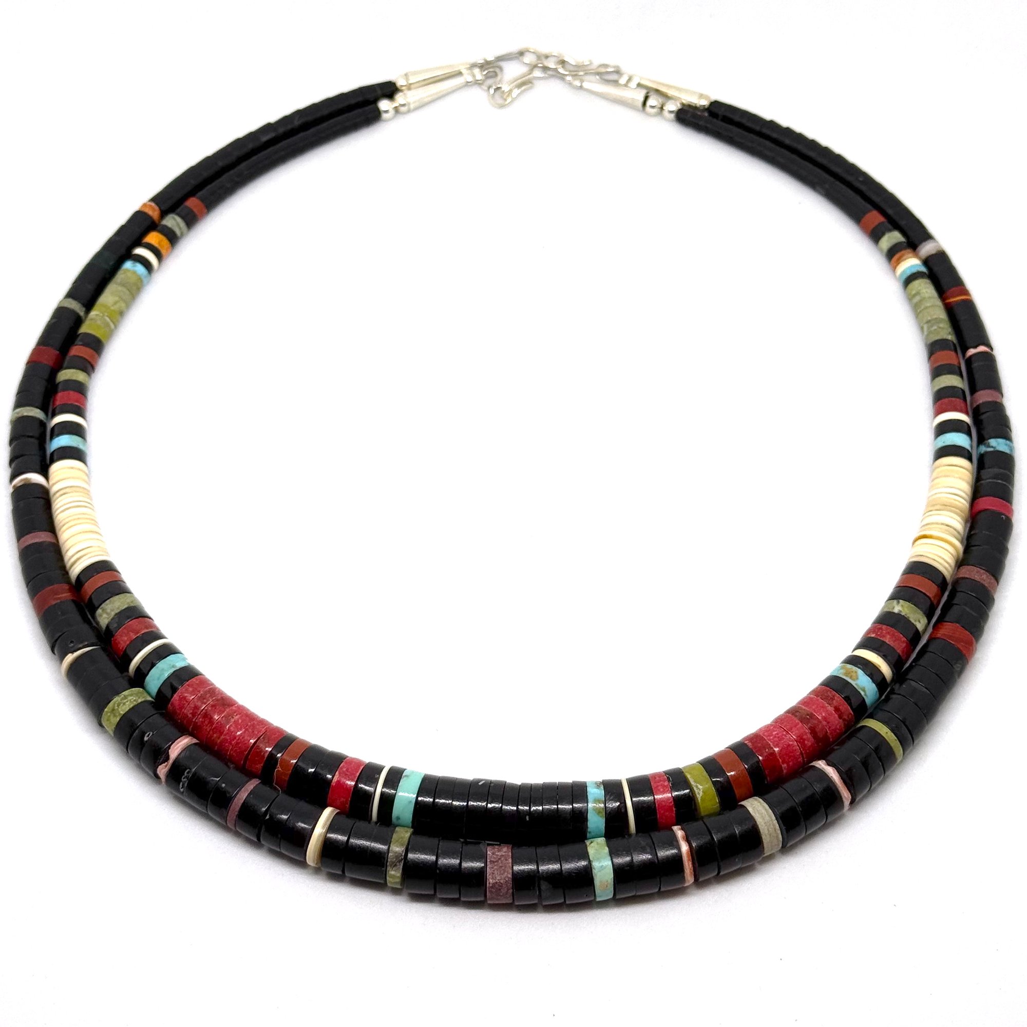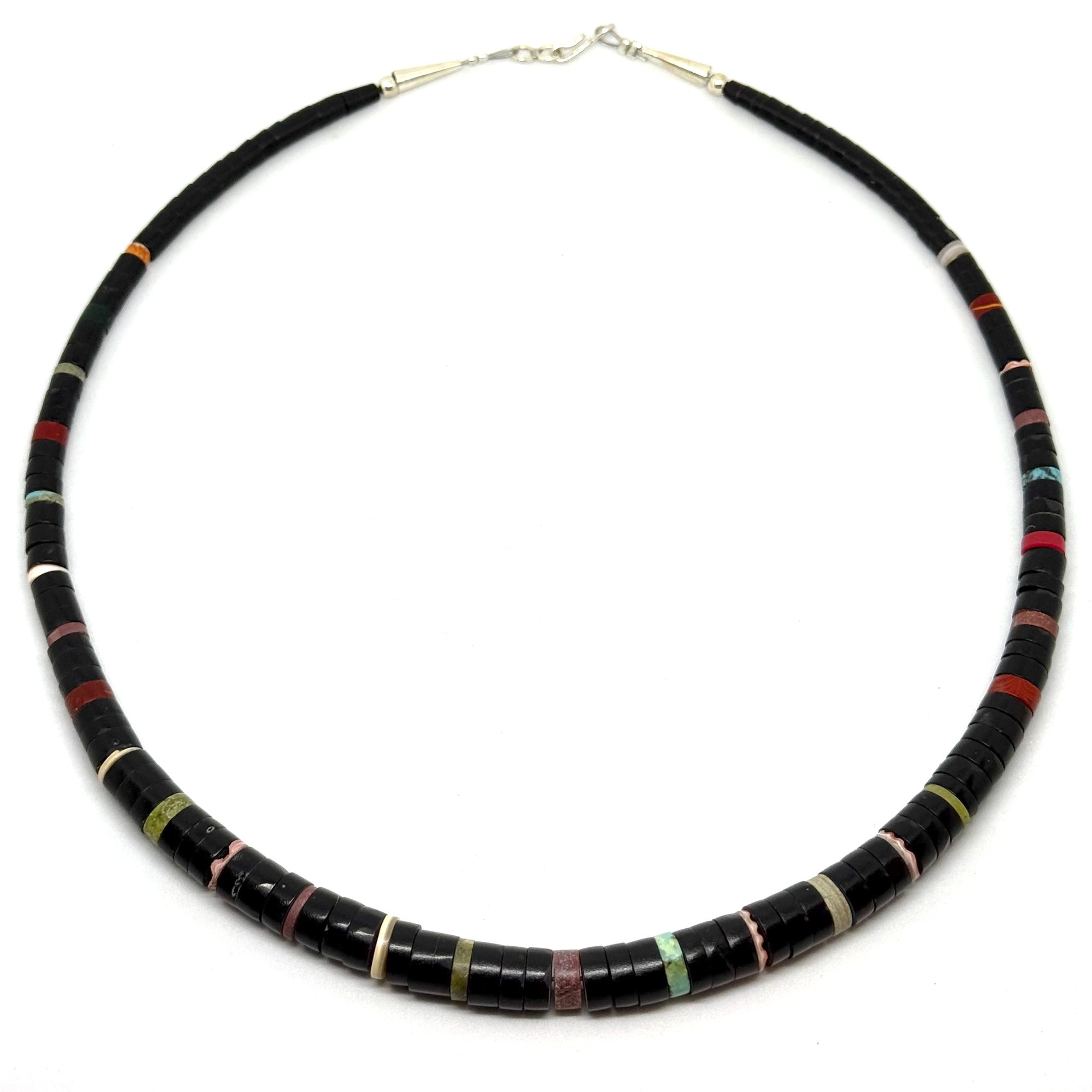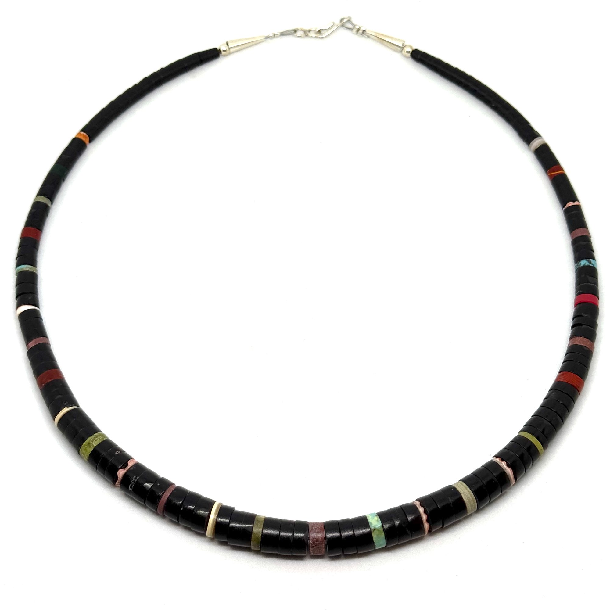Wow. This fantastic necklace by Santo Domingo Pueblo artist Chery Crespin features heishi disc beads made from black jet accented with bright turquoise, earthy pipestone, green serpentine, red coral, and more. It is graduated, with the largest discs measuring .5" wide. The necklace measures 21" long with an easy lobster clasp closure.