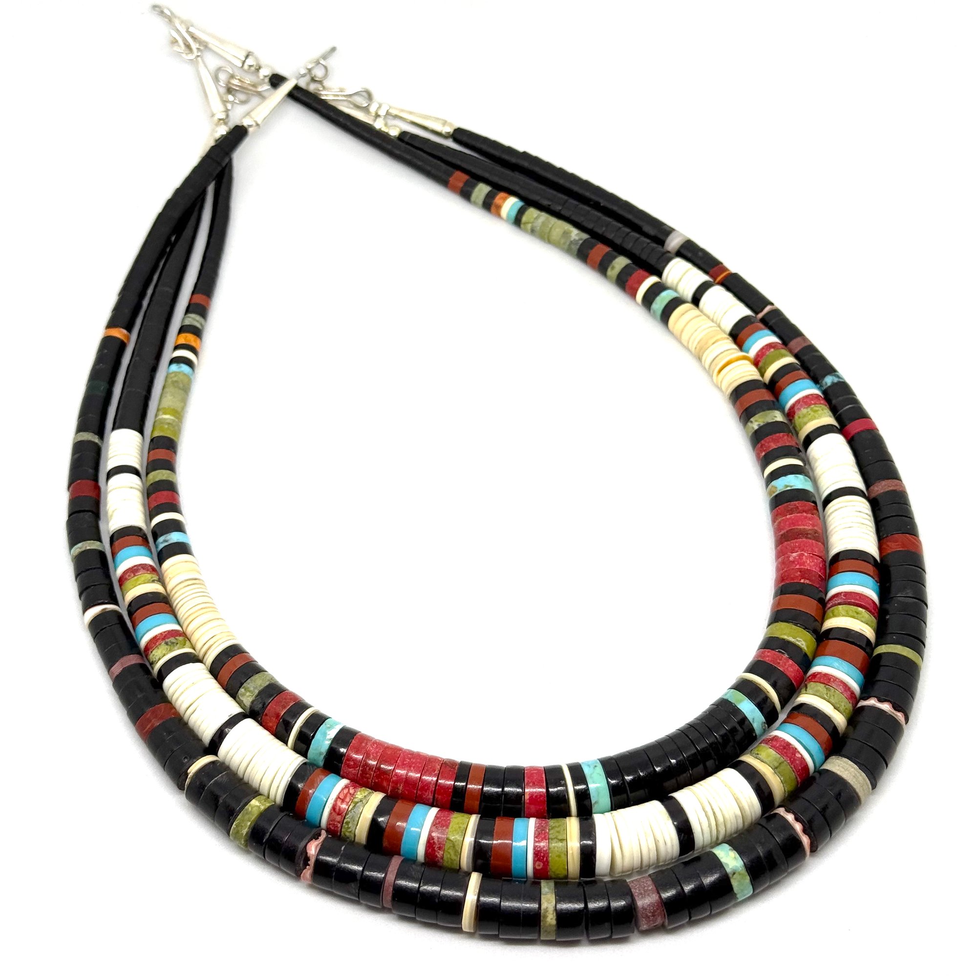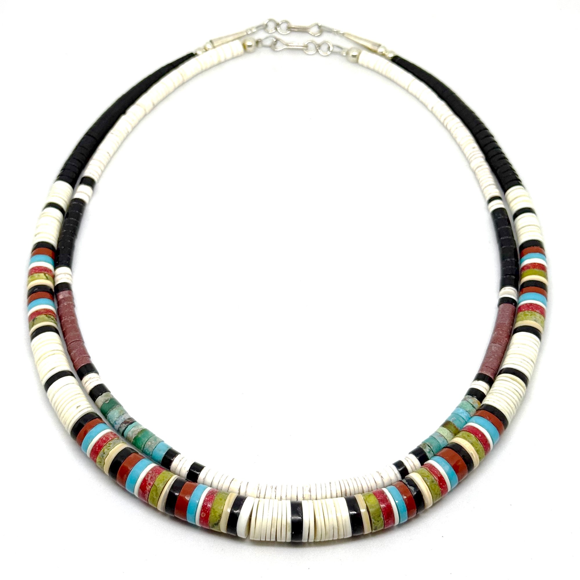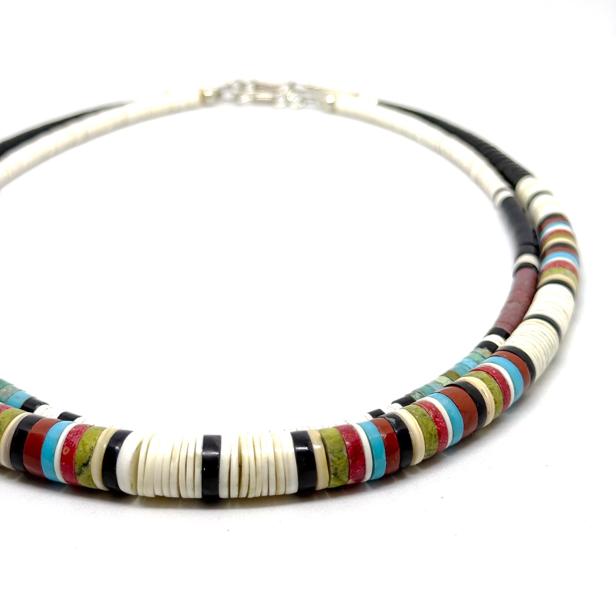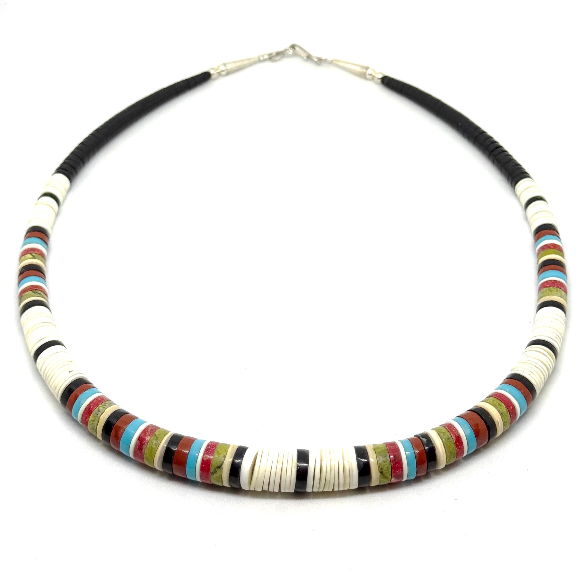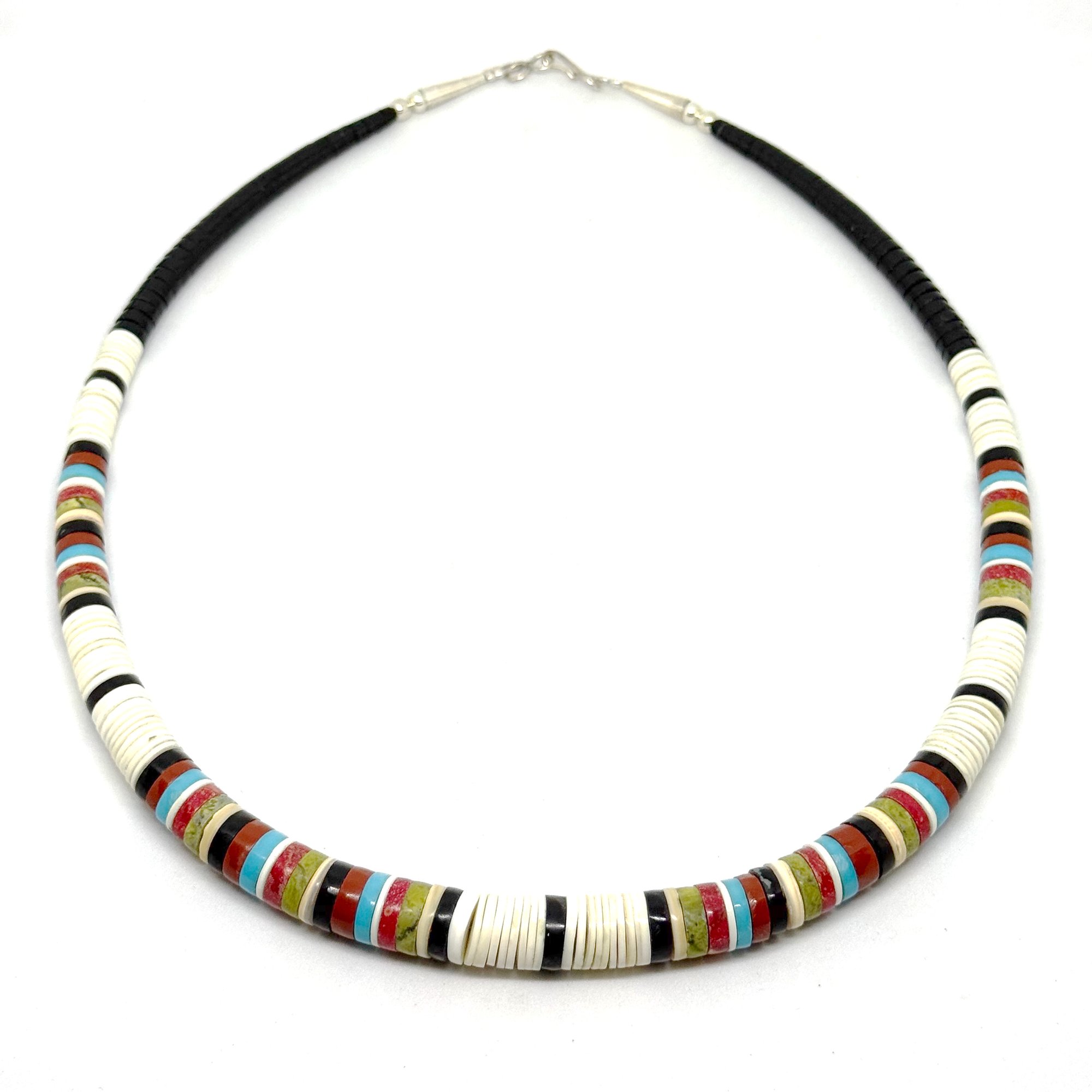 Wow. This spectacular necklace by Santo Domingo Pueblo artist Dorene Calabaza features heishi disc beads made from white shell, black jet, bright turquoise, green serpentine, earthy pipestone, and red coral. It is graduated, with the largest discs measuring .5" wide. The necklace measures 20" long with an easy lobster clasp closure.