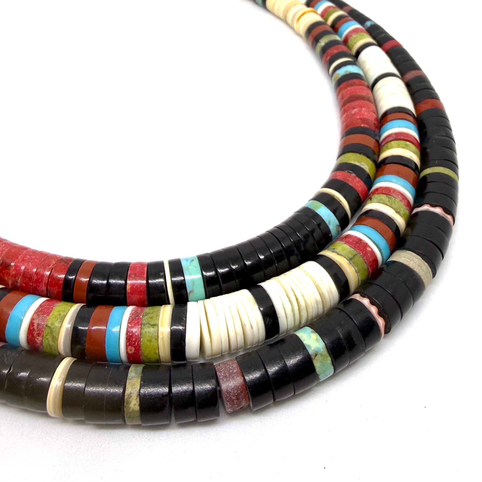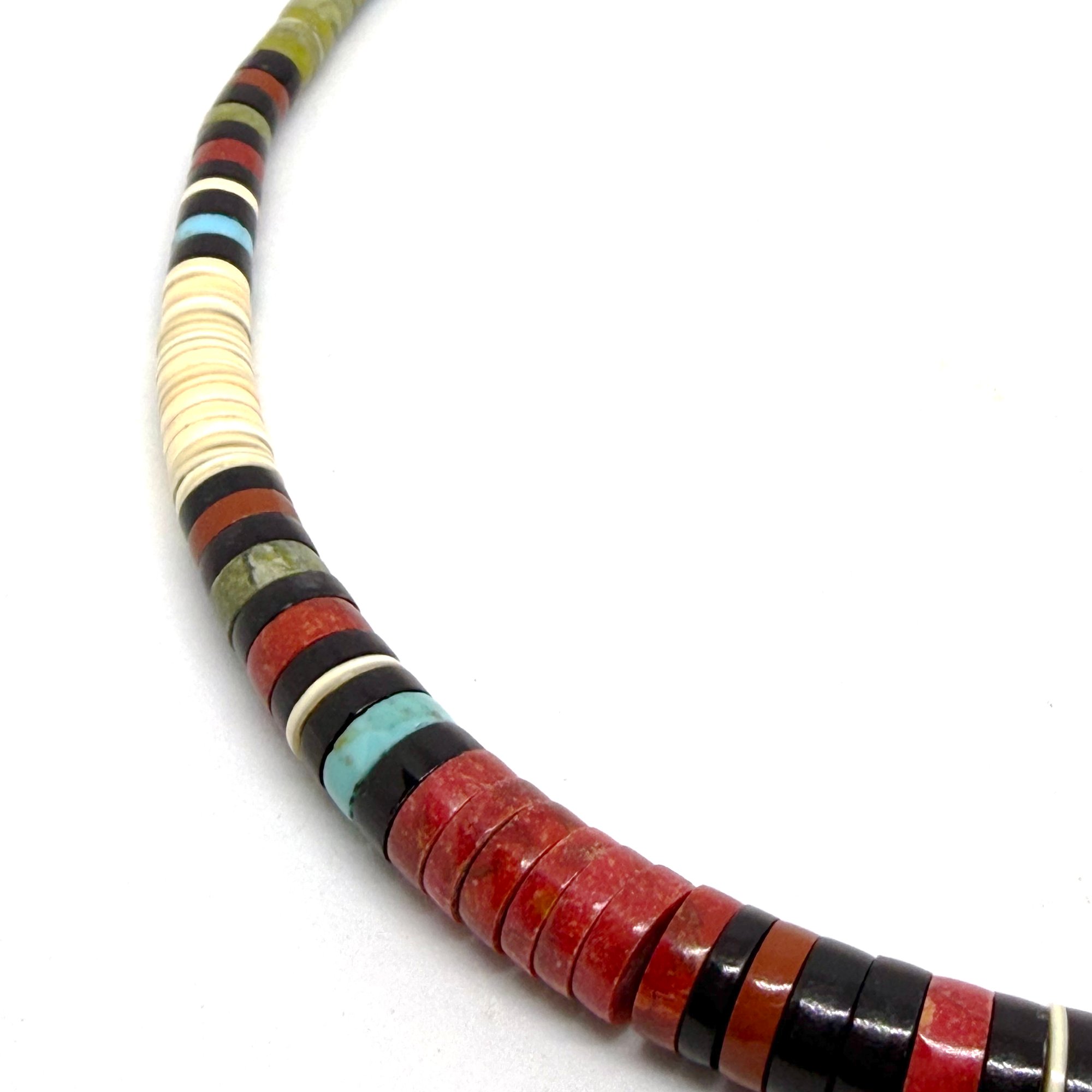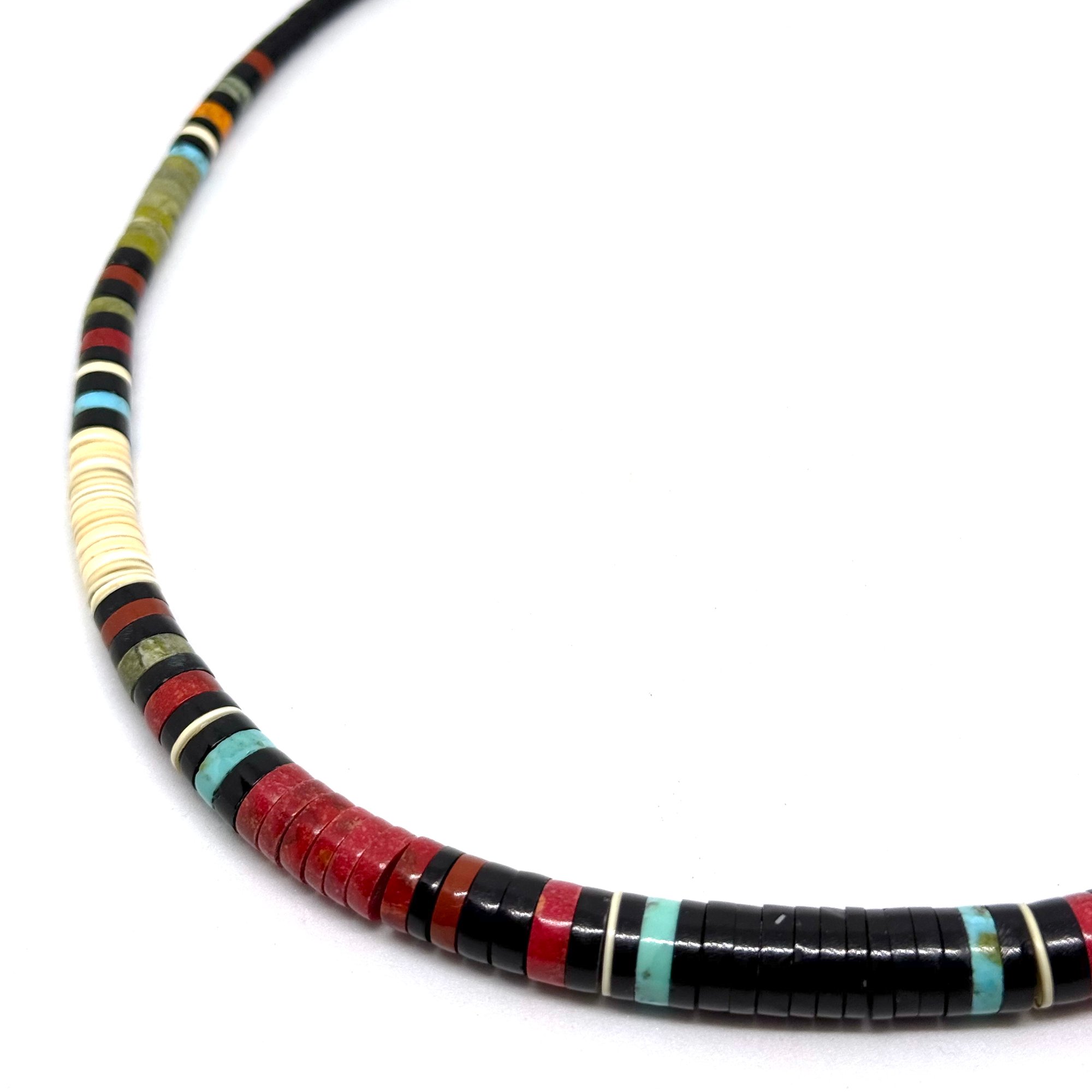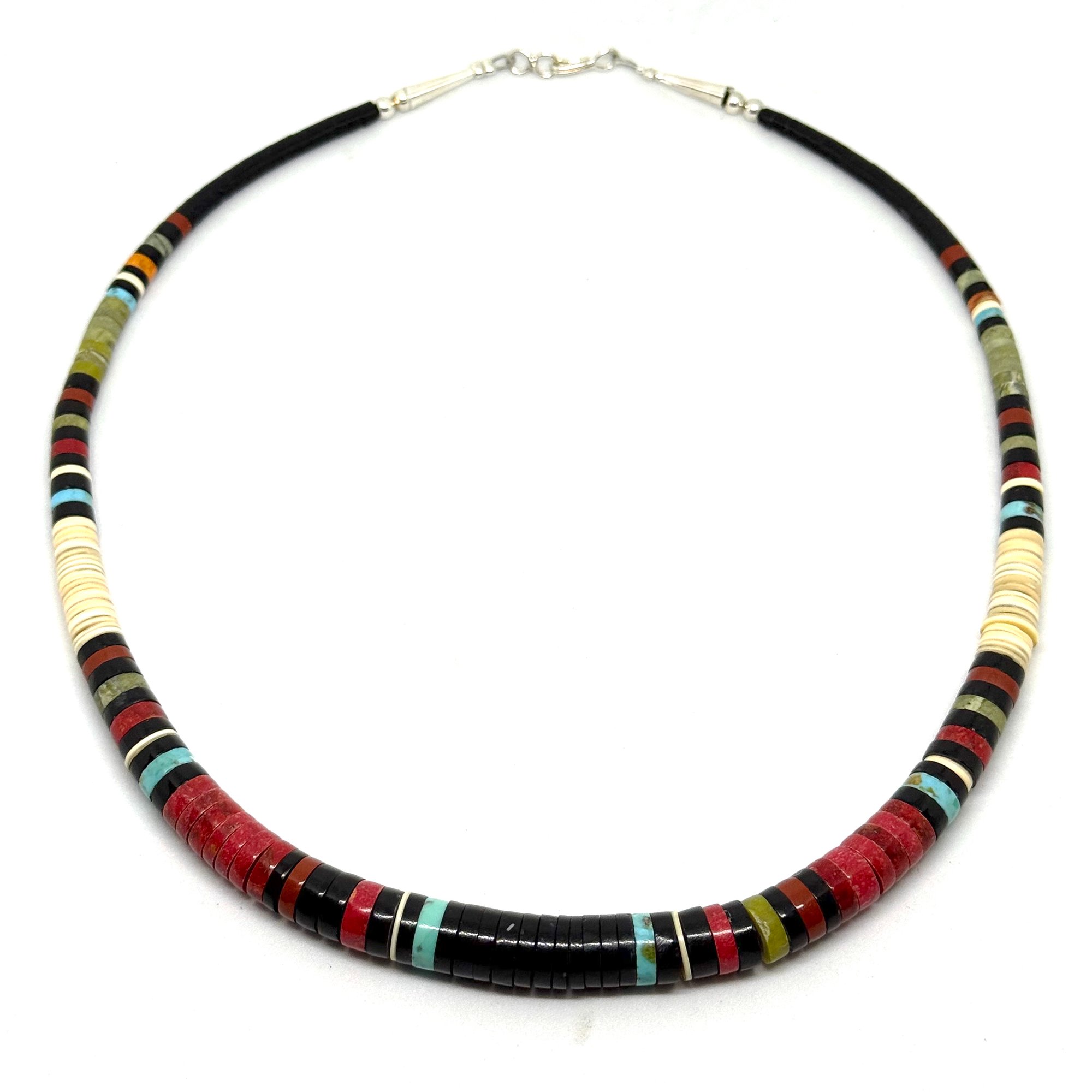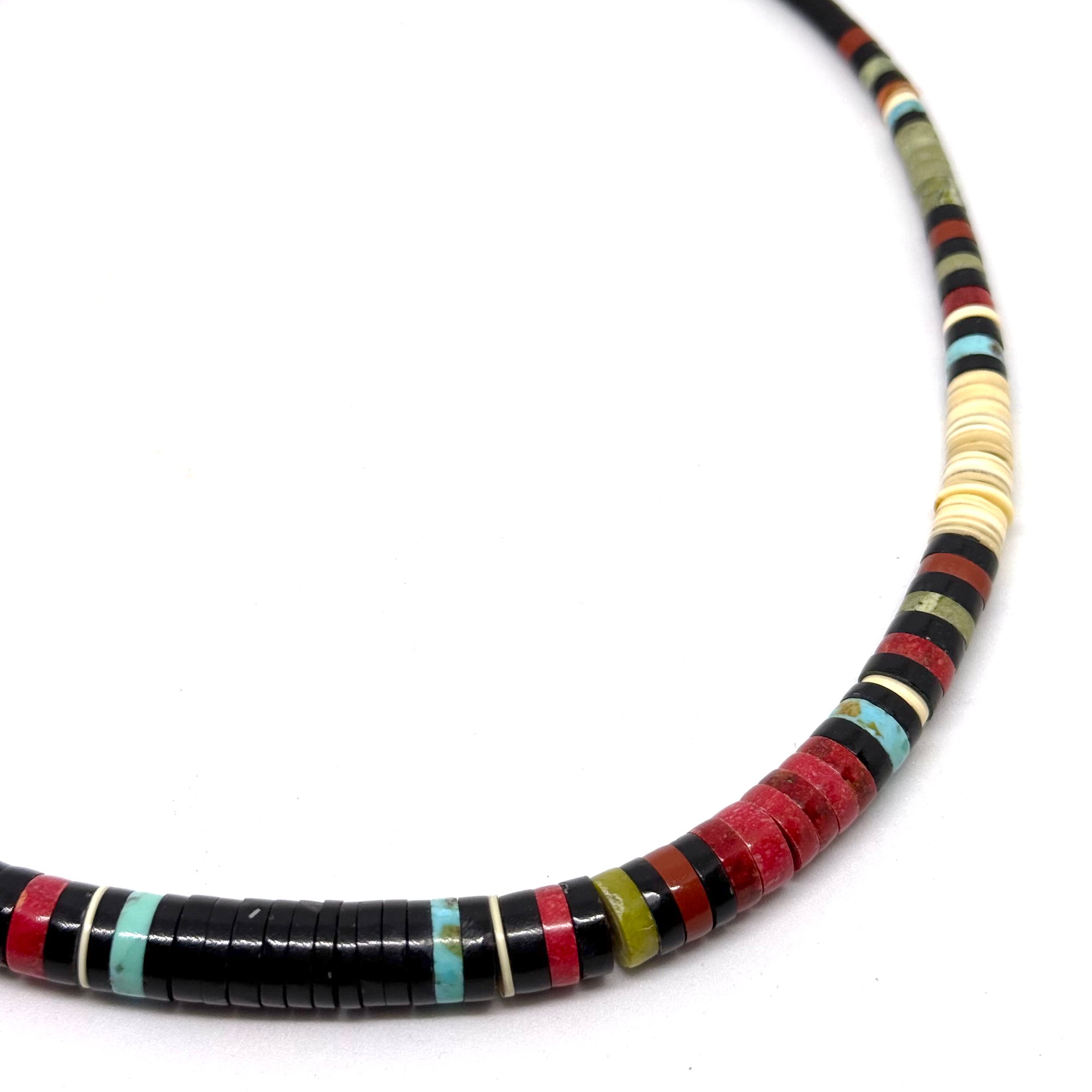 Wow. This spectacular necklace by Santo Domingo Pueblo artist Dorene Calabaza features heishi disc beads made from black jet, bright turquoise, rich red coral, melo shell, and green serpentine. It is graduated, with the largest discs measuring .5" wide. The necklace measures 20" long with an easy lobster clasp closure.