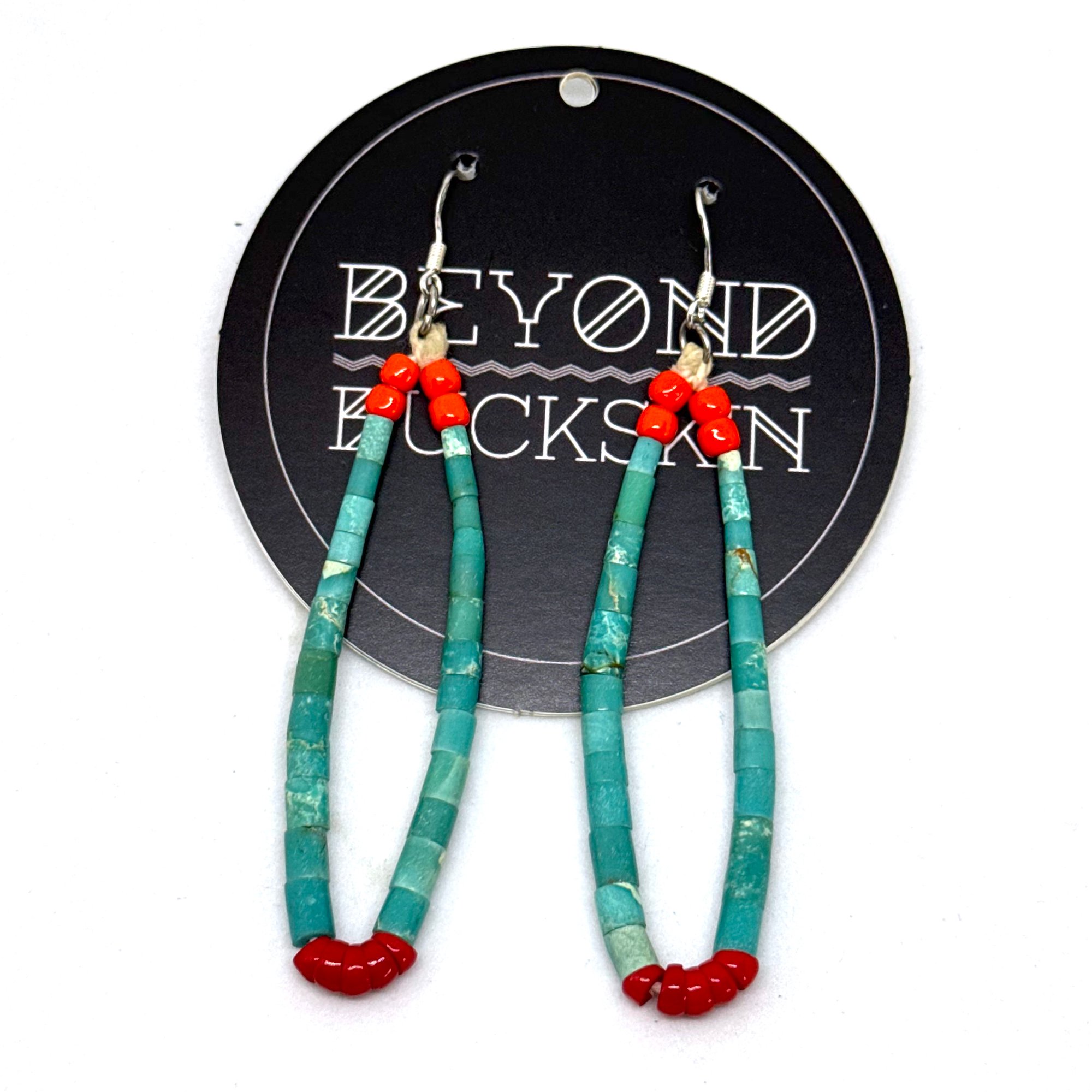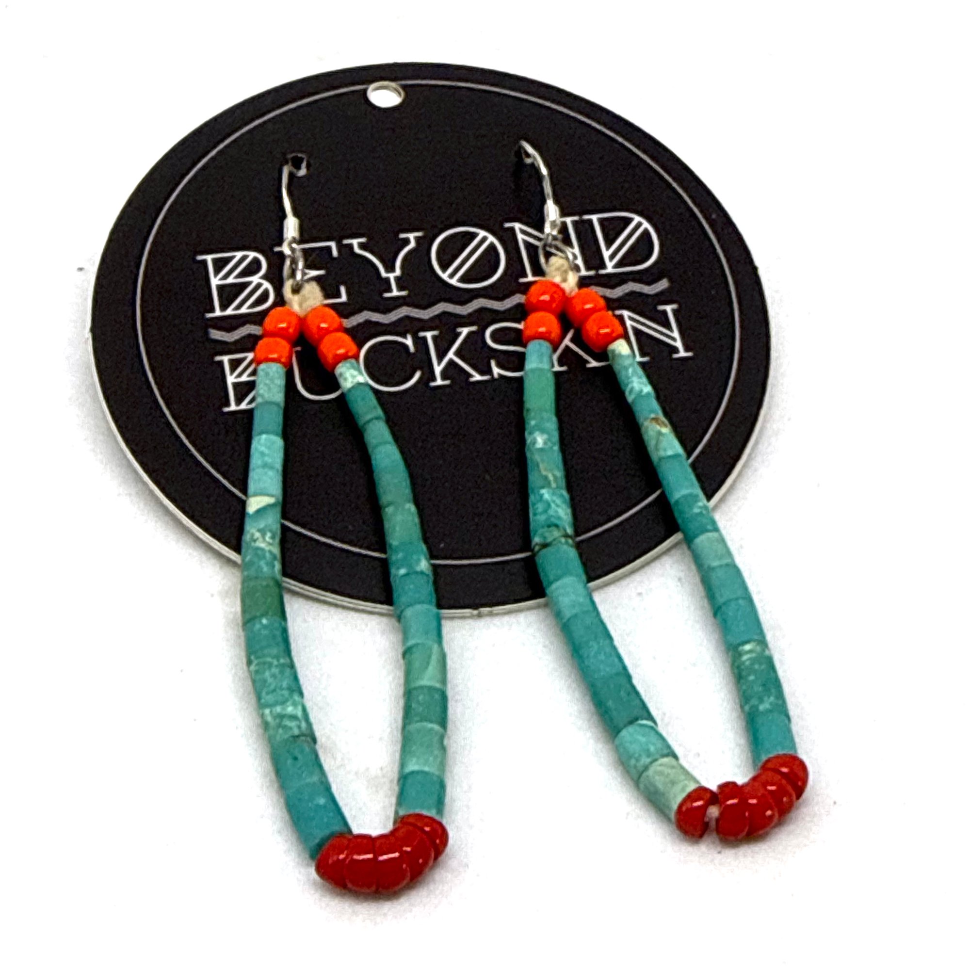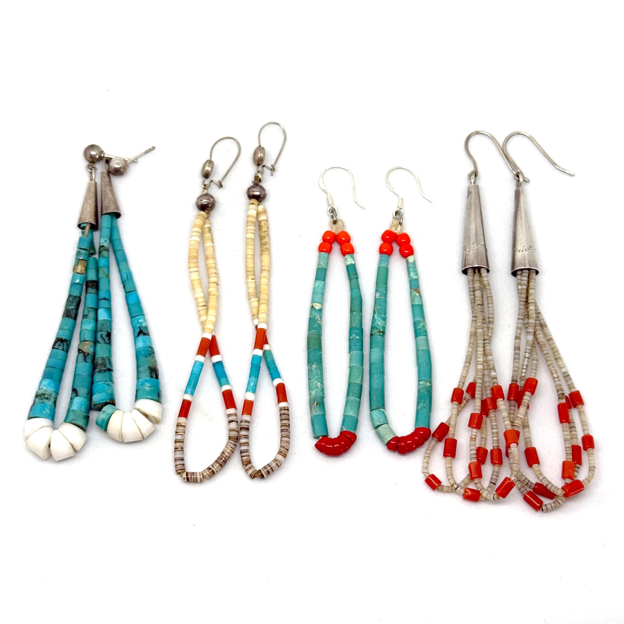Jacla earrings are traditional Native American dangle earrings, typically handmade by Santo Domingo or Navajo artisans, featuring loops of turquoise, coral, or tiny shell heishi beads. They are known for their sleek, refined and organic style.