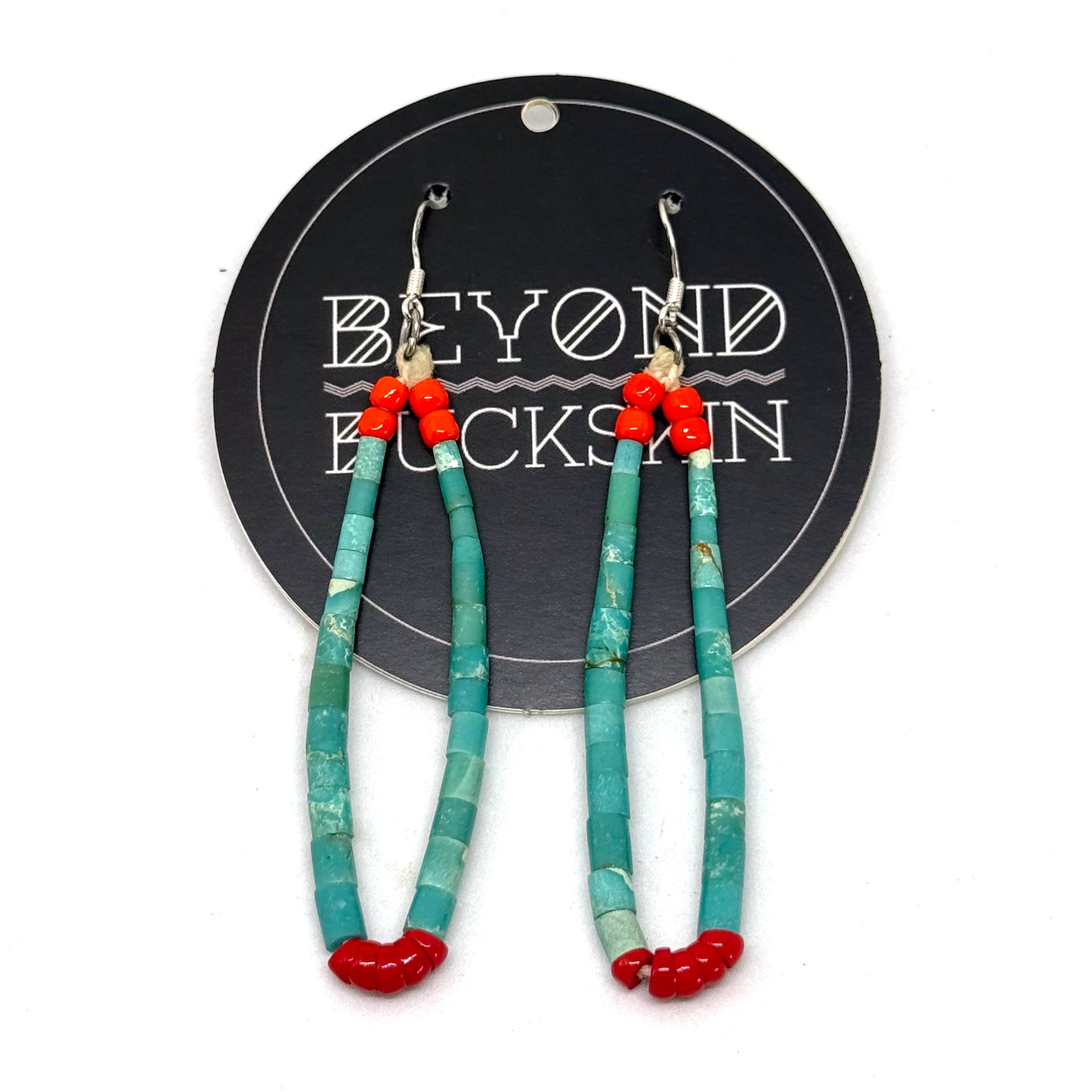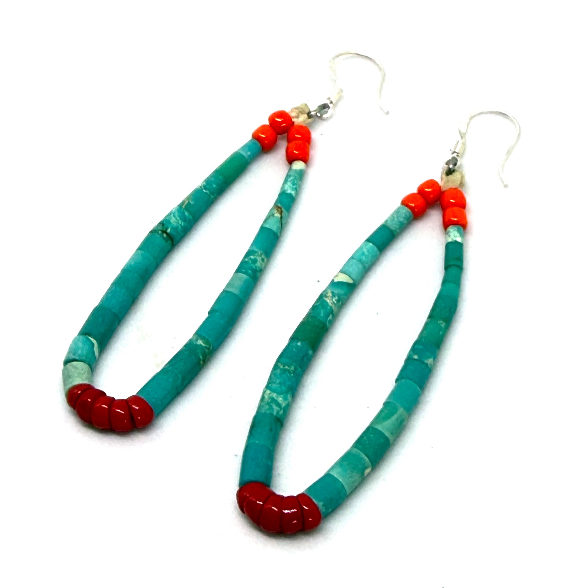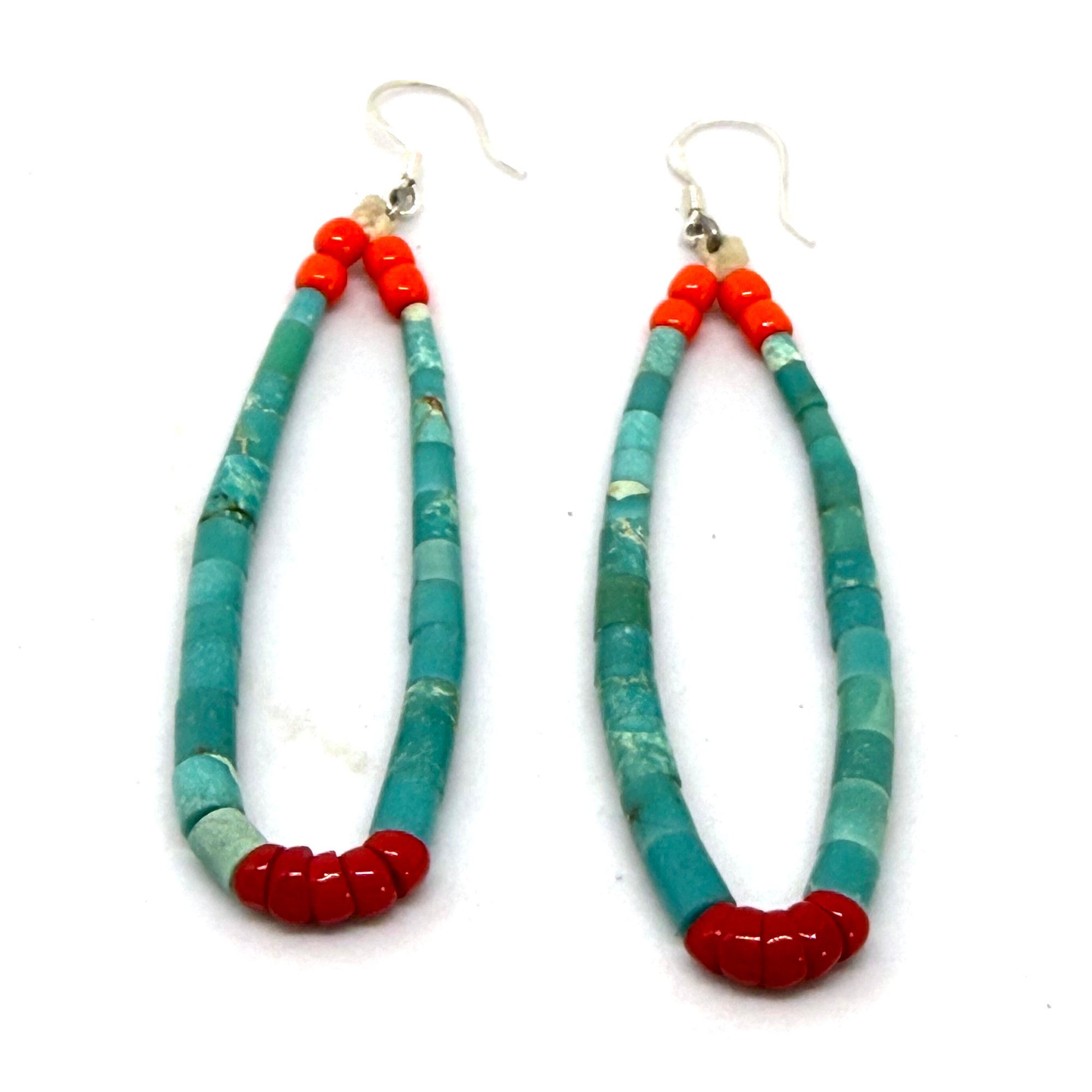 Jacla earrings are traditional Native American dangle earrings, typically handmade by Santo Domingo or Navajo artisans, featuring loops of turquoise, coral, or tiny shell heishi beads. They are known for their sleek, refined and organic style.
