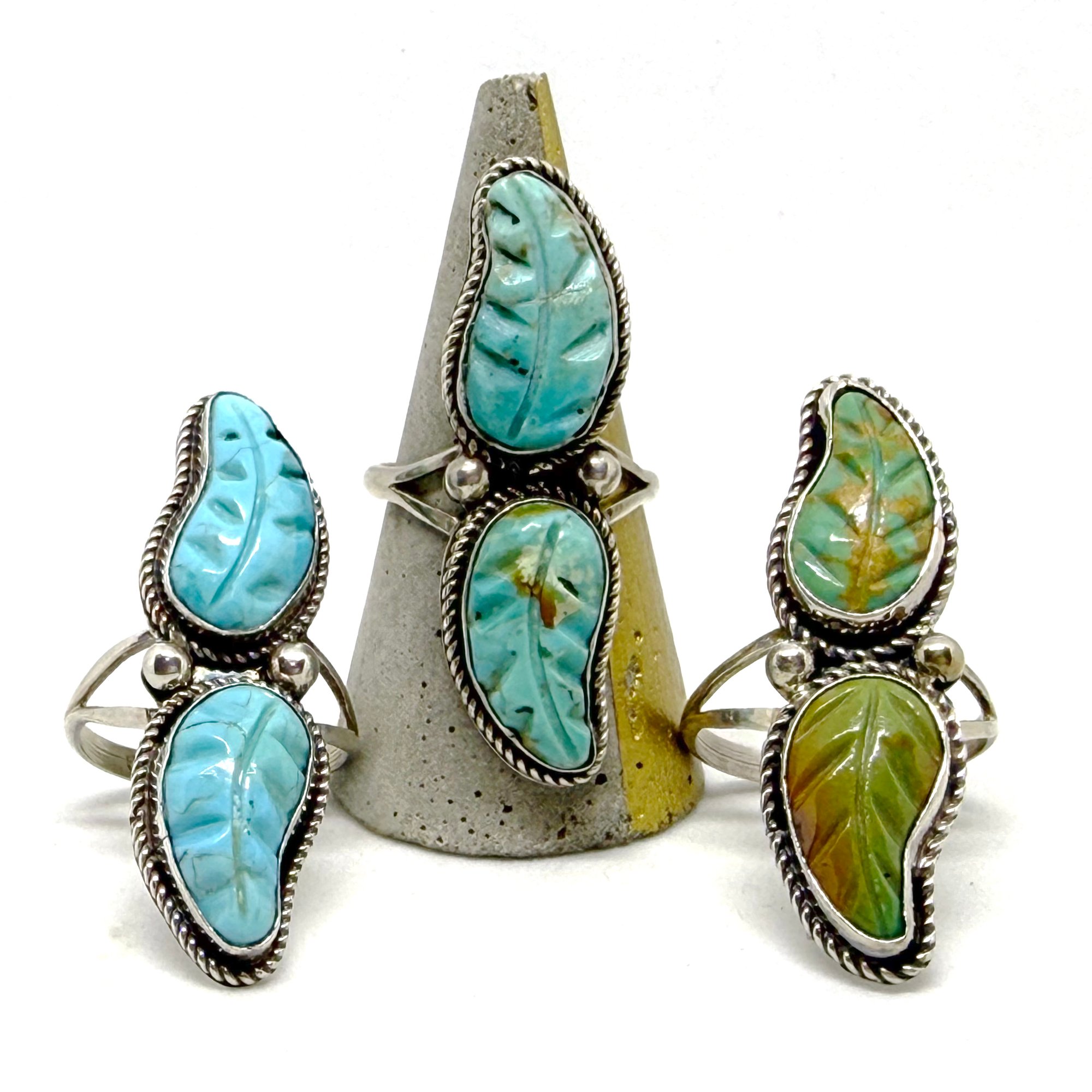 This elegant statement ring by Navajo artist Robin Wood features two handcarved turquoise leaves set in sterling silver. The face of the ring measures 1.75" by .75" wide.