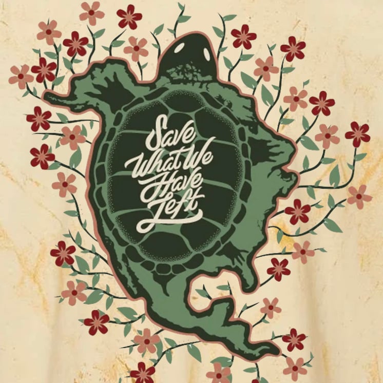 It features a rendition of Turtle Island, the popular Native American name for North America, which encompasses Canada, the US, and Mexico. Prior to European contact, Native Nations traded freely up and down and across turtle's back. According to many Creation stories, Sky Woman fell from above, landing on turtle's back, which was surrounded by a vast ocean. Muskrat dove below to grab a small bit of dirt from the ocean floor, brought it above, placed it on turtle's back, and this small bit grew to form what we now call North America.